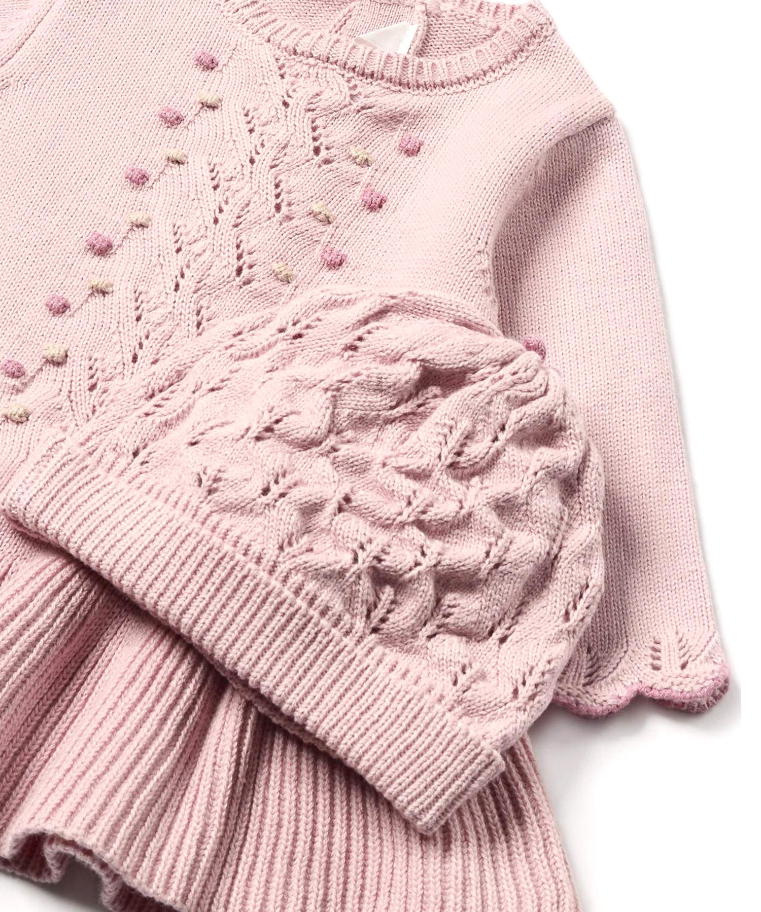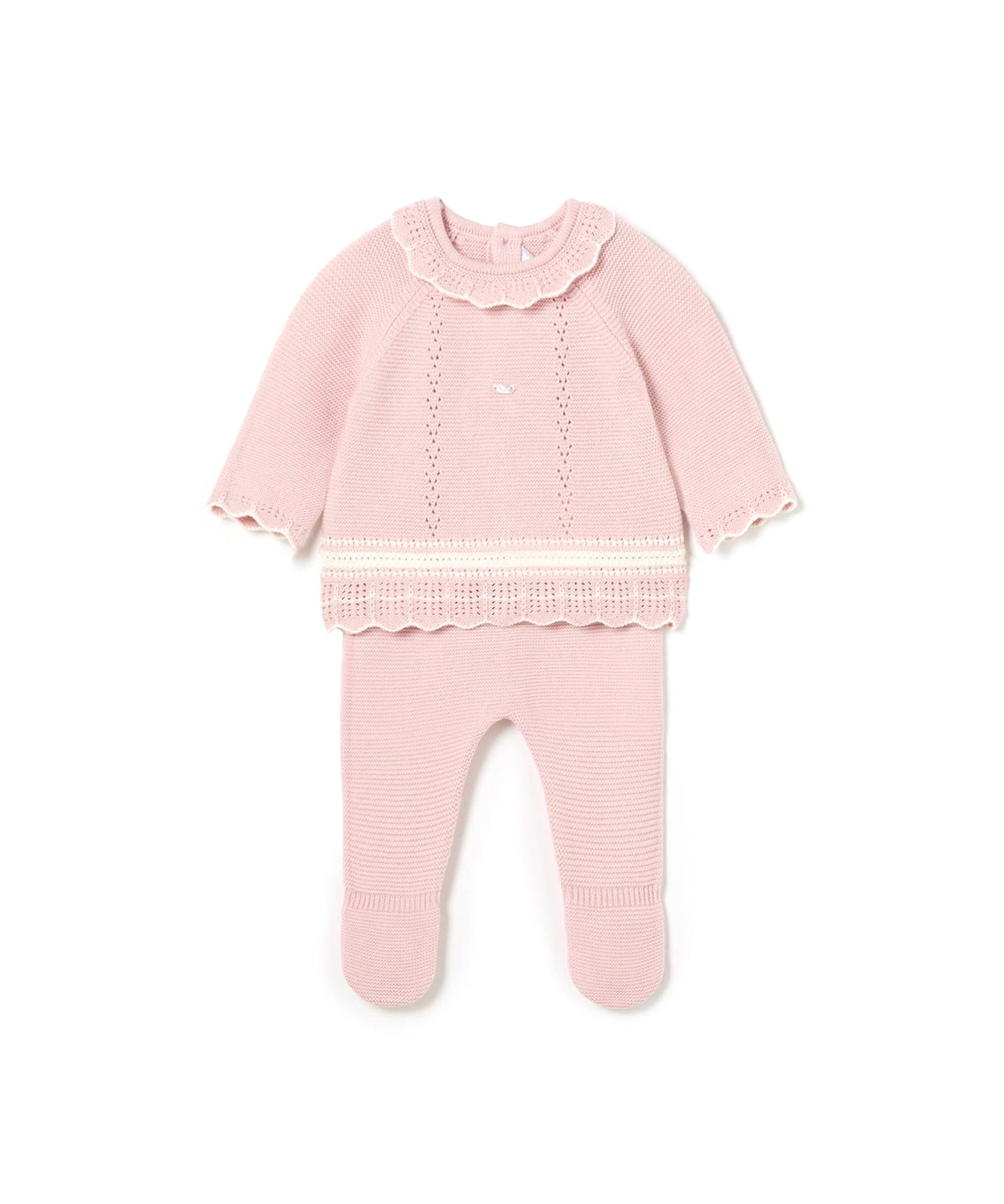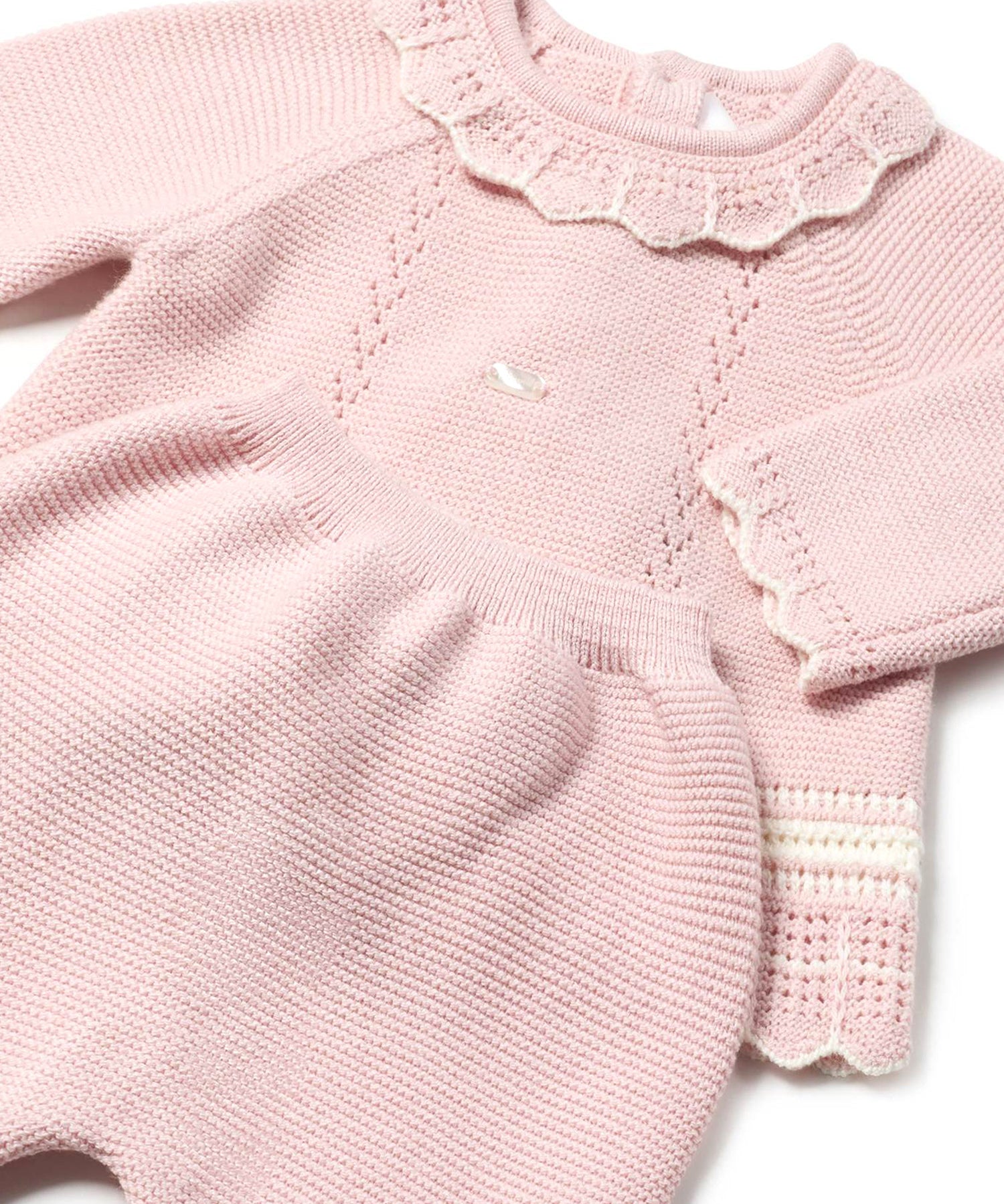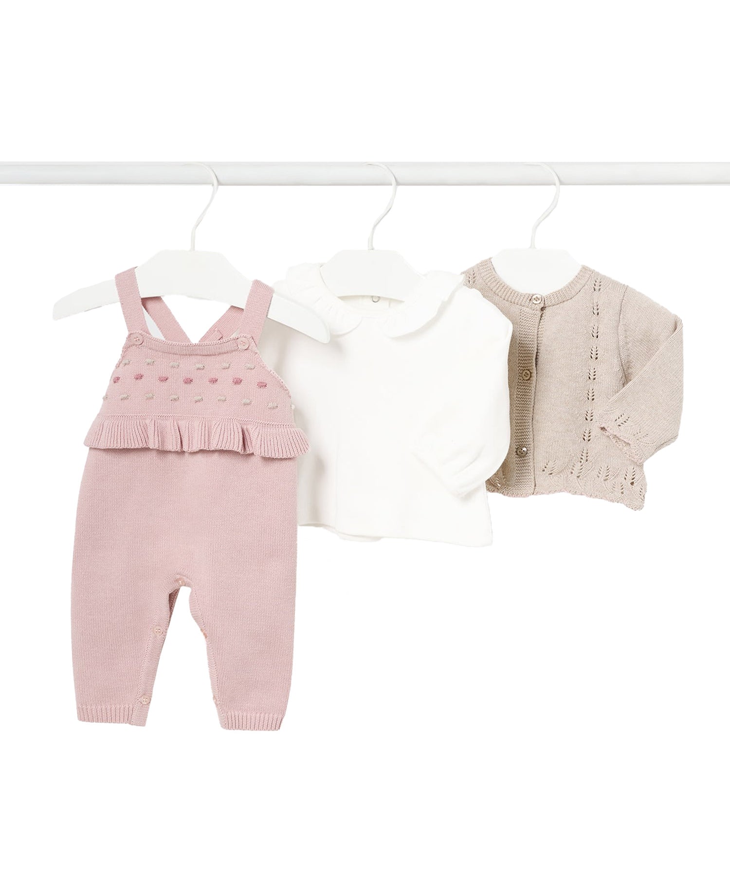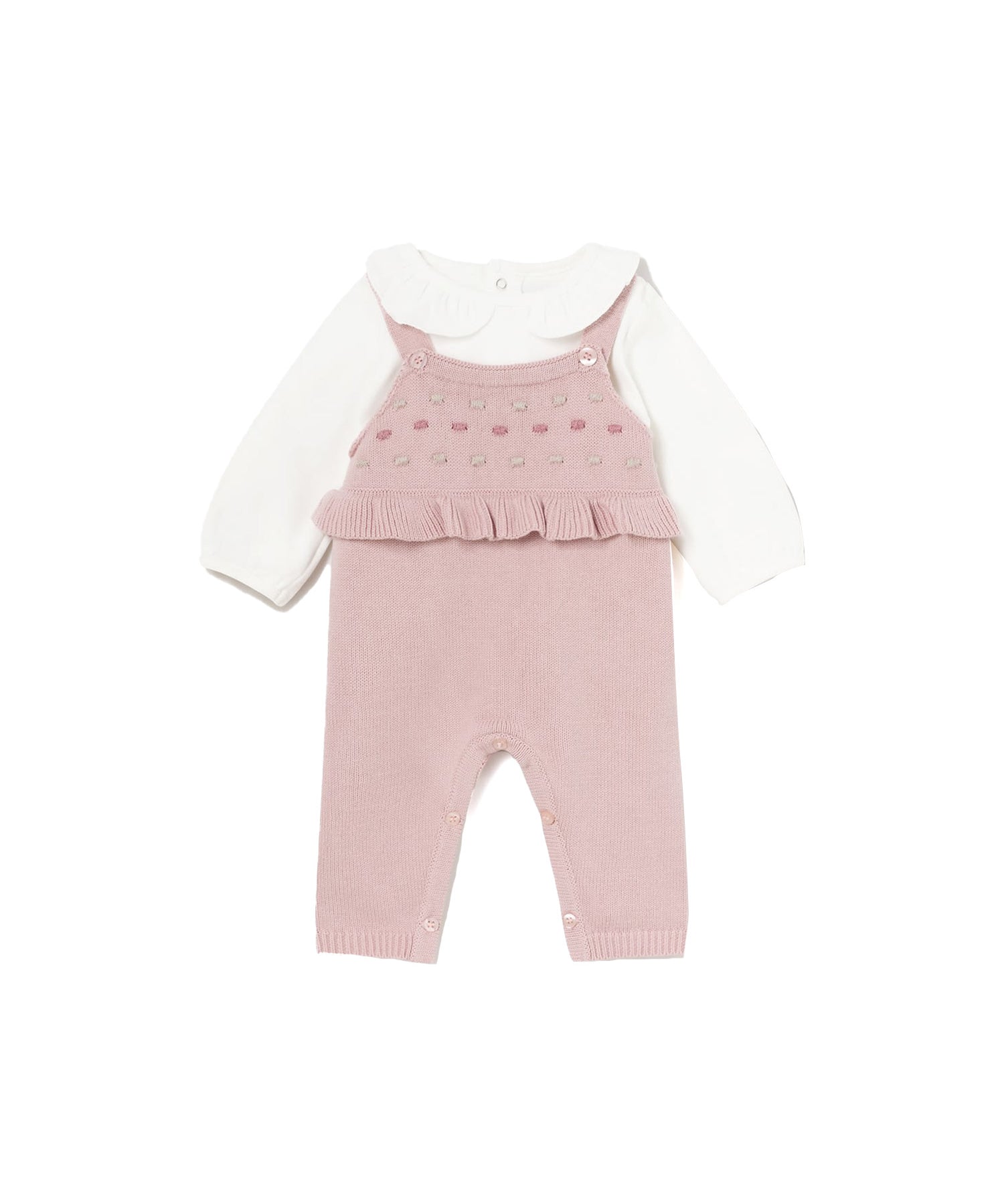 Completo tre pezzi salopette, maglia e cardigan rosa multi