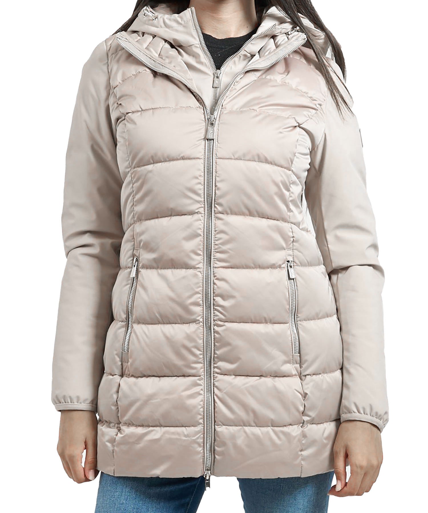 Piumino lungo parka Yes Zee donna con cappuccio e finto gilet removibile avorio
