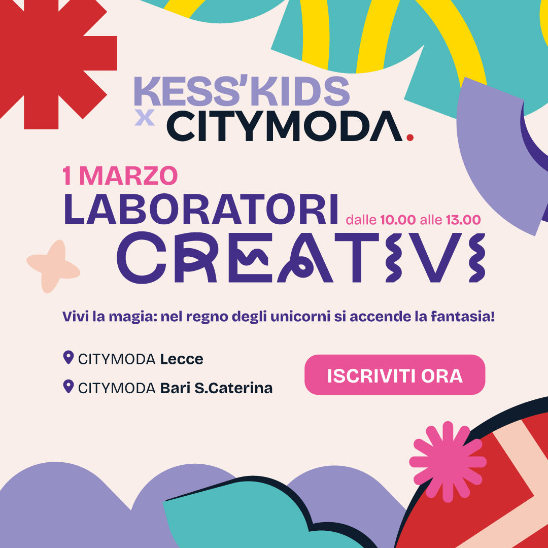 Domenica 1 marzo arriva KESS’KIDS x CityModa: un laboratorio creativo pensato per bimbi dai 3 ai 10 anni. Un’insegnante esperta guiderà ogni partecipante nel Regno degli Unicorni, tra colori, decorazioni e dettagli scintillanti, lasciando spazio alla fantasia per creare un lavoretto magico unico e speciale da portare a casa.