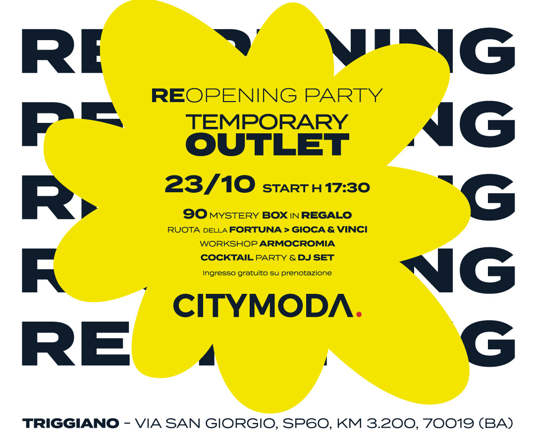 Lo store CityModa di Triggiano torna da giovedì 23 ottobre 2025 con un format mai visto: l’unico Temporary Outlet della Puglia, aperto solo per 90 giorni con le collezioni Autunno Inverno in sconto al 50%.