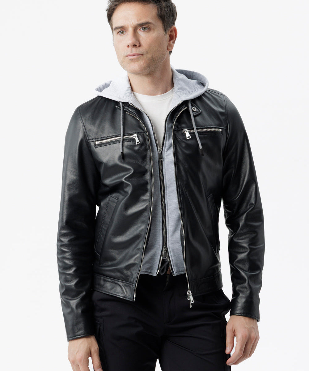 Giacca Biker in pelle con cappuccio Integrato nero