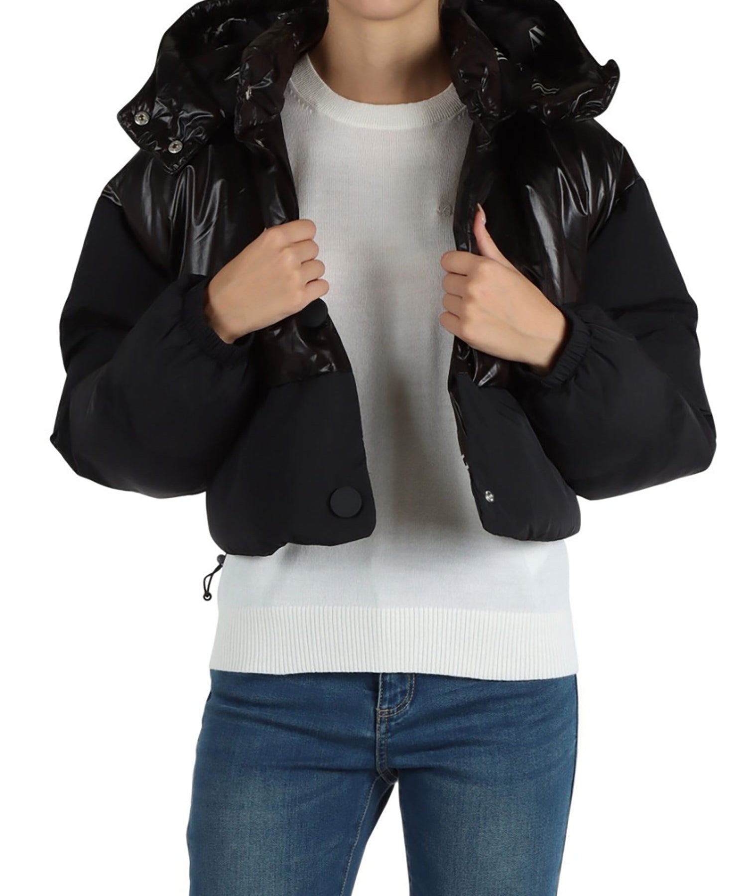 Piumino cropped con cappuccio mix lucido crinkle nero