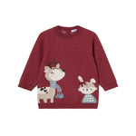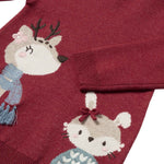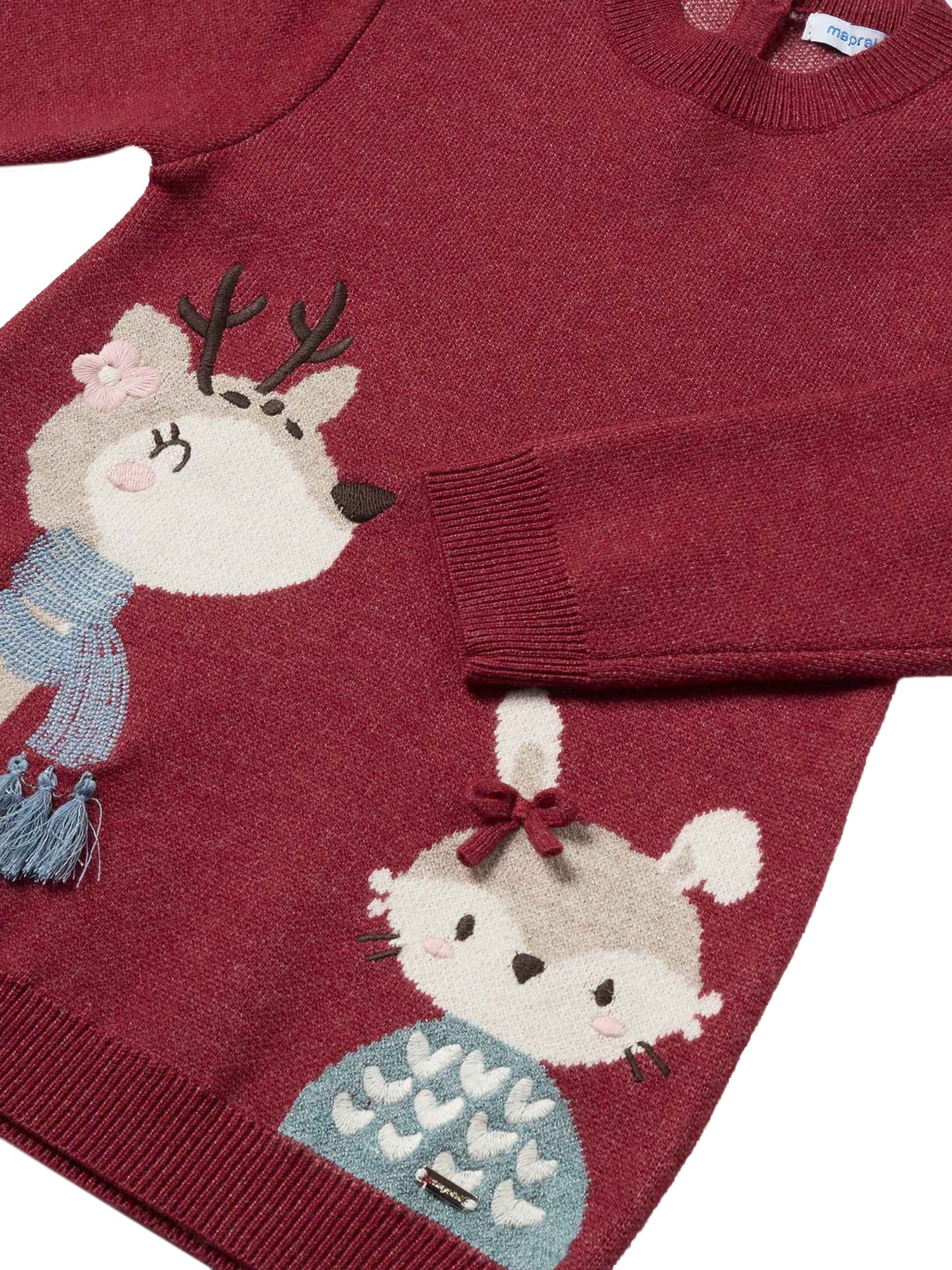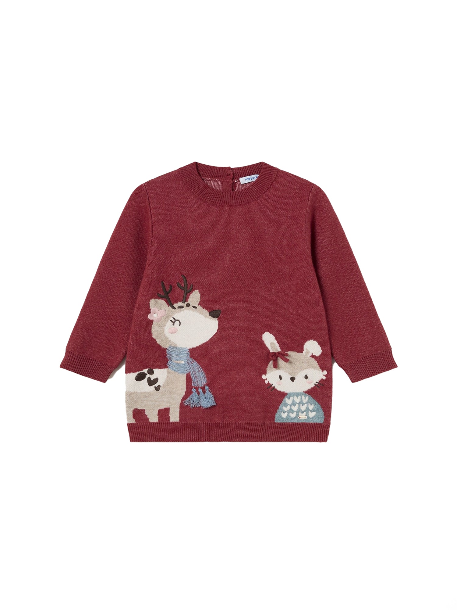 Abito in maglia Mayoral per neonata caratterizzato da un morbido tessuto rosso borgogna, ideale per le stagioni più fredde. La grafica sul davanti raffigura simpatici animali invernali, un cervo e un coniglio, decorati con dettagli colorati e motivi ricamati. La lavorazione a maglia del vestito e il bordo a coste donano un tocco caldo e accogliente, rendendolo perfetto per creare un look adorabile e confortevole.