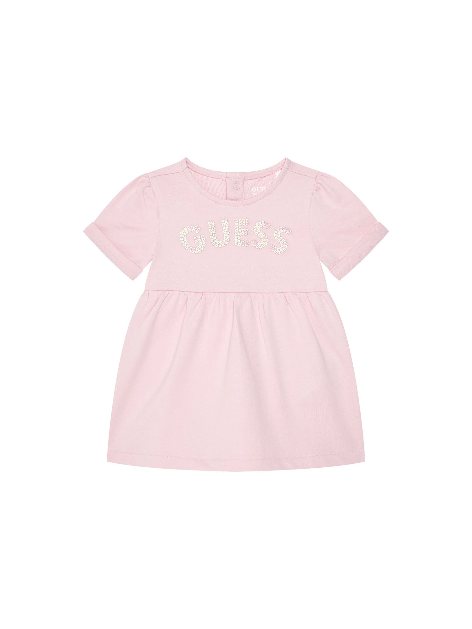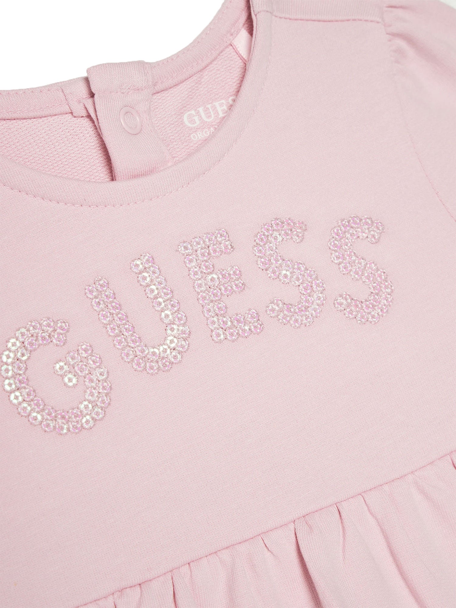 Un abito che unisce dolcezza e semplicità, perfetto per i primi look romantici della tua piccola. Realizzato in morbido cotone biologico, questo vestitino presenta un design essenziale ma impreziosito dal logo GUESS ricamato con paillettes brillanti tono su tono, per un tocco di luce delicato e raffinato. Le maniche corte con risvolto e la gonna leggermente arricciata completano un look comodo e delizioso, pensato per ogni giorno speciale.