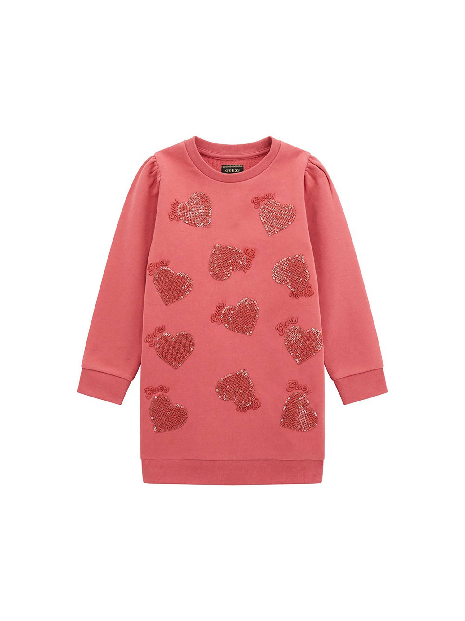 Abito manica lunga in felpa Guess bambina logo e cuori con paillettes peonia