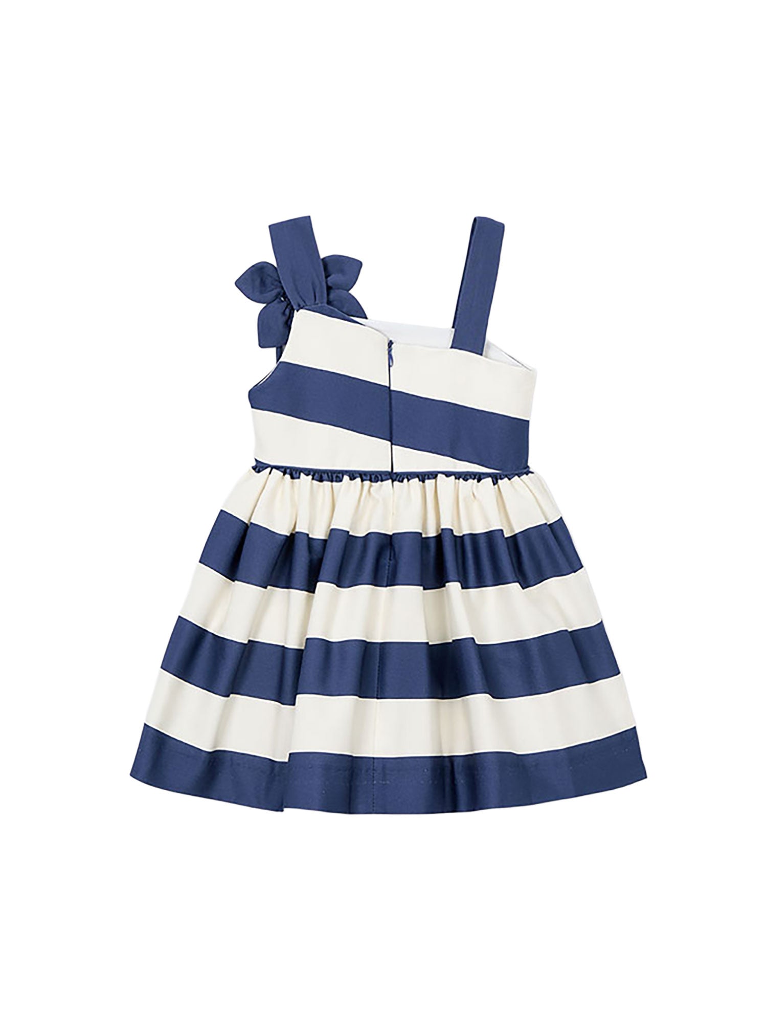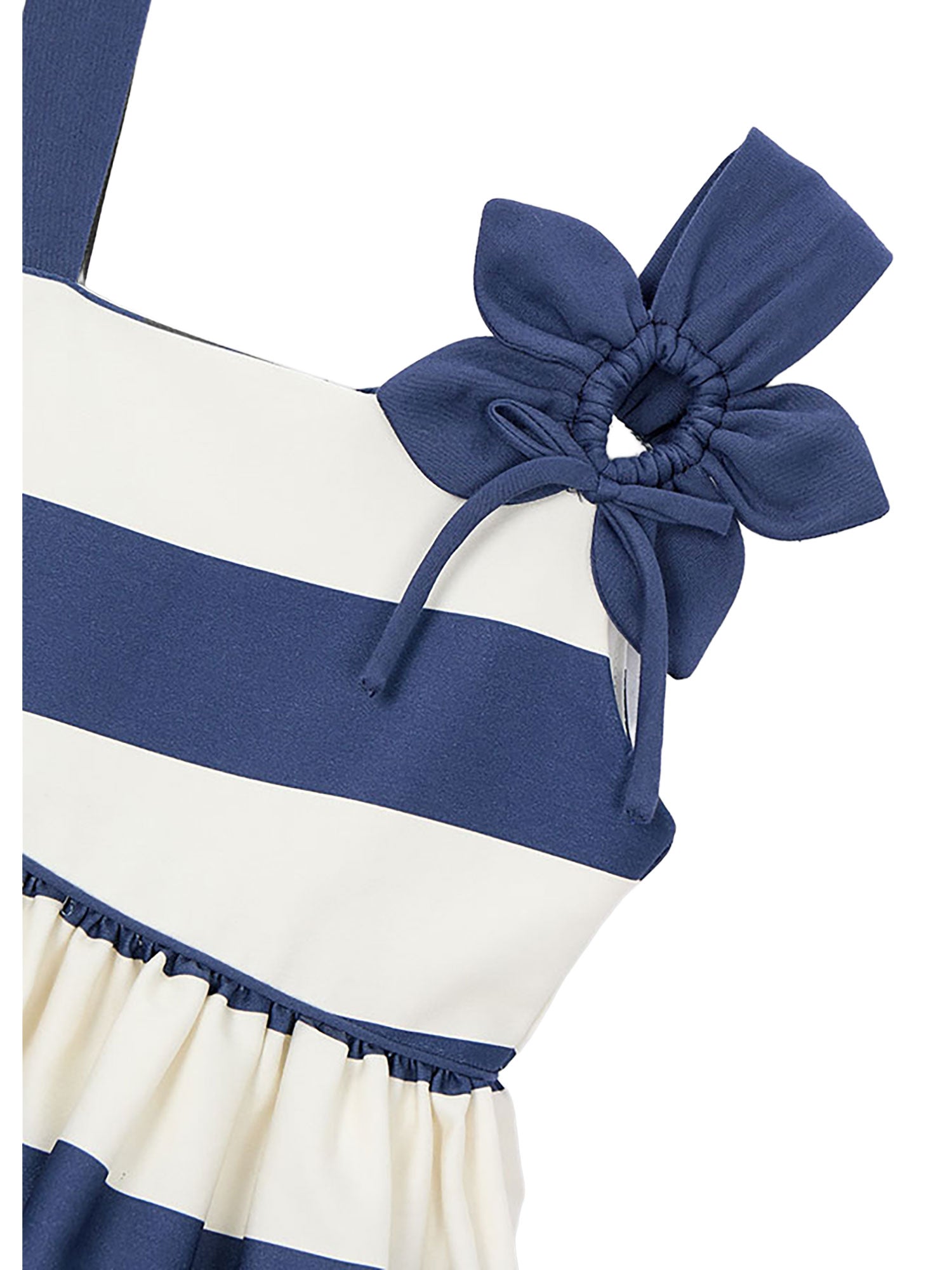 Elegante vestito Mayoral per bambina caratterizzato da un raffinato motivo a righe bianche e blu, ideale per occasioni speciali e cerimonie estive. Il design asimmetrico con una sola spallina è impreziosito da un grande fiore decorativo applicato sulla spalla che dona un tocco originale e sofisticato.