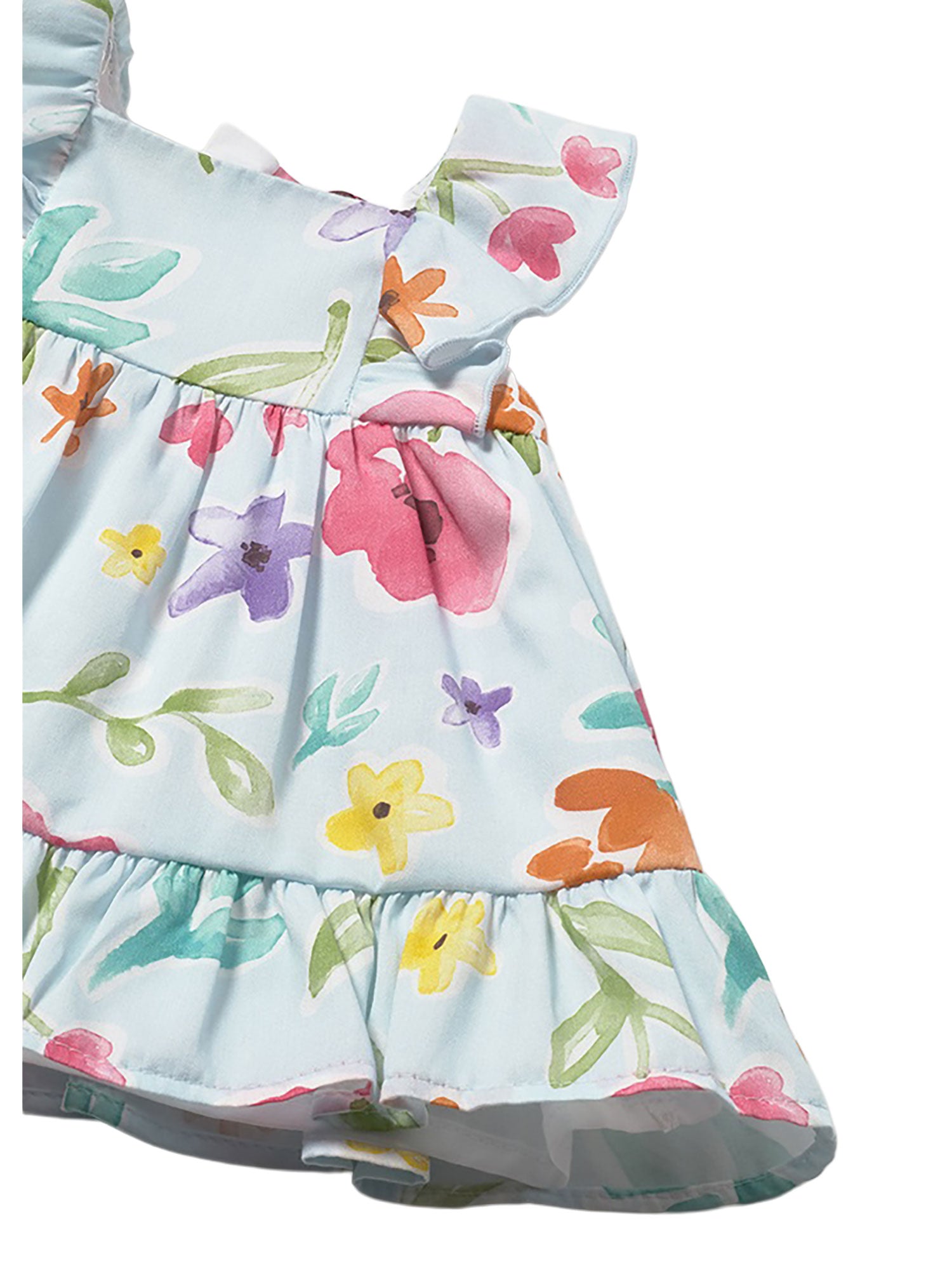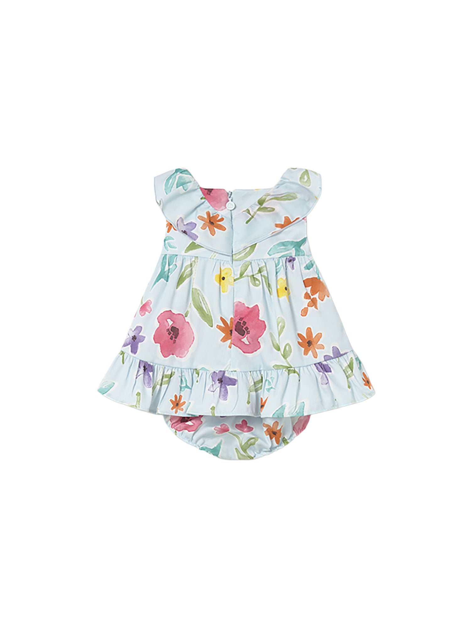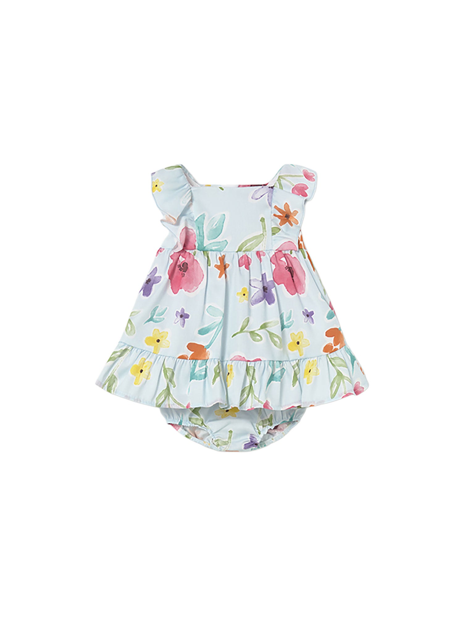 Delicato vestitino Mayoral per neonata con stampa floreale colorata, ideale per la stagione estiva. Il design con volant sulle spalle e la gonna arricciata dona un look dolce e raffinato, mentre la culotte coordinata completa l’outfit garantendo comfort e praticità.