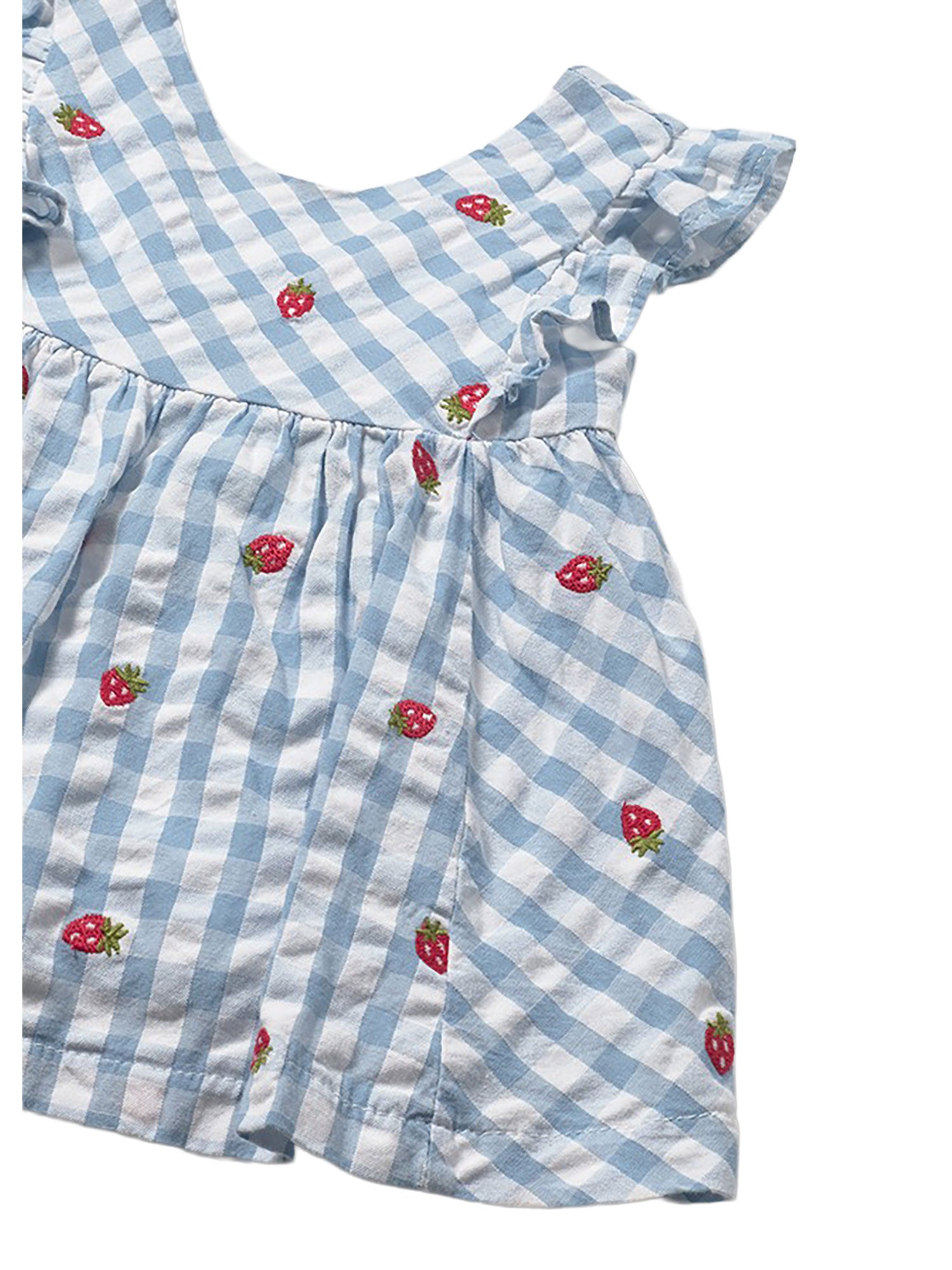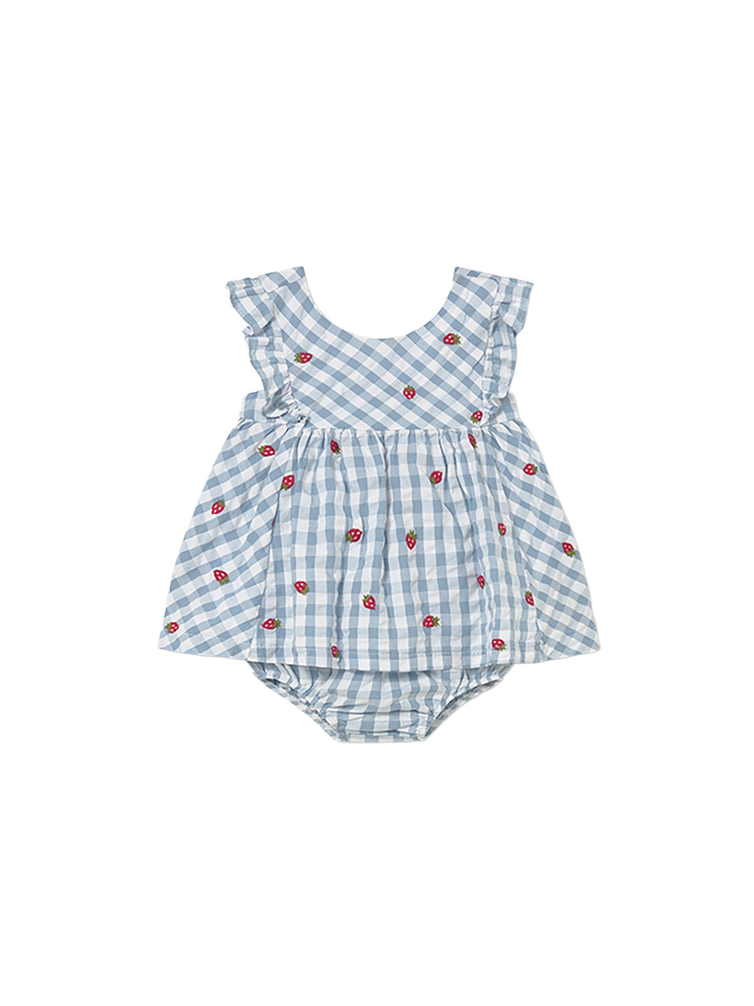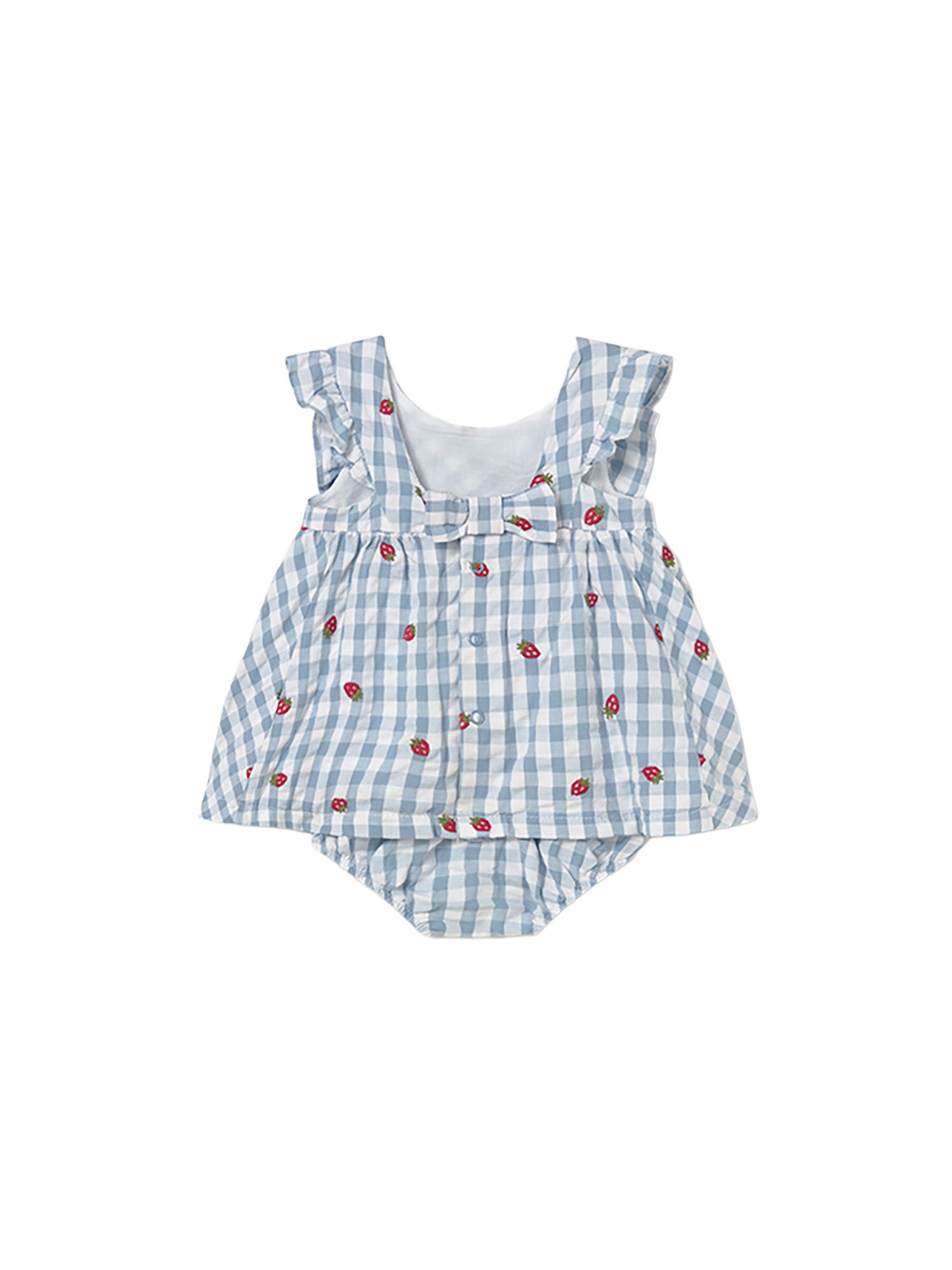 Delizioso vestitino Mayoral per neonata in tessuto leggero a quadretti azzurri con ricami di piccole fragole. Il design con volant sulle spalle e la culotte coordinata crea un outfit fresco, dolce e perfetto per la stagione estiva.