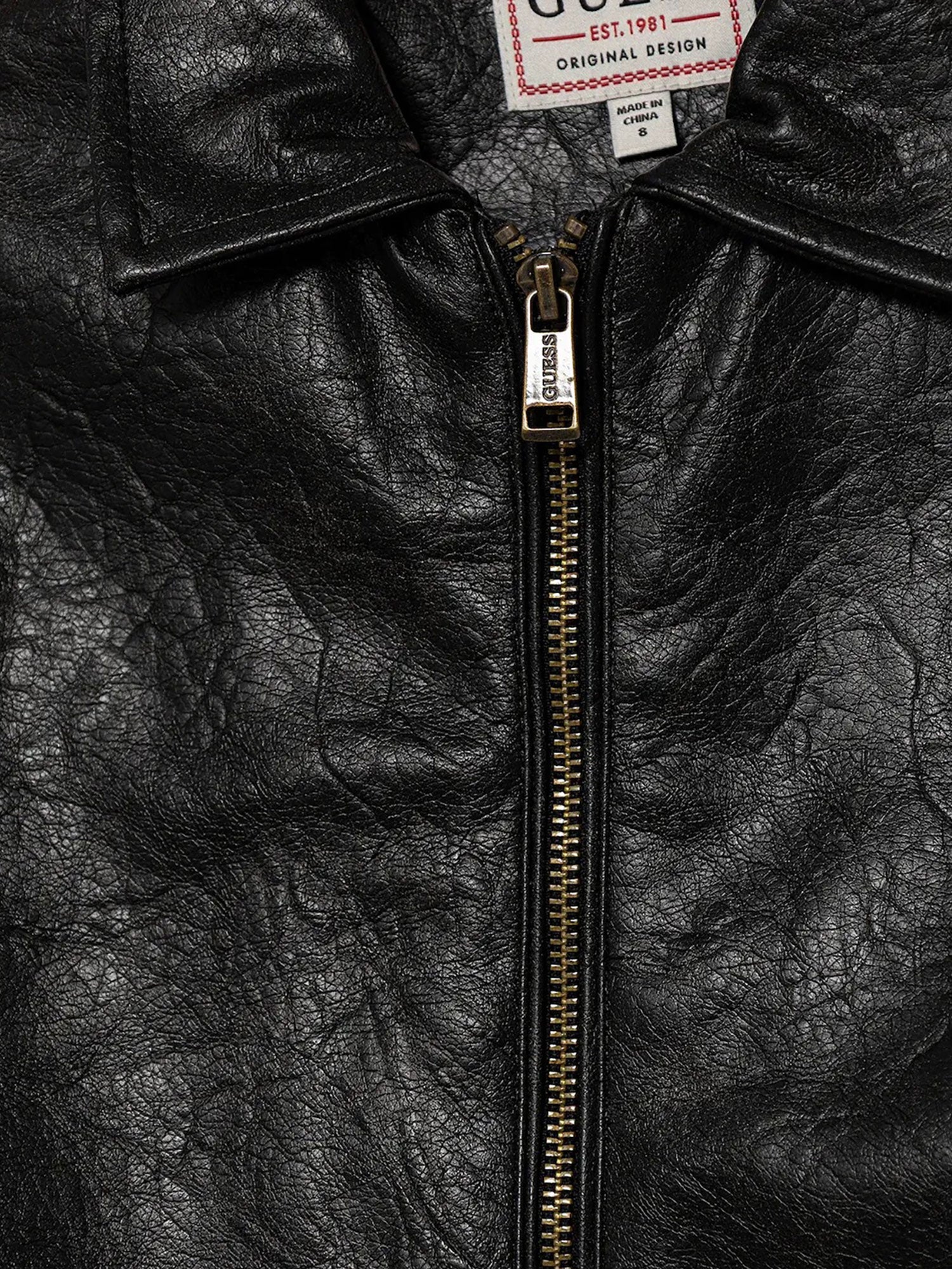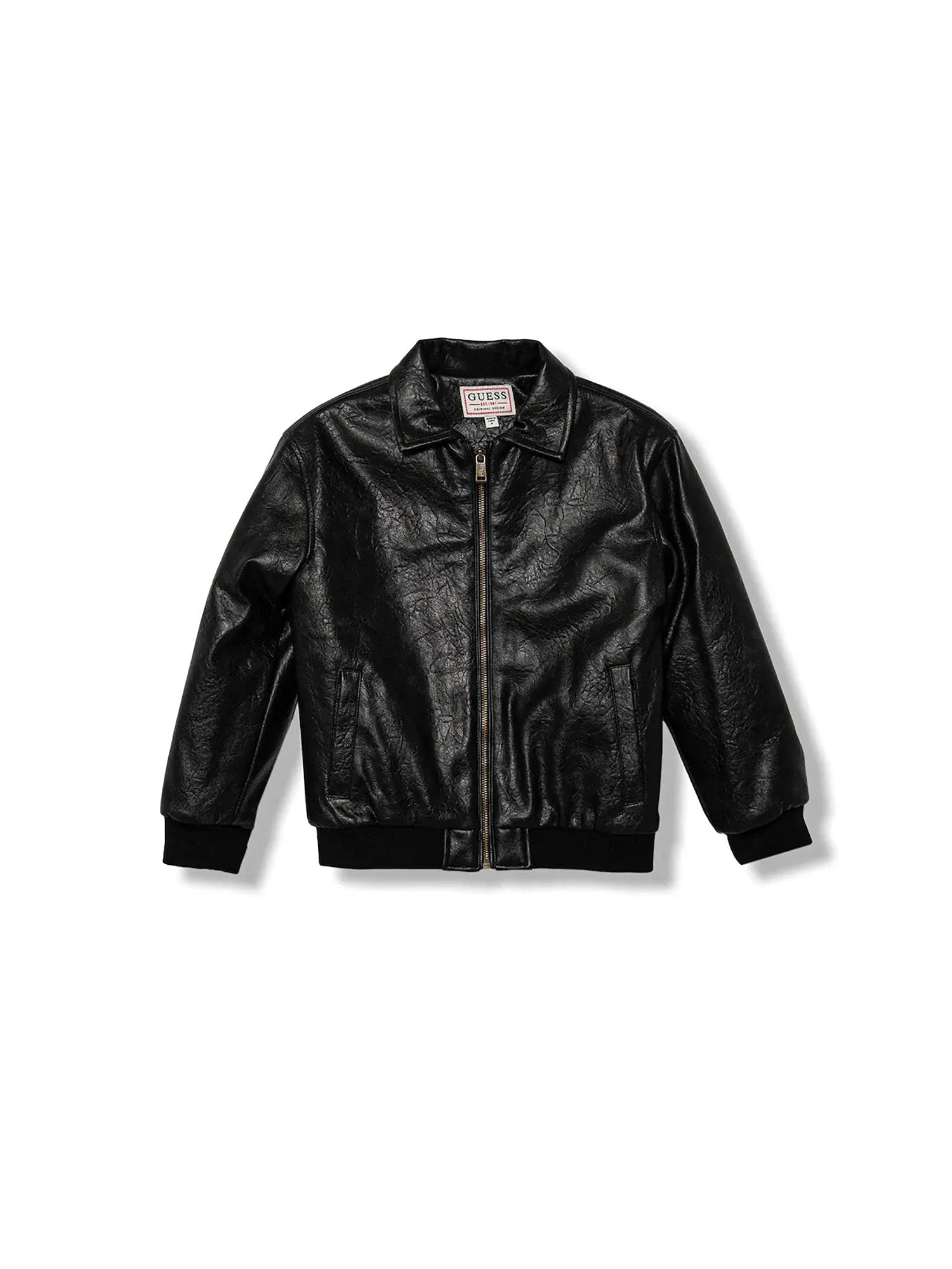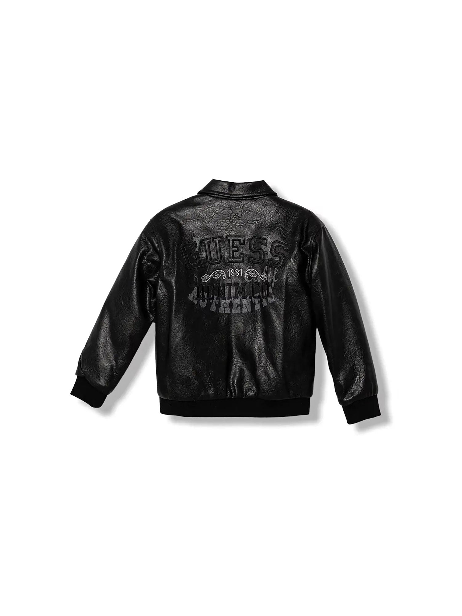 Giacca bomber Guess ragazzo in ecopelle con zip e colletto, dallo stile deciso e contemporaneo. Un modello ispirato al classico design biker, ideale per look casual e urban.