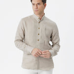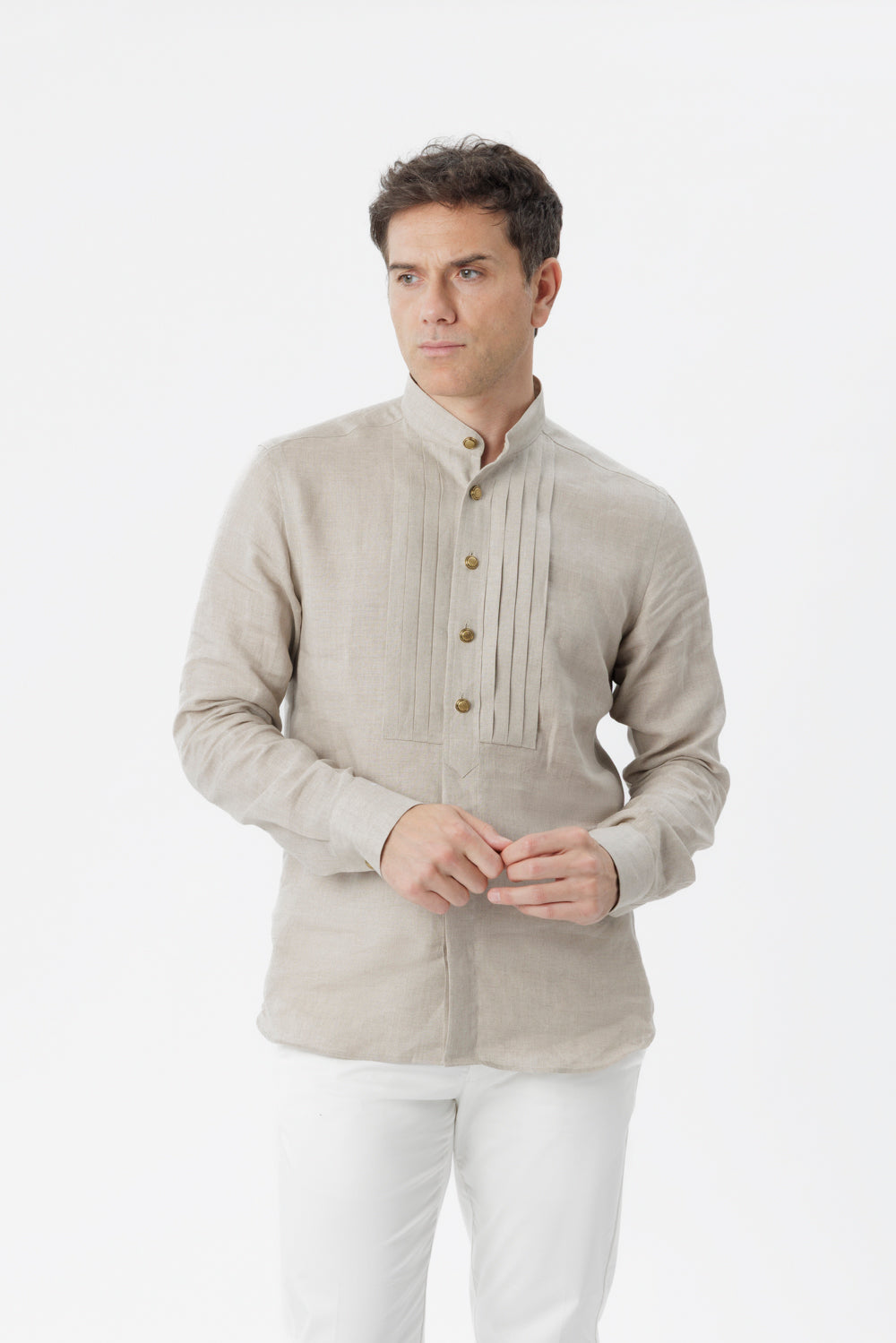 Questa camicia con collo coreano è realizzata in puro lino, ideale per le stagioni calde grazie alla sua naturale traspirabilità e alla texture fresca.
