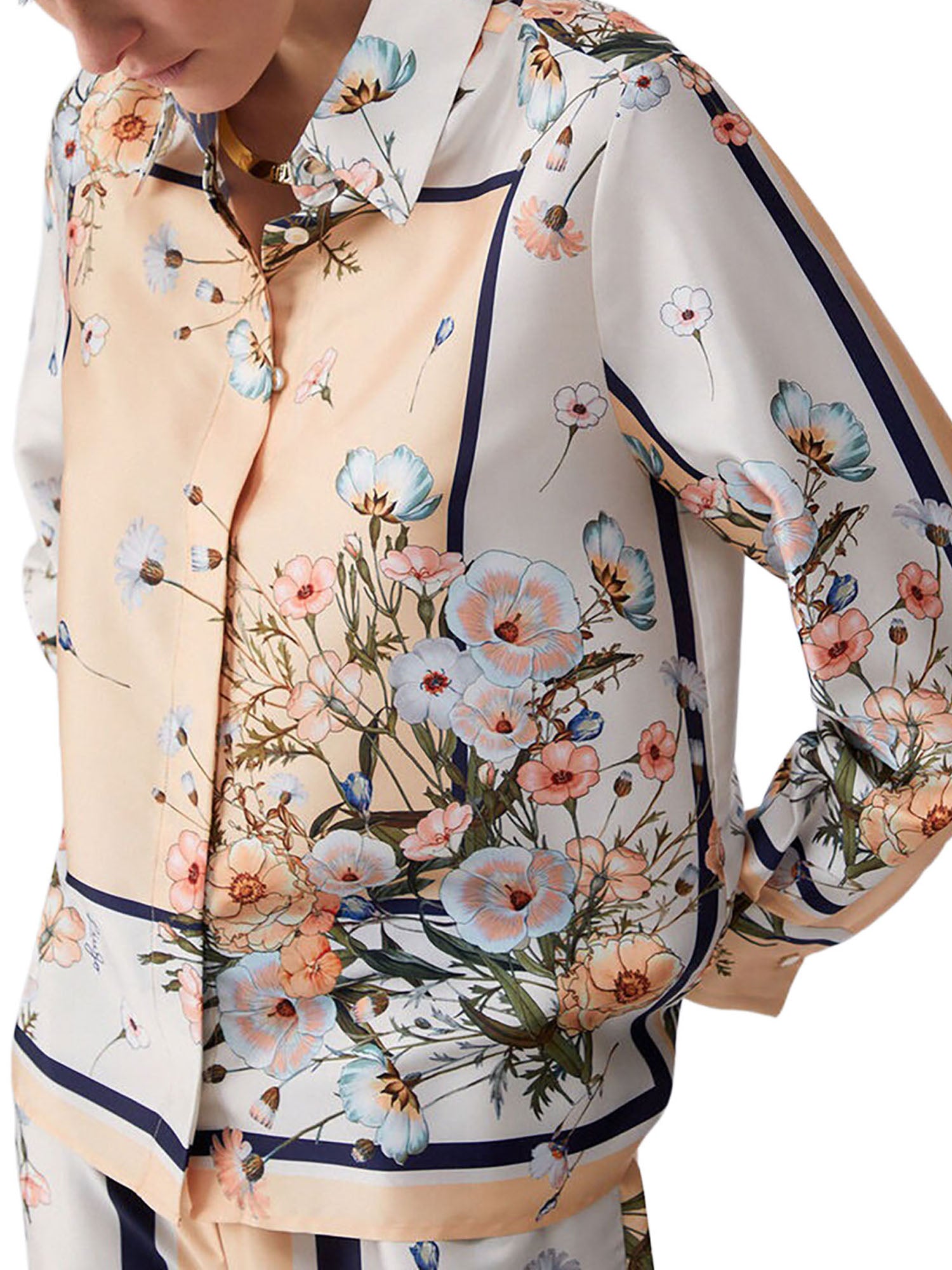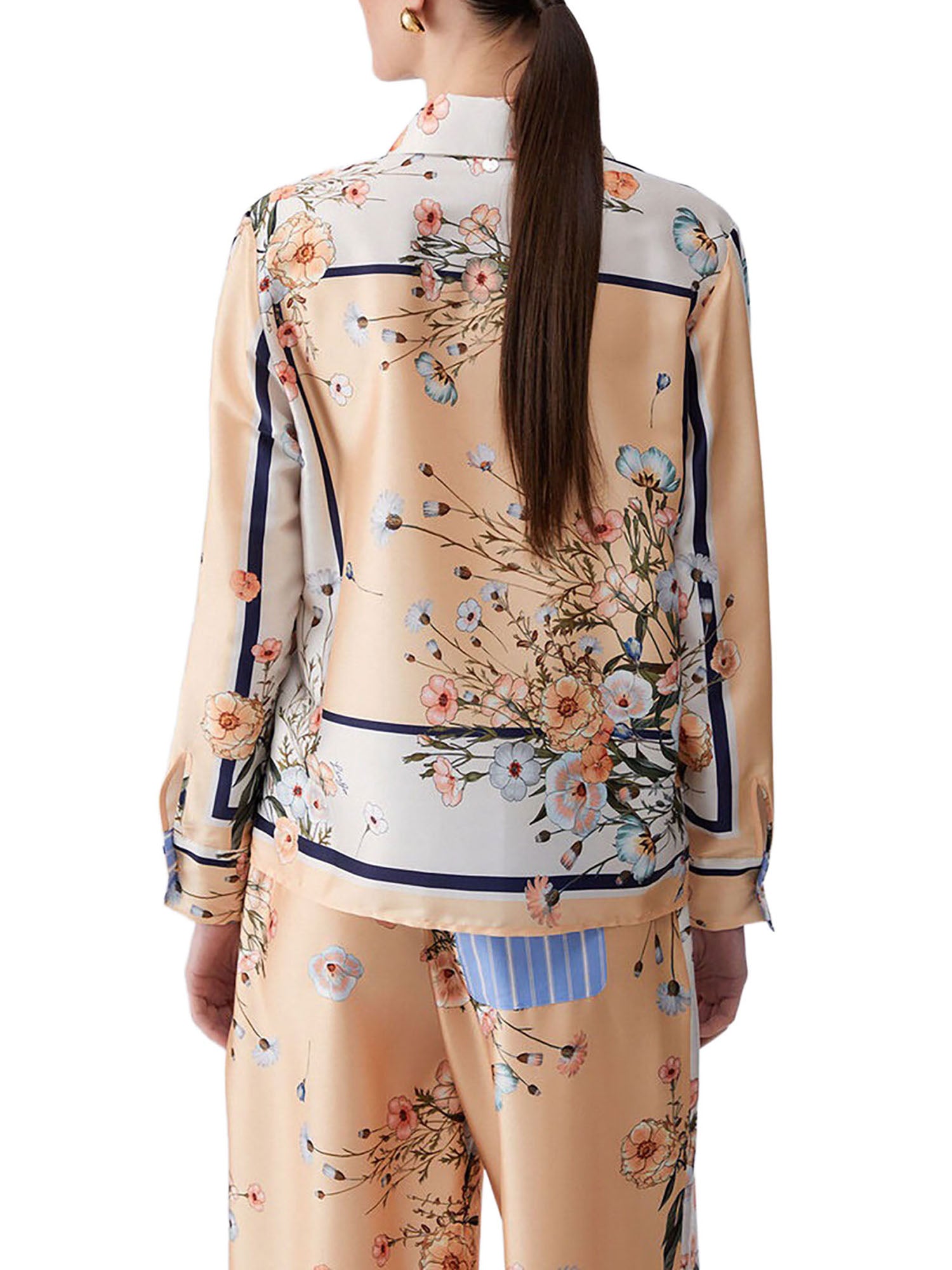 Camicia elegante in twill con stampa floreale dal gusto raffinato, perfetta per valorizzare look femminili e ricercati. Ideale sia per outfit quotidiani che per occasioni speciali.