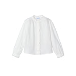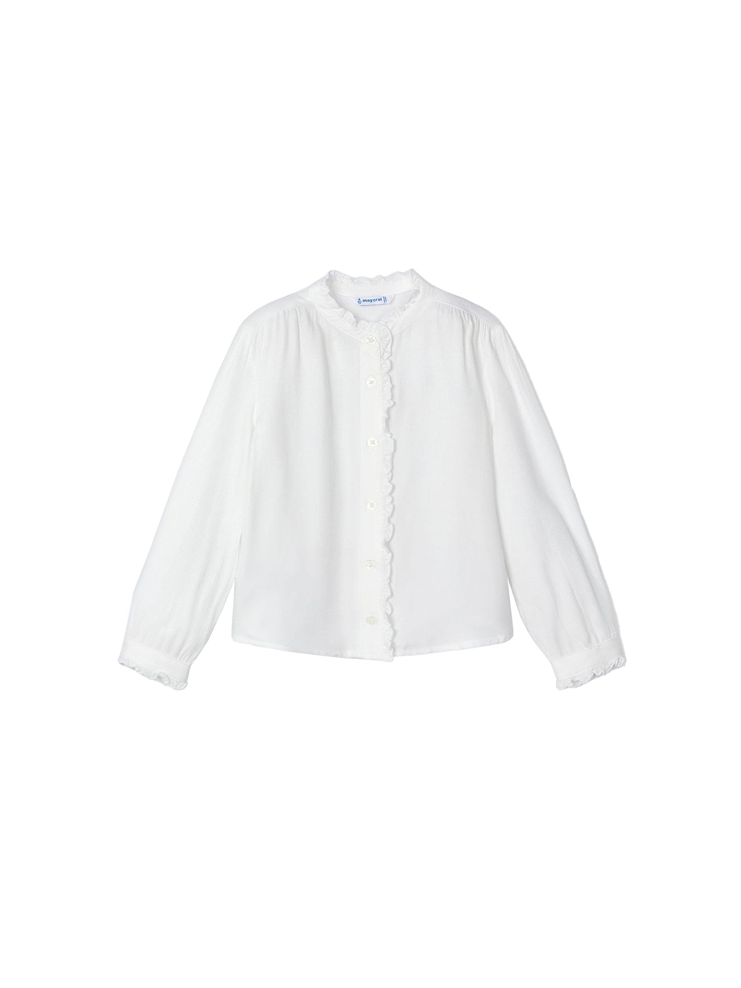 Camicetta panna per bambina Mayoral, realizzata in un tessuto leggero e fluido, perfetto per creare un look elegante e delicato. Il dettaglio distintivo del capo sono le delicate rouge lungo i bordi della chiusura frontale e intorno al colletto, che aggiungono un tocco romantico e raffinato.