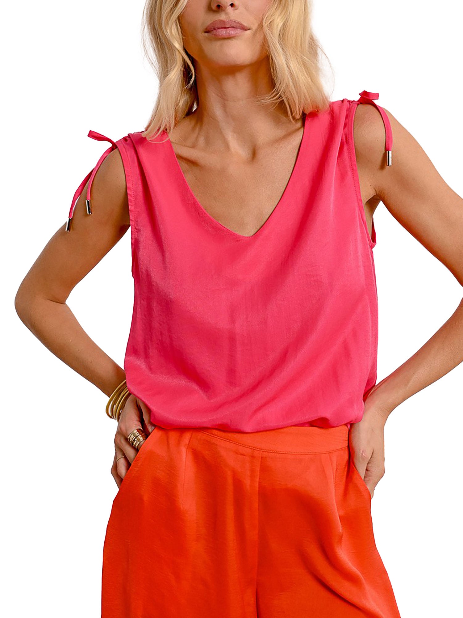 Top Molly Bracken, dalla linea fluida ed elegante, perfetto per le giornate estive in cui desideri sentirti comoda ma curata nei dettagli. Il tessuto leggermente lucido dona un tocco sofisticato e femminile, mentre le spalline con laccetti regolabili aggiungono un elemento romantico e personalizzabile.