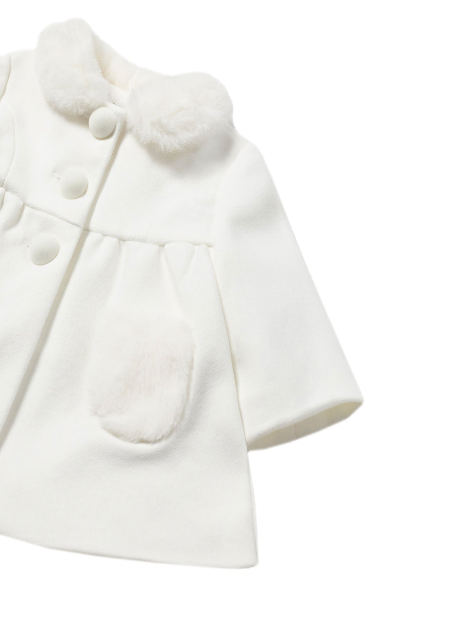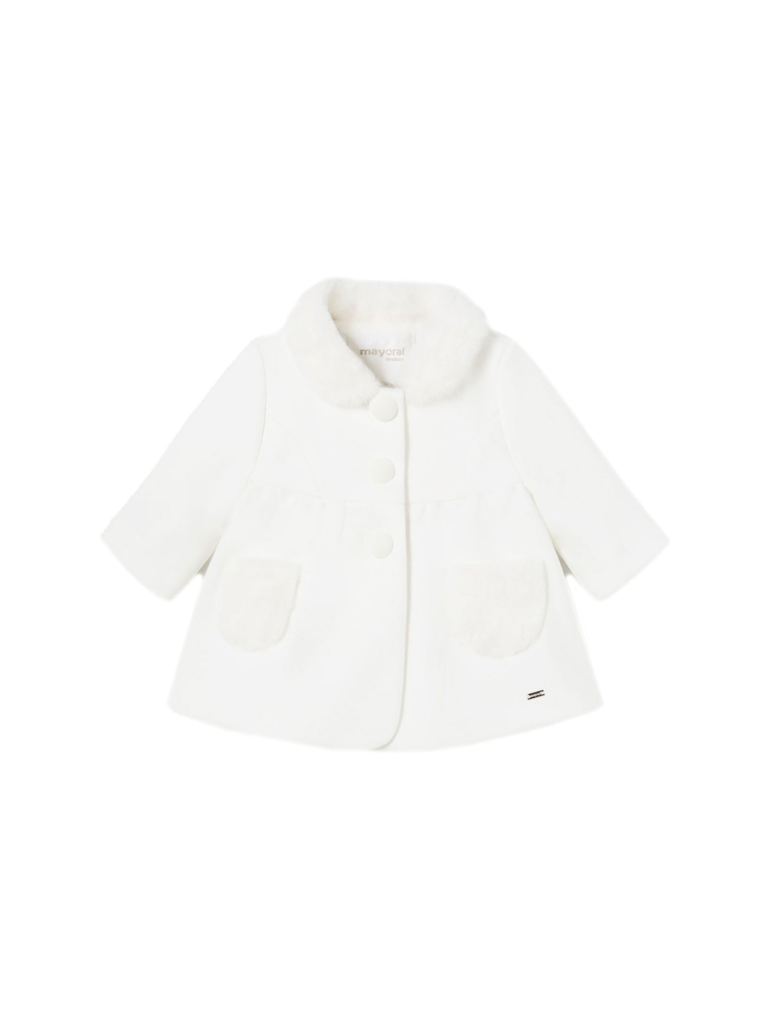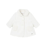 Cappottino in panno per neonata Mayoral, dal design raffinato e delicato. Il cappottino presenta un colletto morbido in pelliccia sintetica, che aggiunge un tocco lussuoso e accogliente al capo.