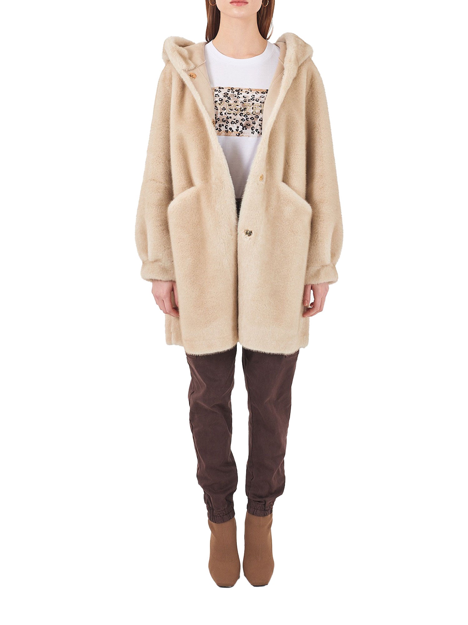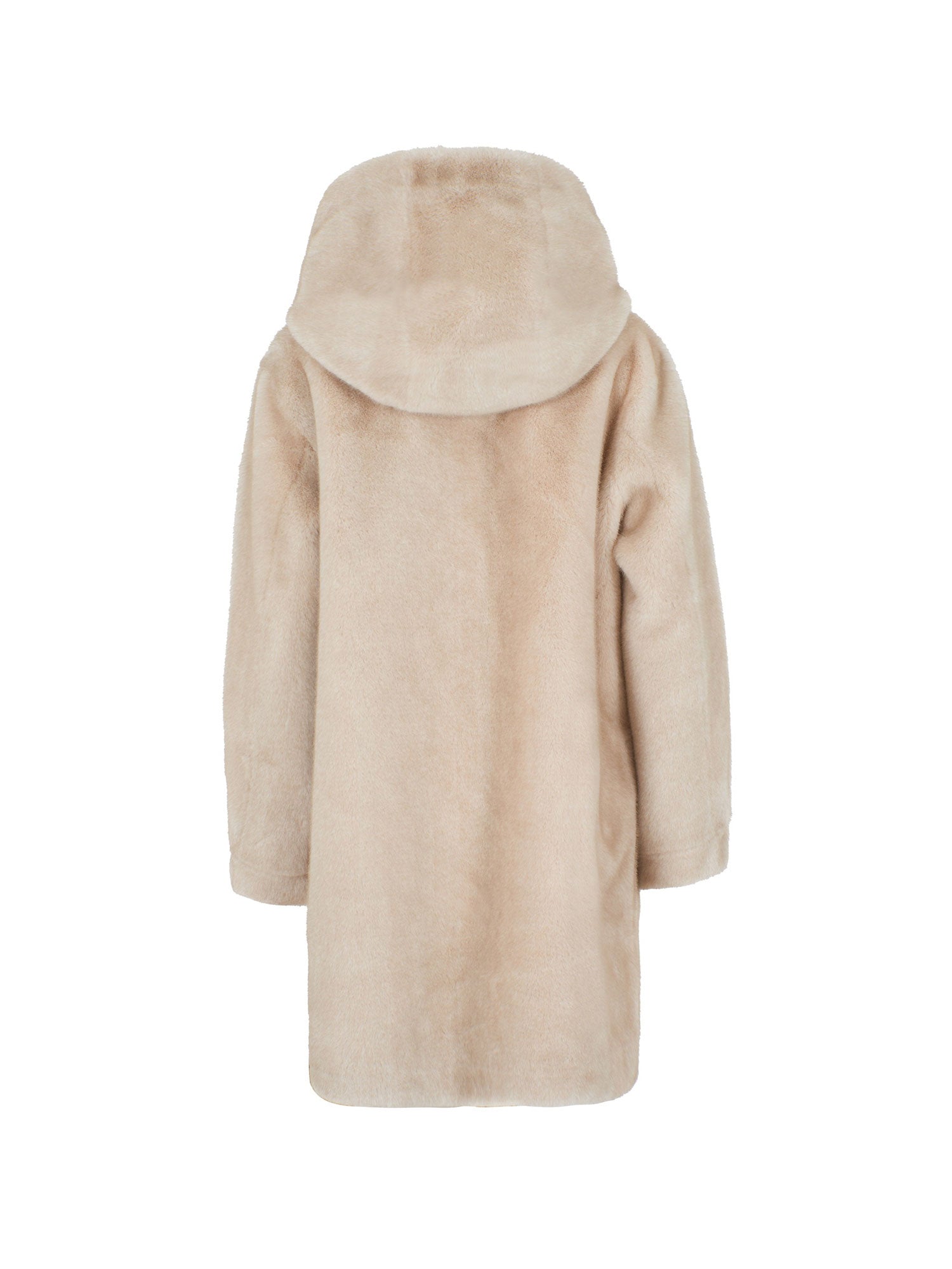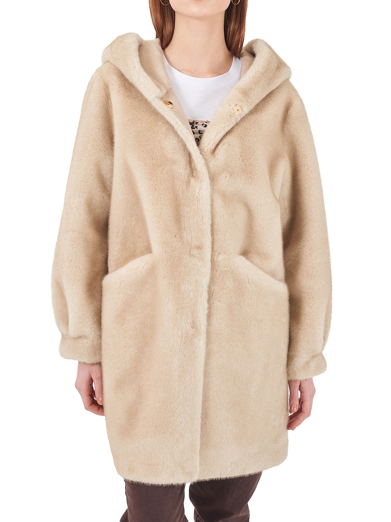 Cappotto lungo ecopelliccia Yes Zee donna con cappuccio e bottoni beige
