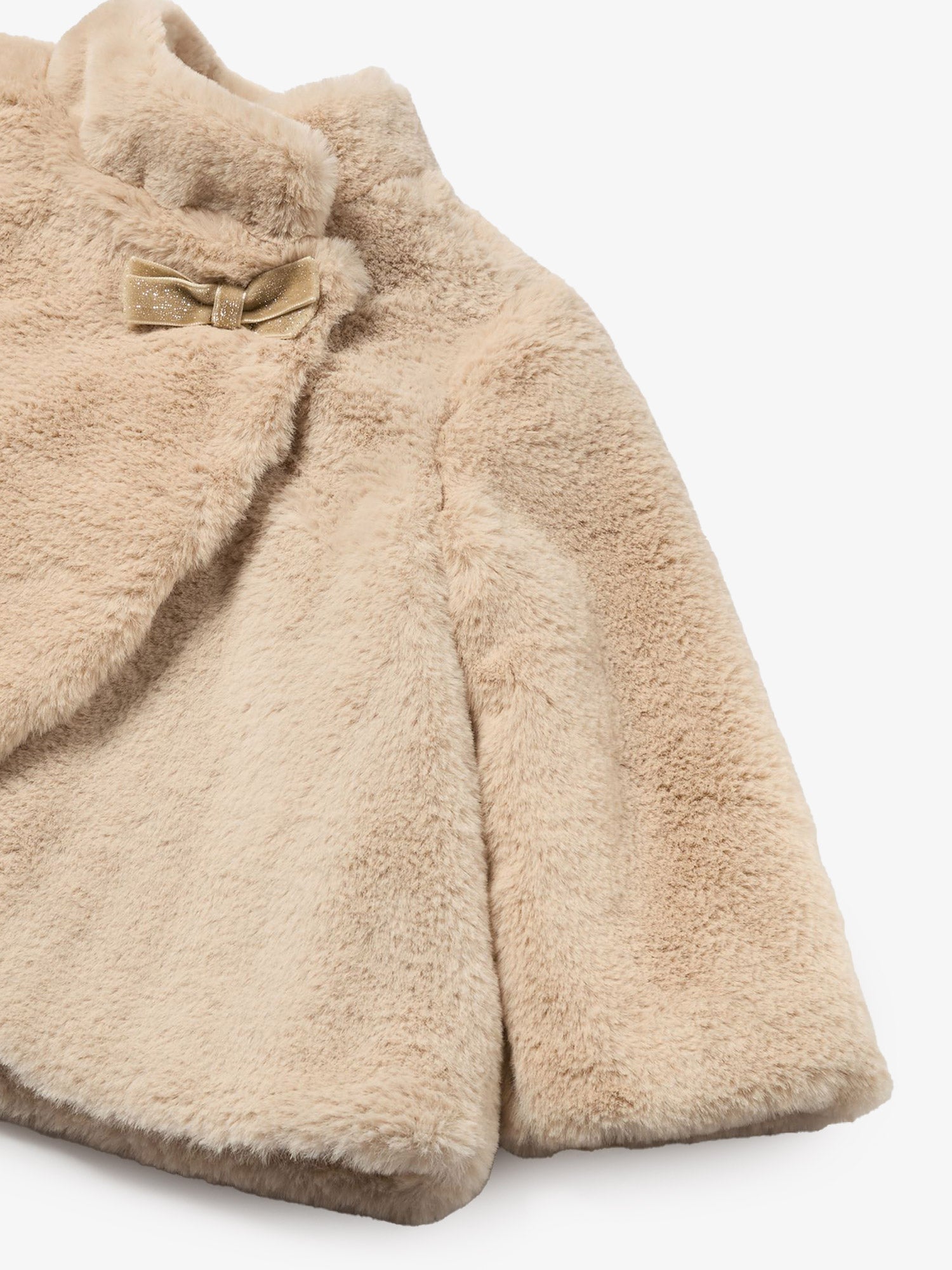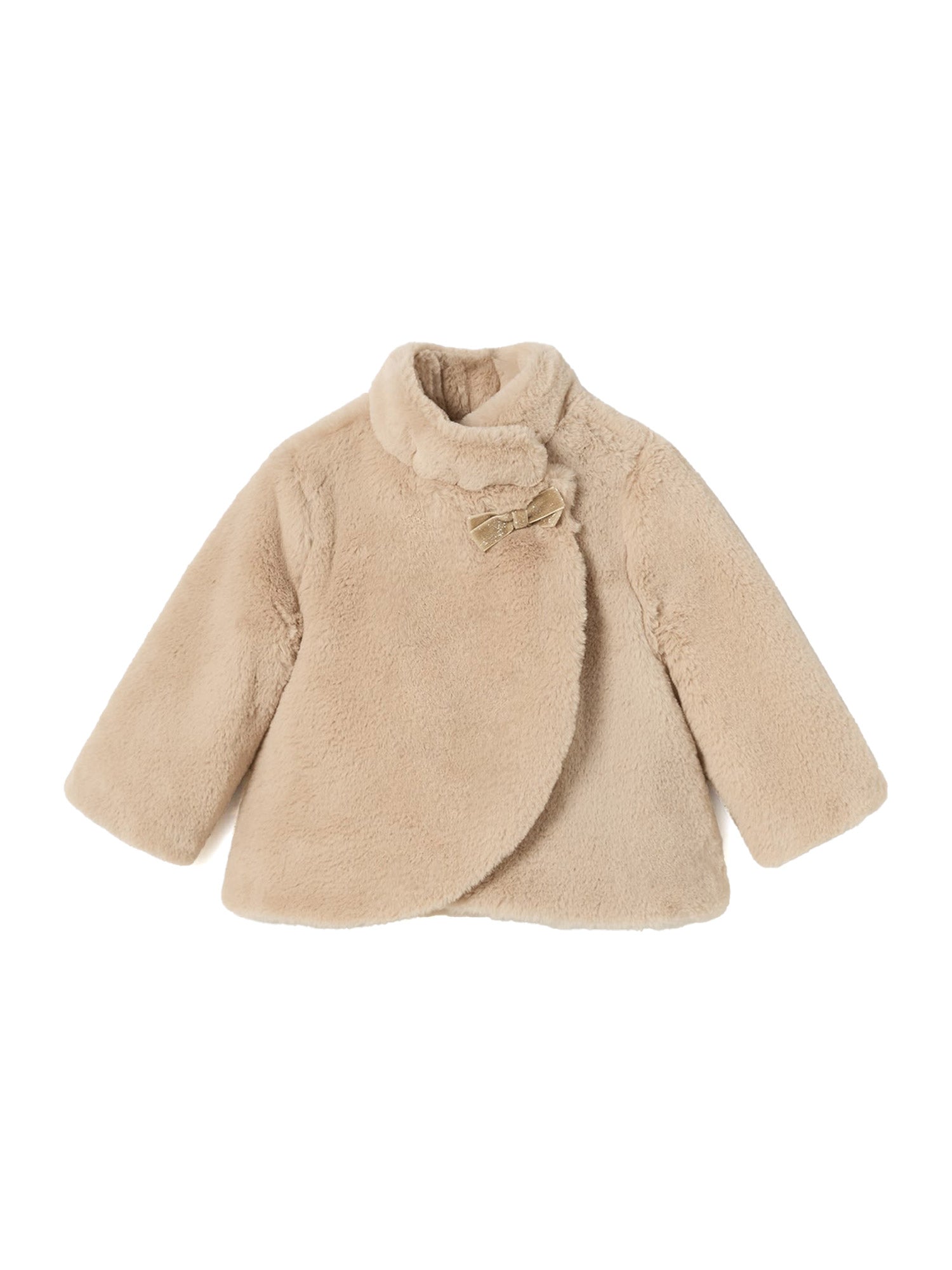 Cappotto invernale in pelliccia sintetica per neonata Mayoral di colore beige chiaro. Ha un design elegante e raffinato, con un colletto alto che offre una protezione extra dal freddo. La chiusura è asimmetrica, aggiungendo un tocco di modernità, ed è arricchita da un delicato fiocco dorato sul lato del colletto.