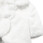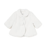 Cappotto in pelliccia sintetica neonata Mayoral di colore bianco. Il design è elegante e morbido, con un ampio colletto e maniche lunghe. La chiusura frontale presenta due grandi bottoni ricoperti di pelliccia, che aggiungono un tocco di dolcezza al capo.