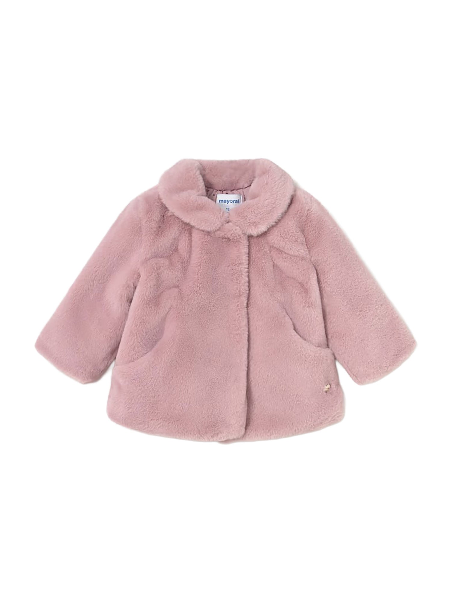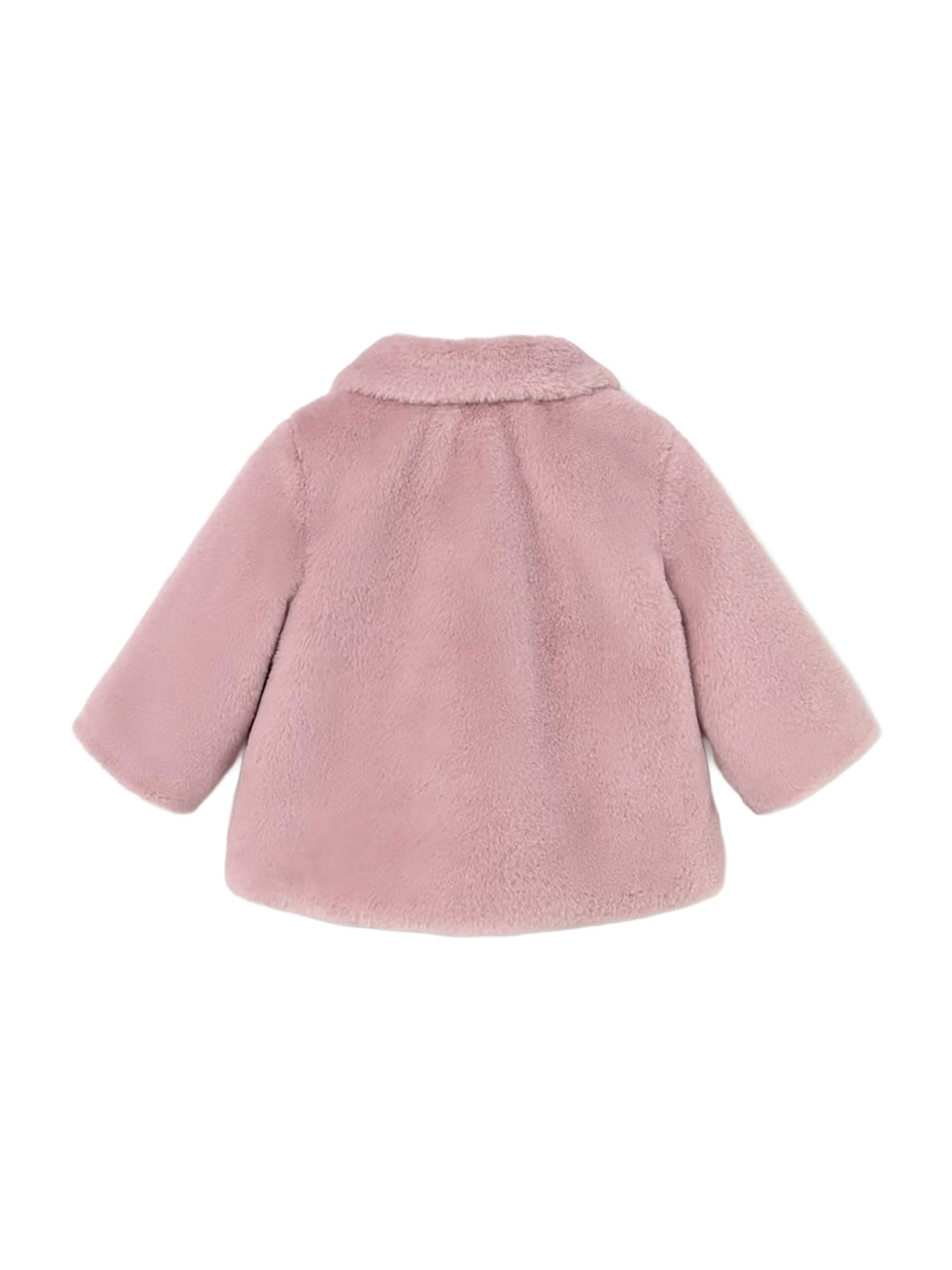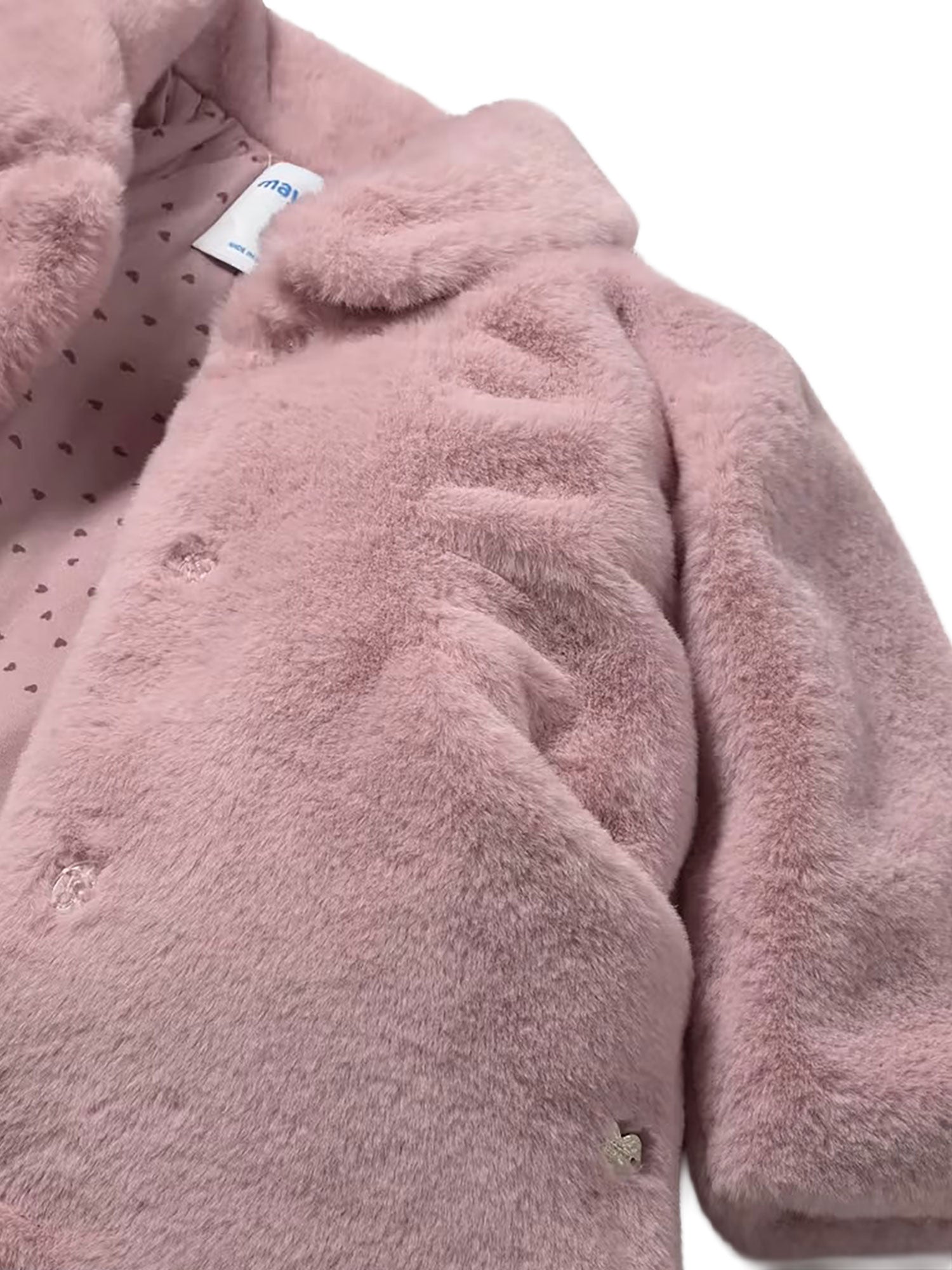 Cappotto pelliccia Mayoral neonata a manica lunga. Realizzato in morbido tessuto effetto pelliccia, pensato per offrire calore e comfort durante le stagioni più fredde.