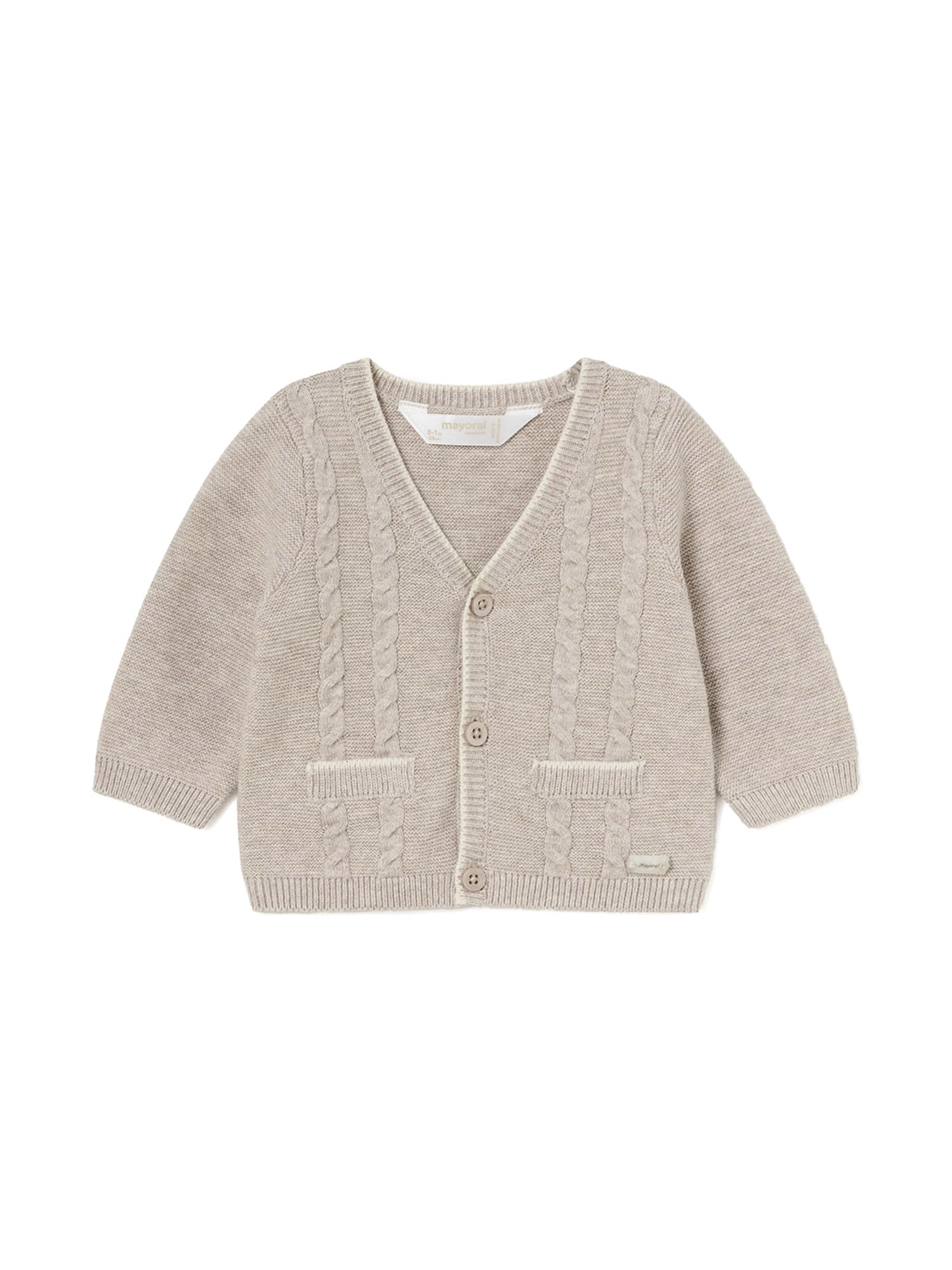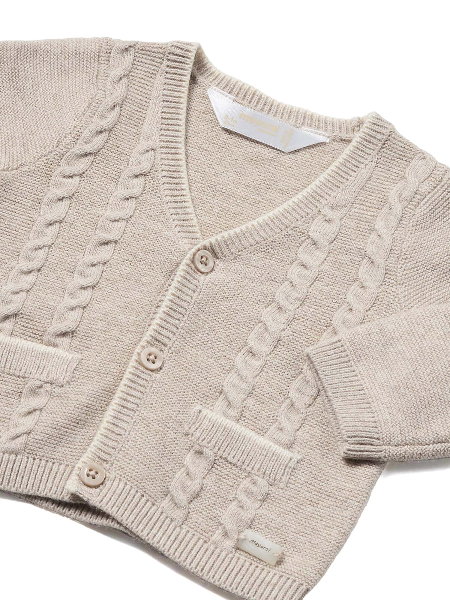 Cardigan neonato Mayoral beige, perfetto per tenere il bambino al caldo con stile, aggiungendo un tocco di eleganza casual al suo outfit quotidiano.