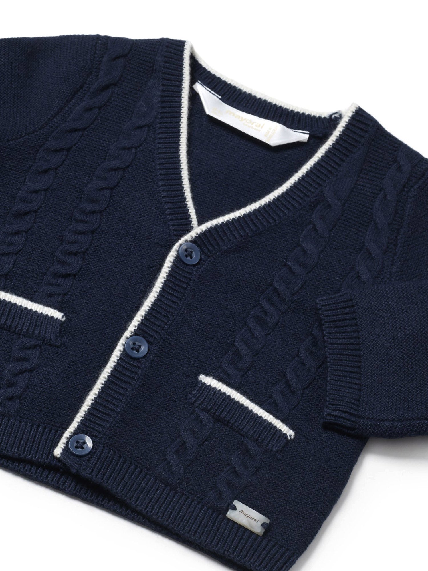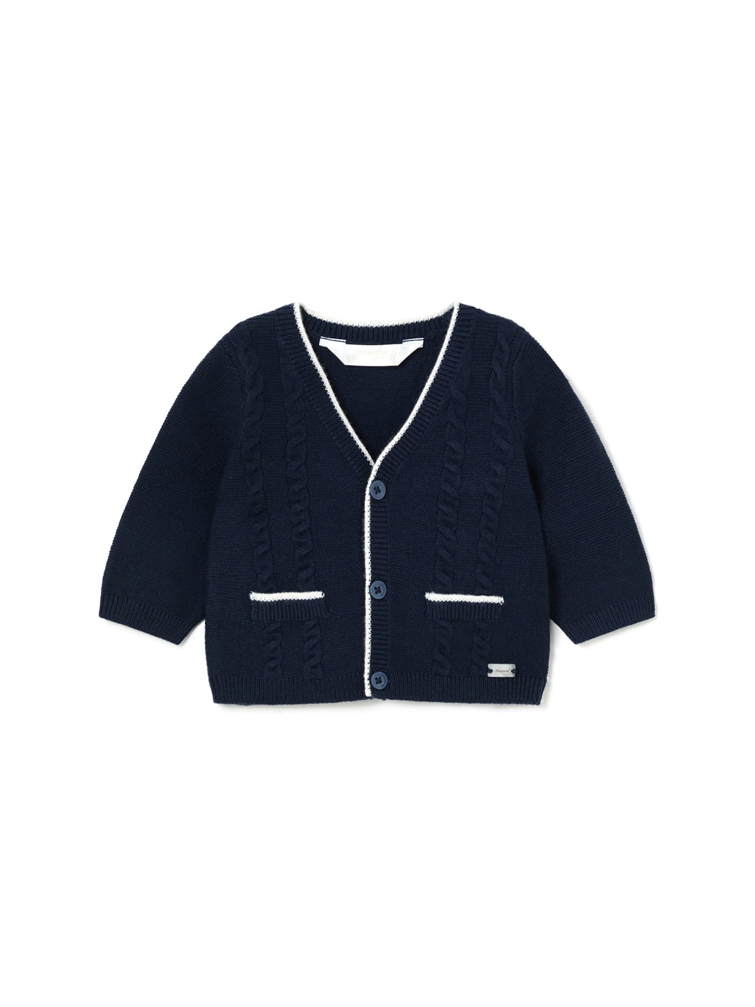 Cardigan neonato Mayoral blu, perfetto per tenere il bambino al caldo con stile, aggiungendo un tocco di eleganza casual al suo outfit quotidiano.