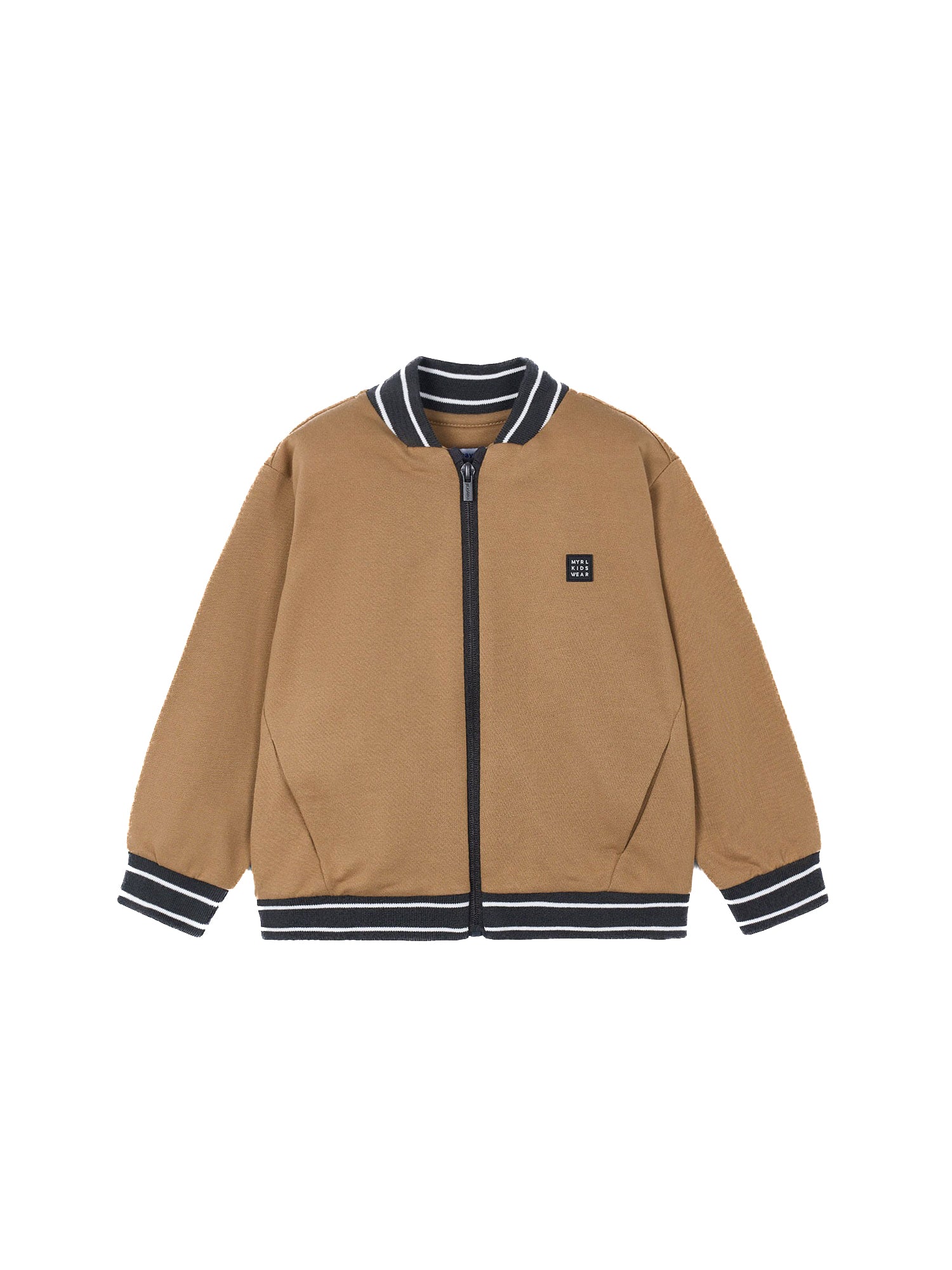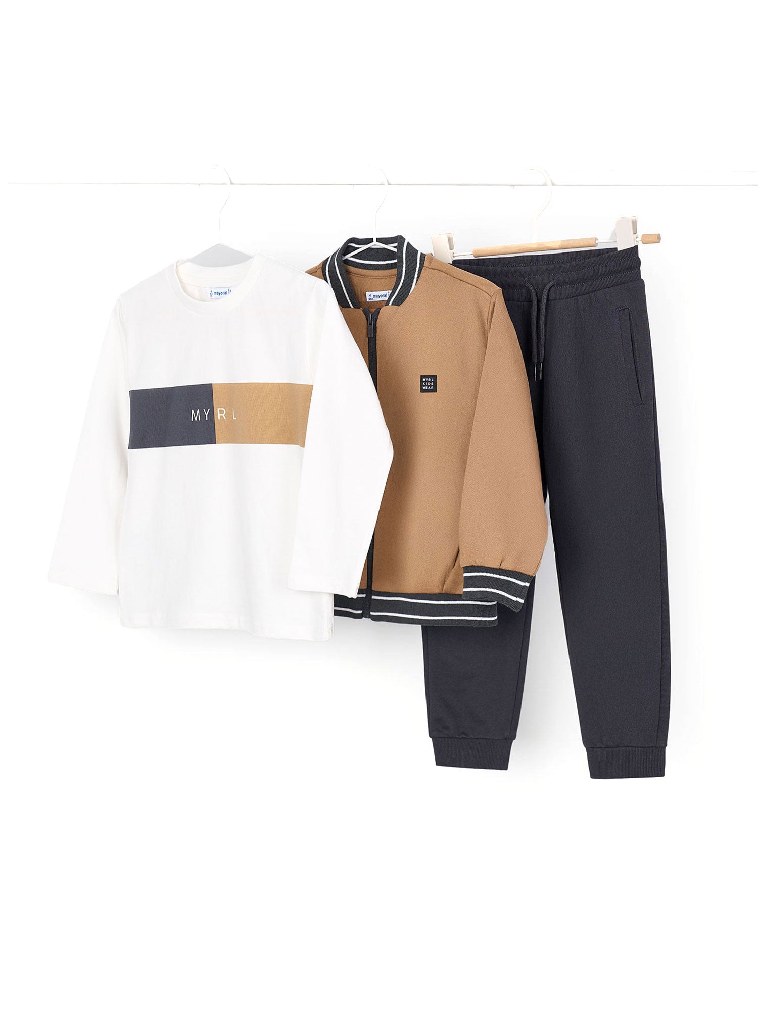 Completo Mayoral per bambino. Un look dinamico e comodo, perfetto per le giornate di gioco o per il tempo libero. La t-shirt a manica lunga con un design moderno, la giacca bomber con dettagli a righe e i pantaloni sportivi creano una combinazione versatile e stilosa.