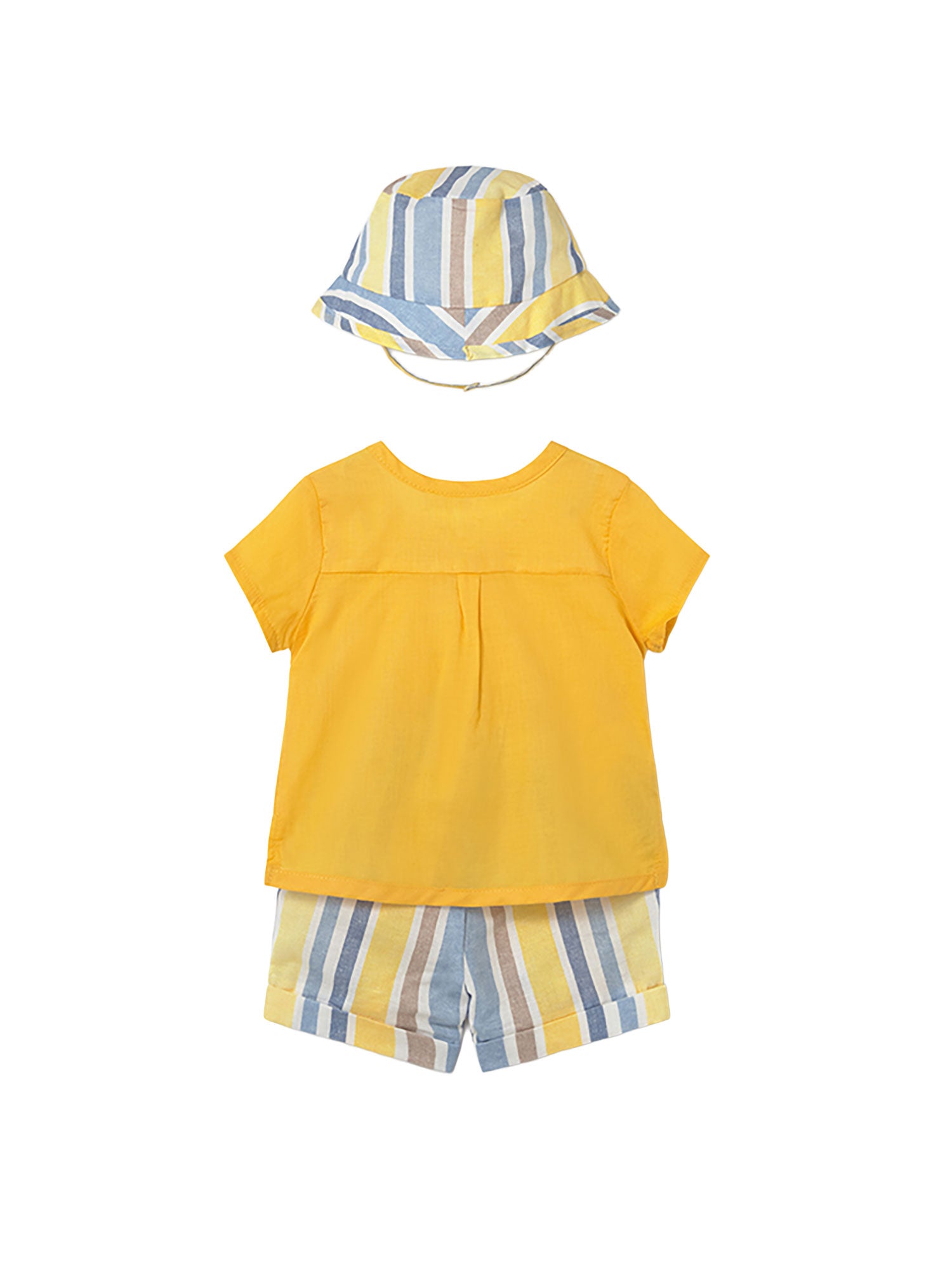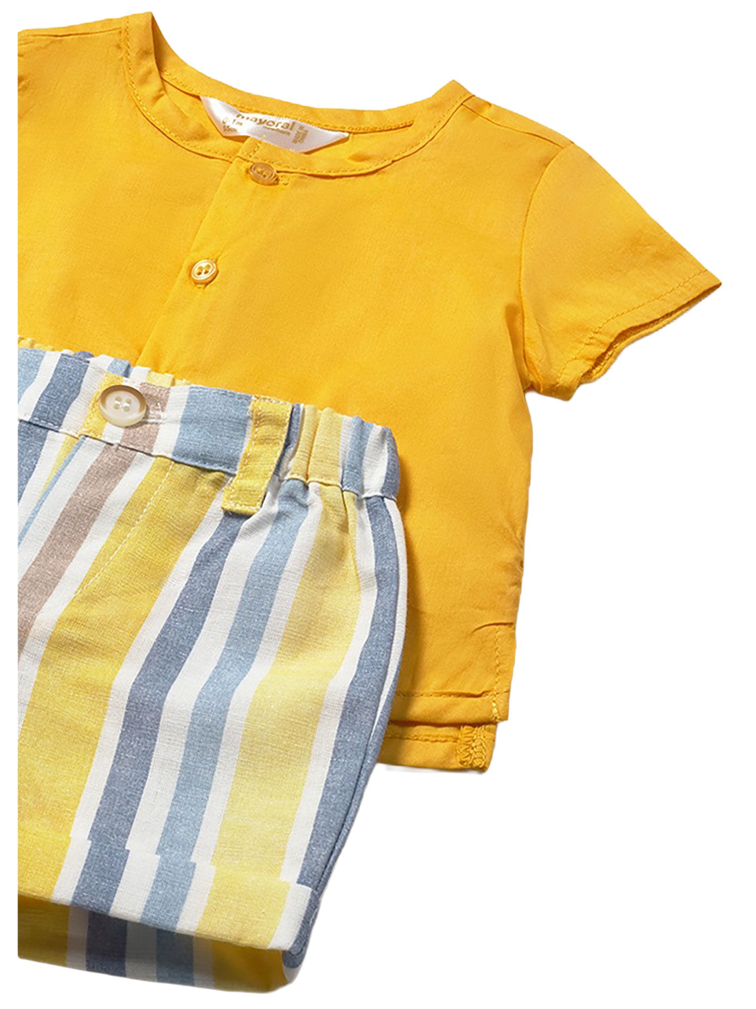 Completo Mayoral estivo fresco e colorato, perfetto per vestire il neonato con stile e comfort durante le giornate più calde. L’abbinamento tra la camicia dai toni vivaci e gli shorts a righe crea un look allegro e curato, ideale per l’estate.