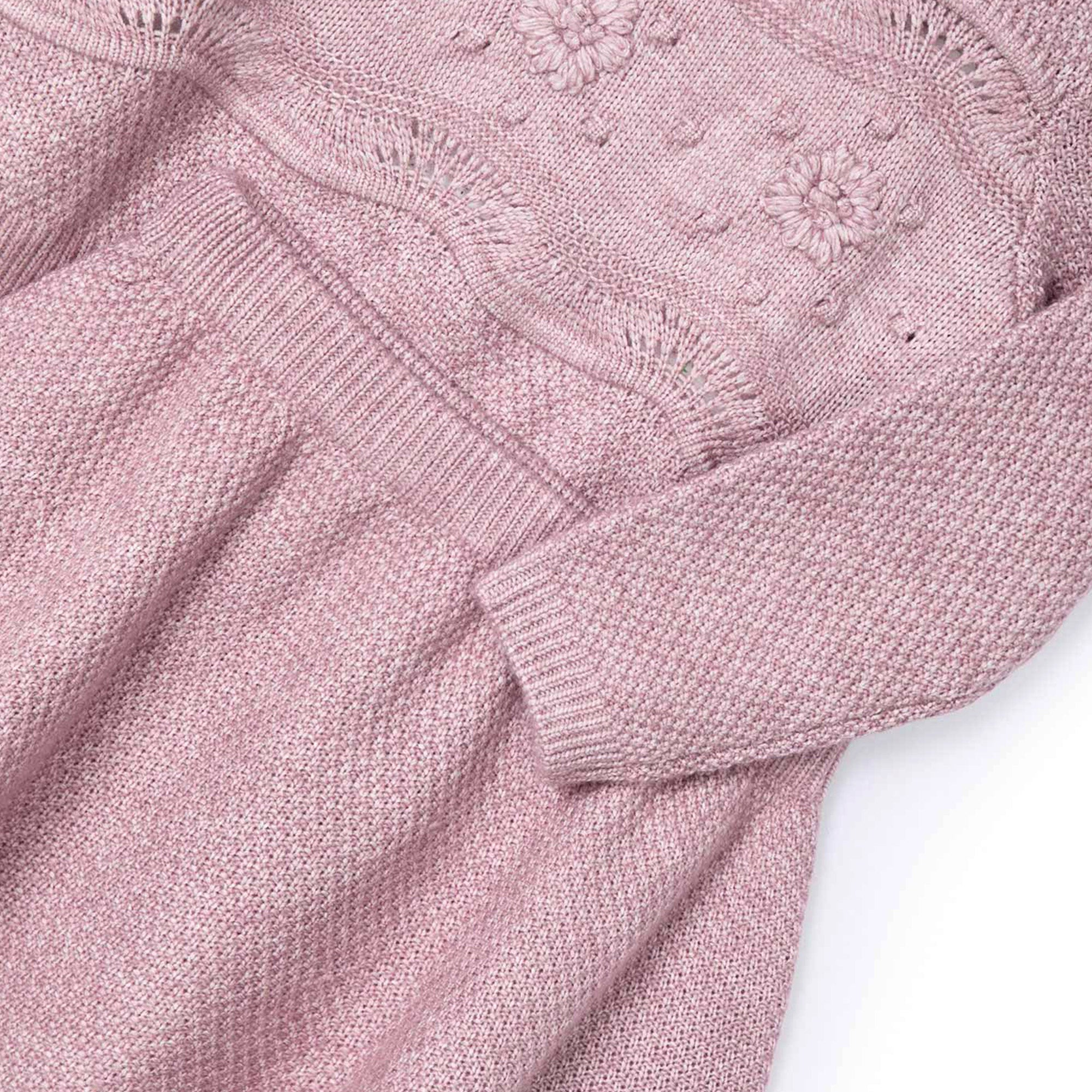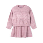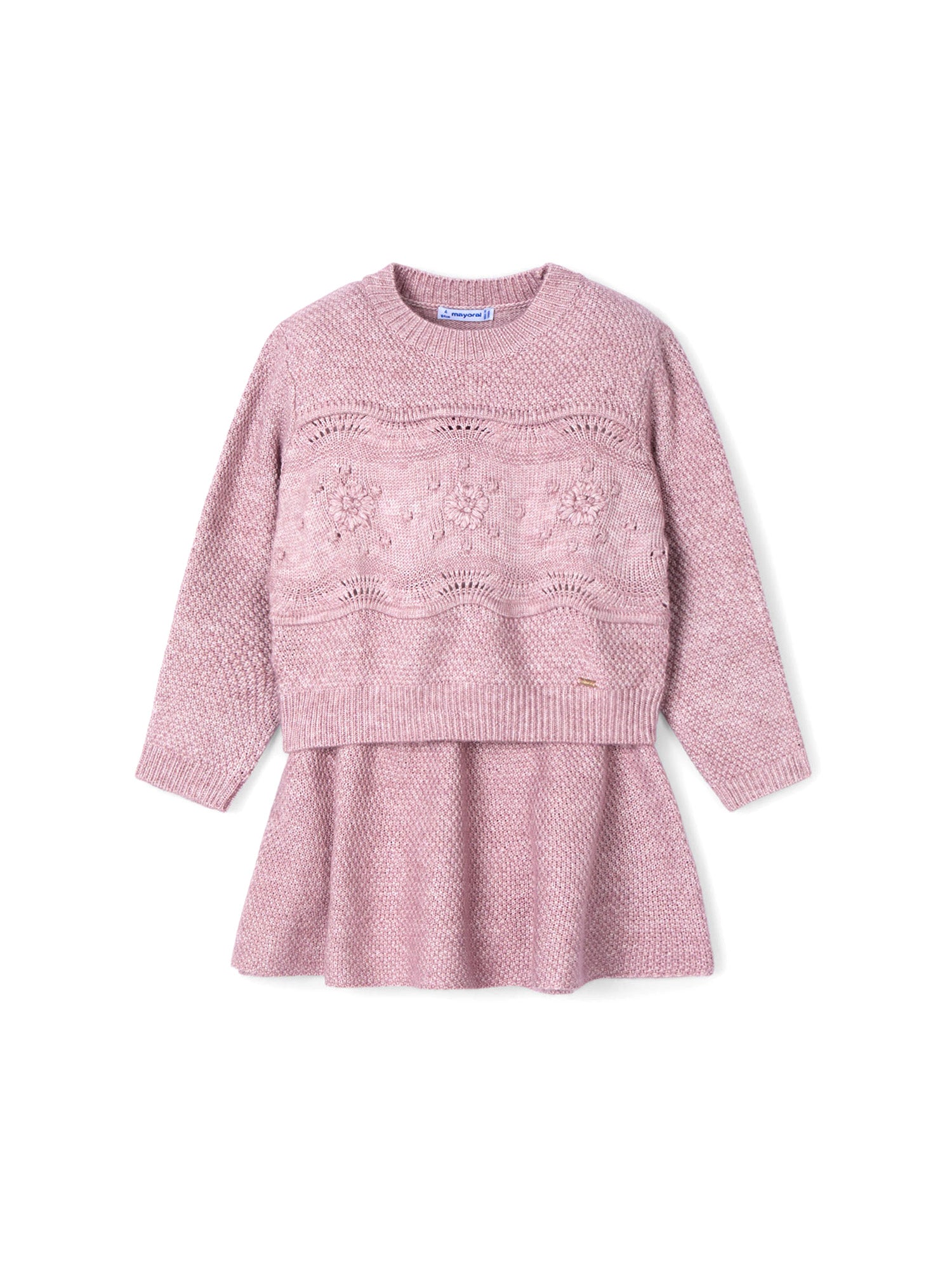 Completo bambina Mayoral composto da maglia e gonna di colore rosa chiaro. Maglia lavorata con dettagli decorativi a rilievo, tra cui piccoli fiori e motivi a onde. Gonna leggermente svasata, con una lavorazione più semplice, ma che continua con la stessa texture del resto del vestito. Il design complessivo è elegante ma comodo, adatto per l'inverno o la stagione fredda, perfetto per occasioni informali o anche un po' più eleganti.