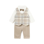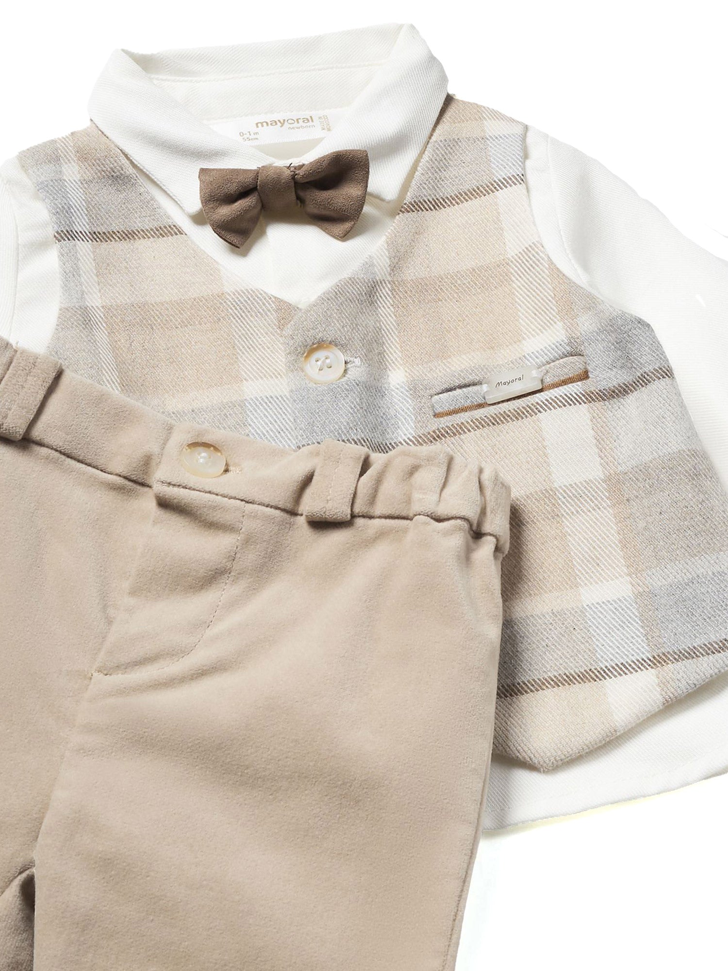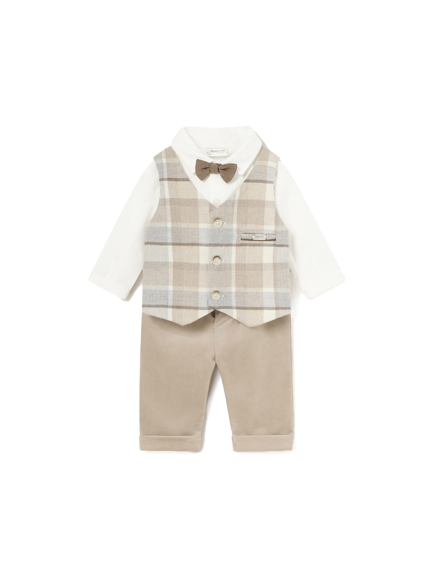 Completo per neonati Mayoral, perfetto per occasioni speciali, composto da tre pezzi principali: Camicia, gilet, papillon e pantaloni. Questo completo è ideale per battesimi, matrimoni o altre occasioni speciali in cui si vuole vestire il bambino in modo elegante e stiloso.