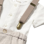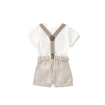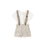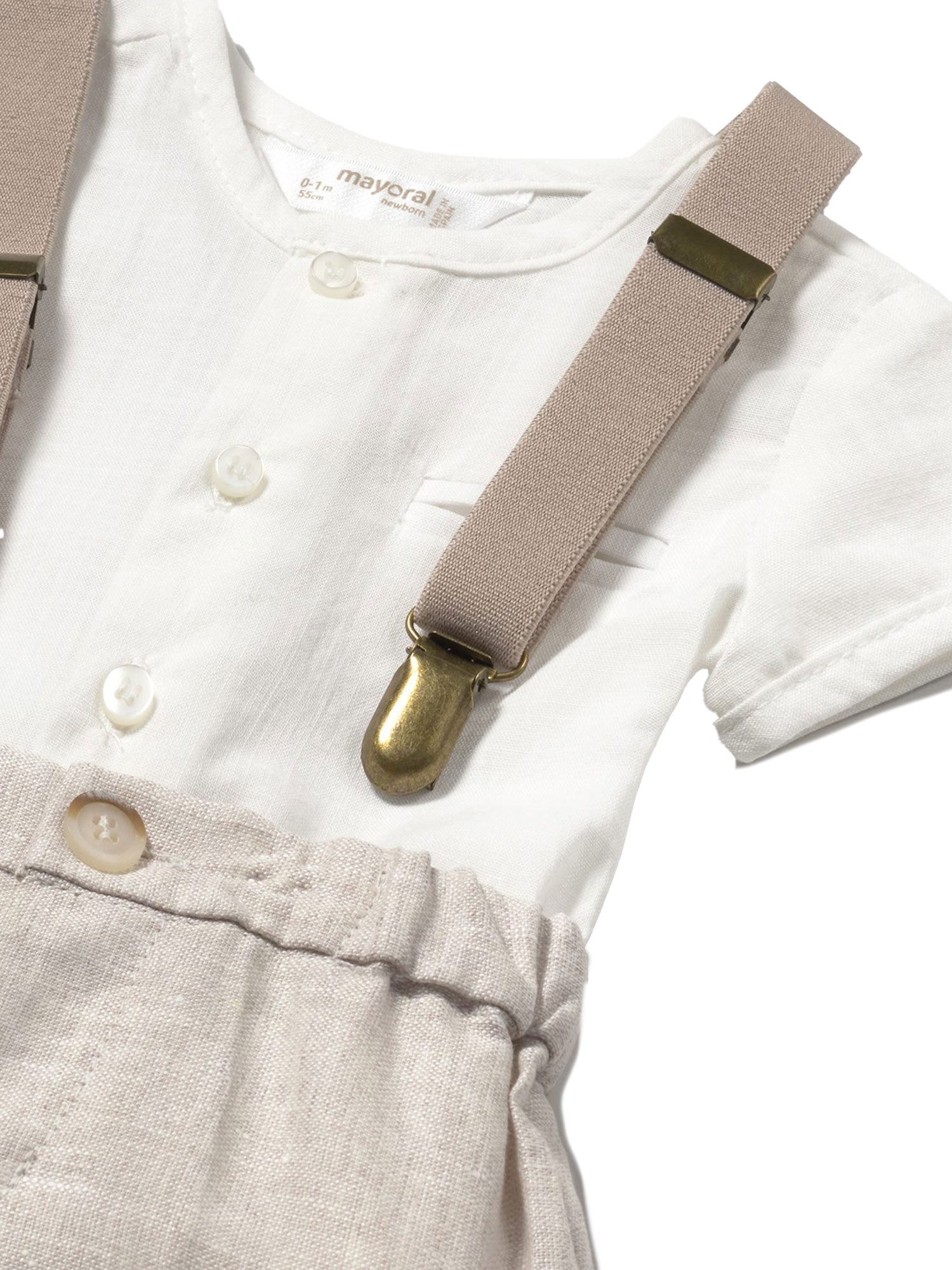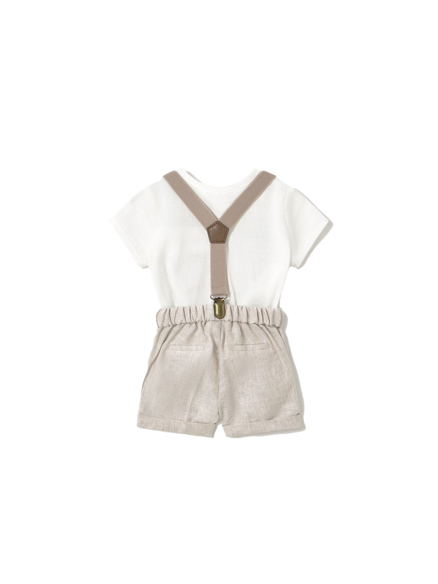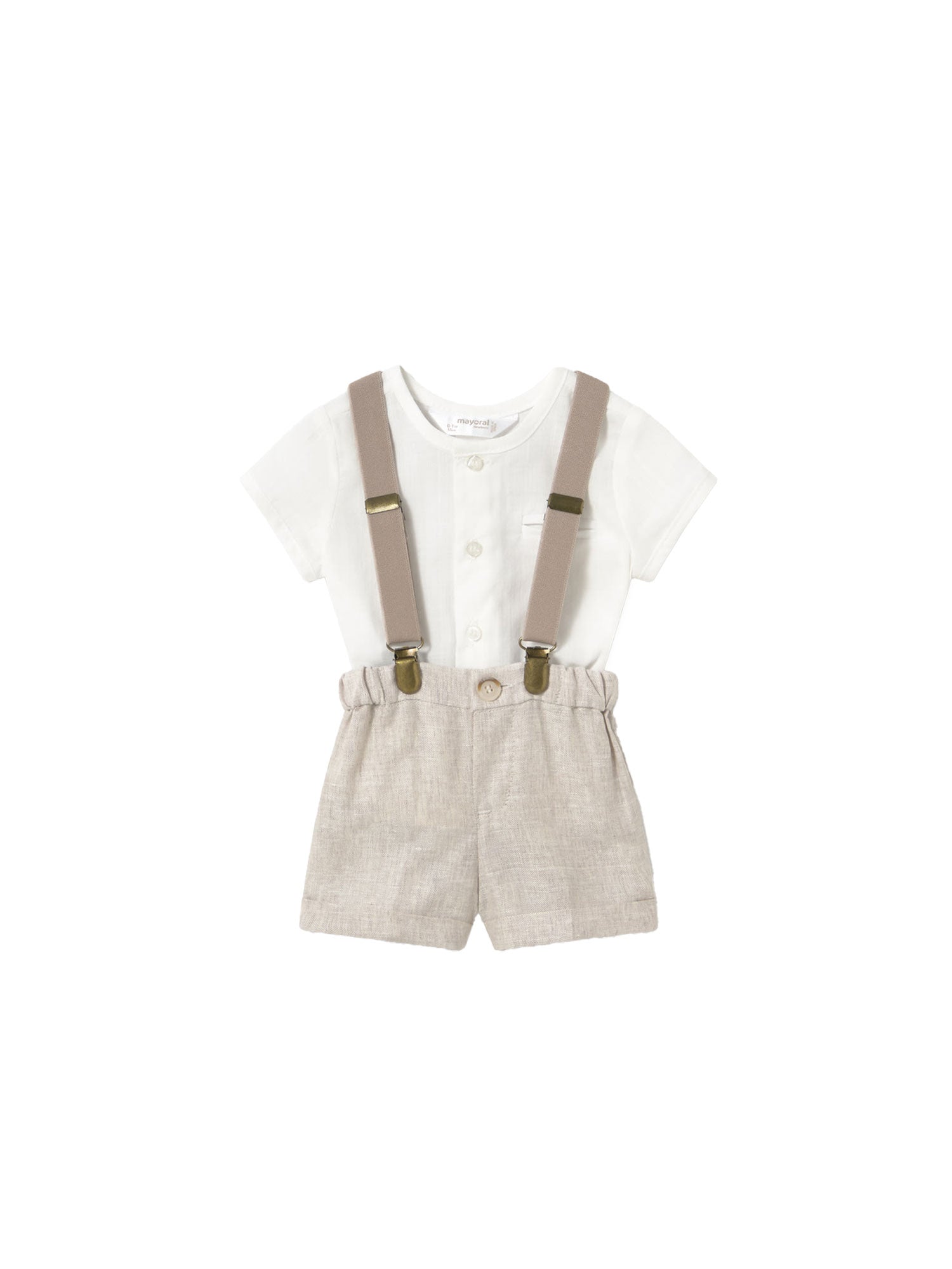Un completo Mayoral elegante e raffinato, pensato per accompagnare il tuo bimbo nelle occasioni speciali con un tocco di stile classico e intramontabile. La camicia in tessuto leggero si abbina perfettamente ai pantaloncini con bretelle, creando un look curato nei dettagli e confortevole da indossare, ideale per cerimonie e momenti importanti.