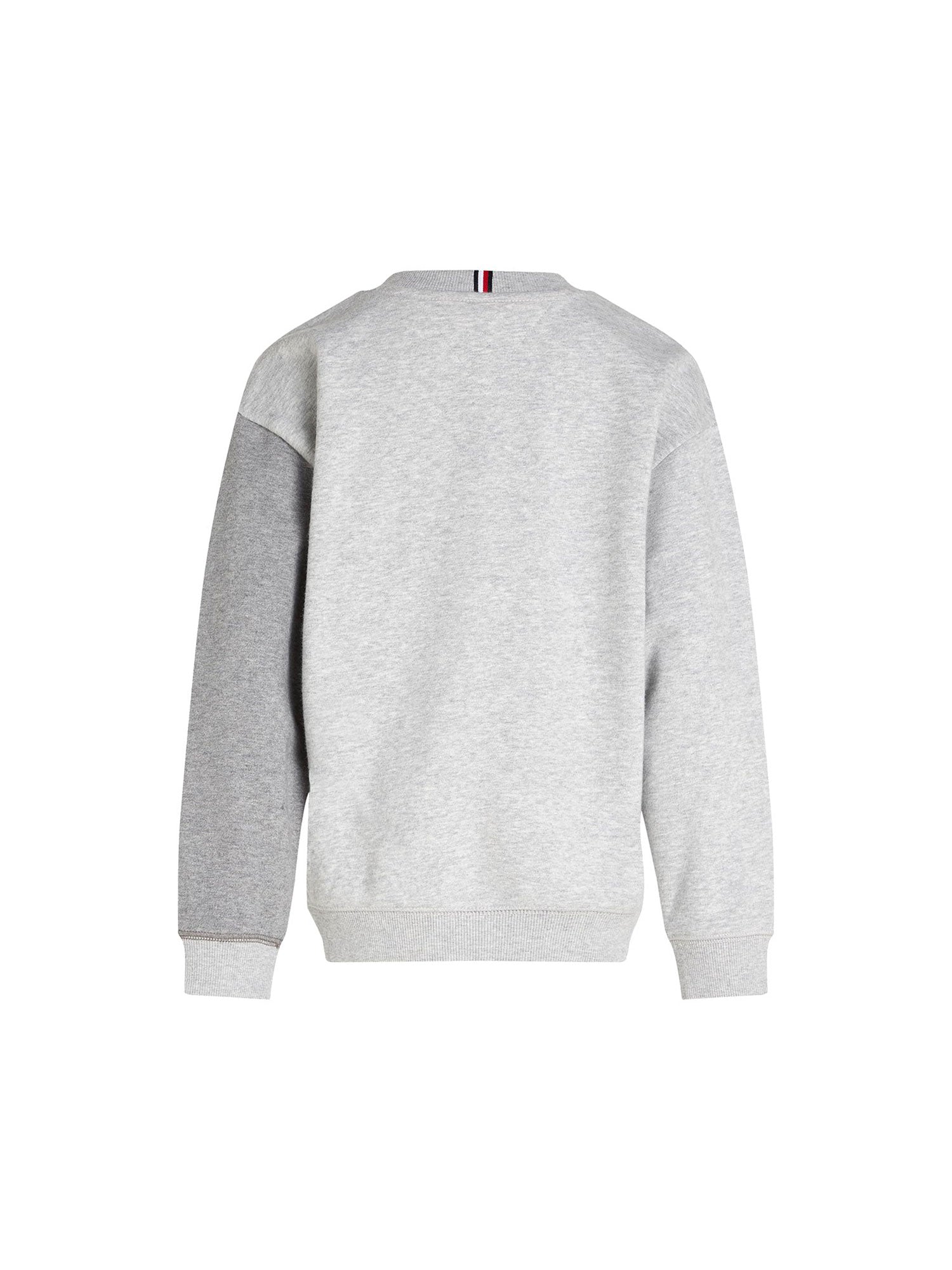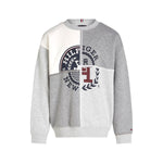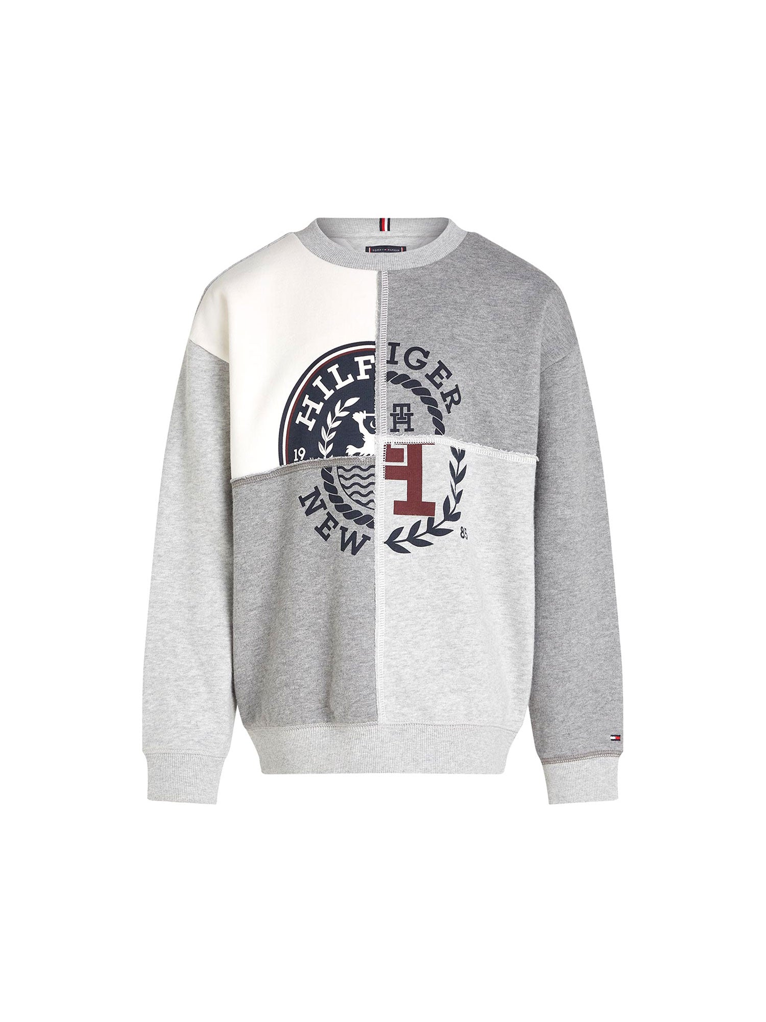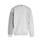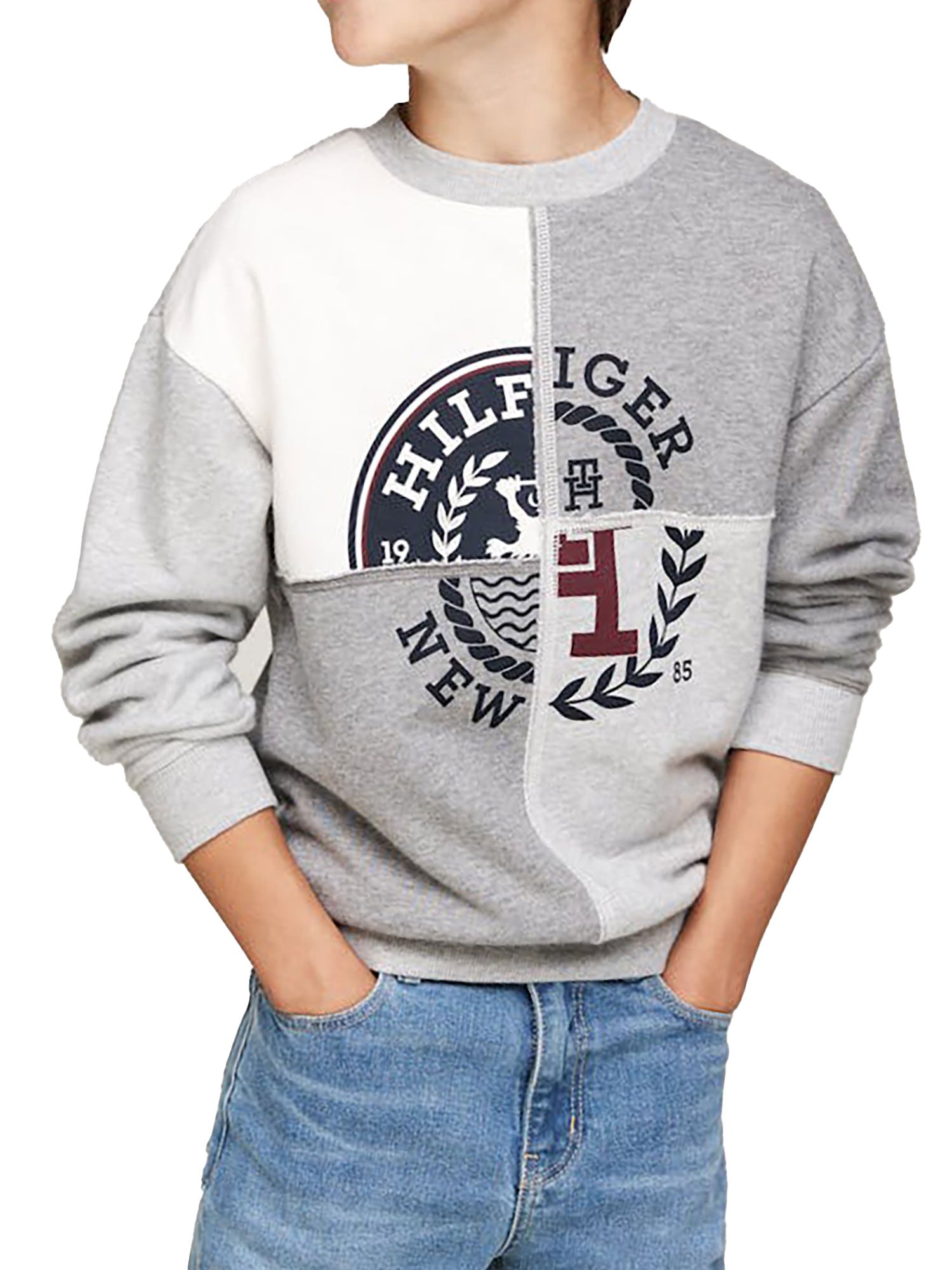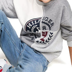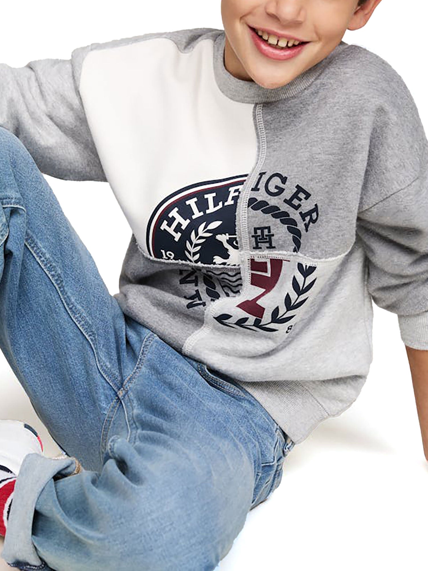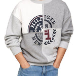 Felpa da bambino di Tommy Hilfiger dal design distintivo e moderno,con motivo frontale patchwork e cucitura piatta. Il lato frontale è caratterizzato da un grande logo centrale con l’emblema "Hilfiger New York", aggiungendo un tocco iconico e classico. La parte posteriore è semplice, con una finitura pulita e dettagli minimalisti, che completano il look senza eccessi.