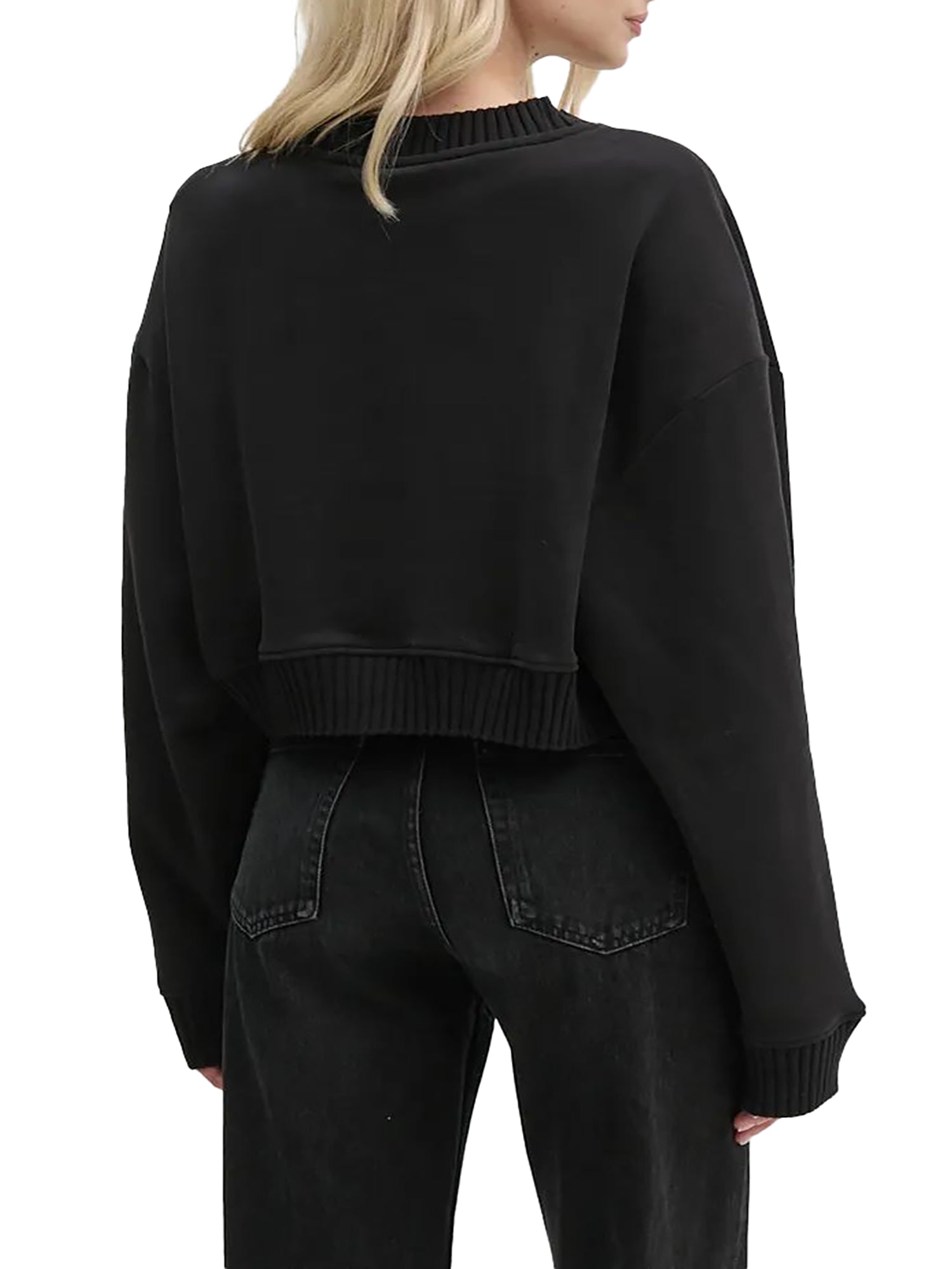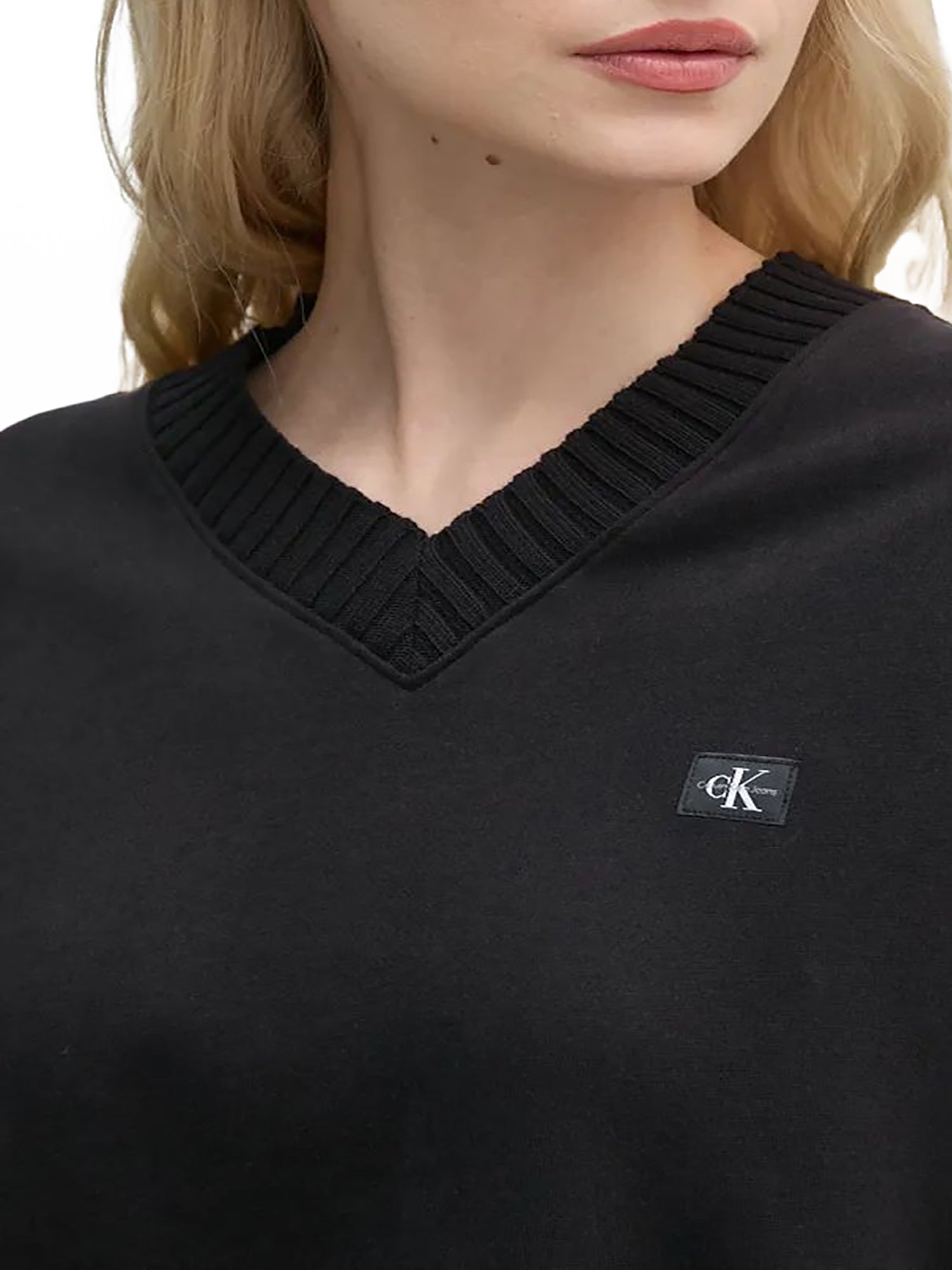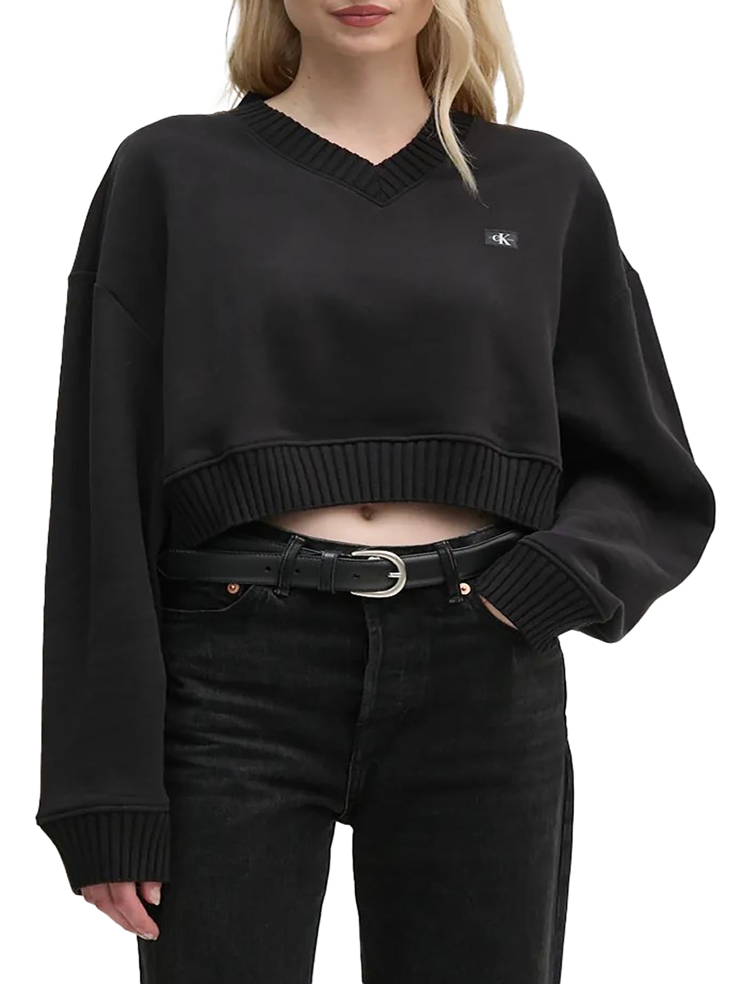 Felpa Calvin Klein Jeans, modello corto slip on, con scollo a v ed elastico in vita, al collo e sui polsi, con patch del logo laterale sul petto. Perfetta per creare look casual e moderni, aggiungendo un tocco di eleganza.