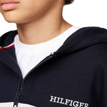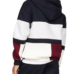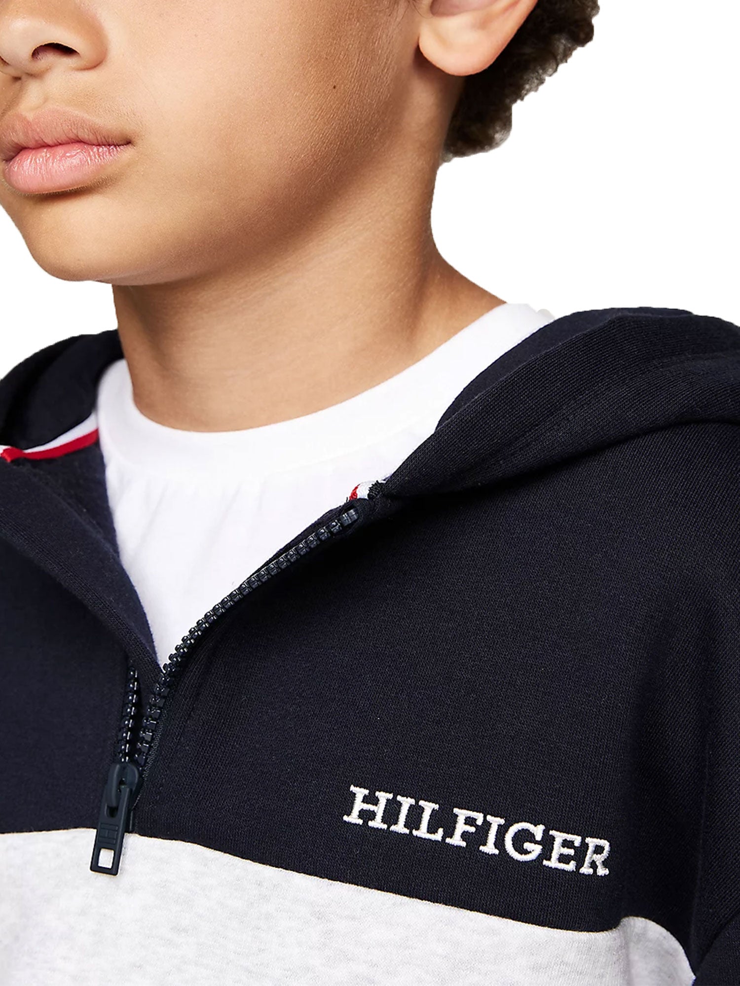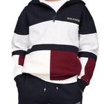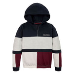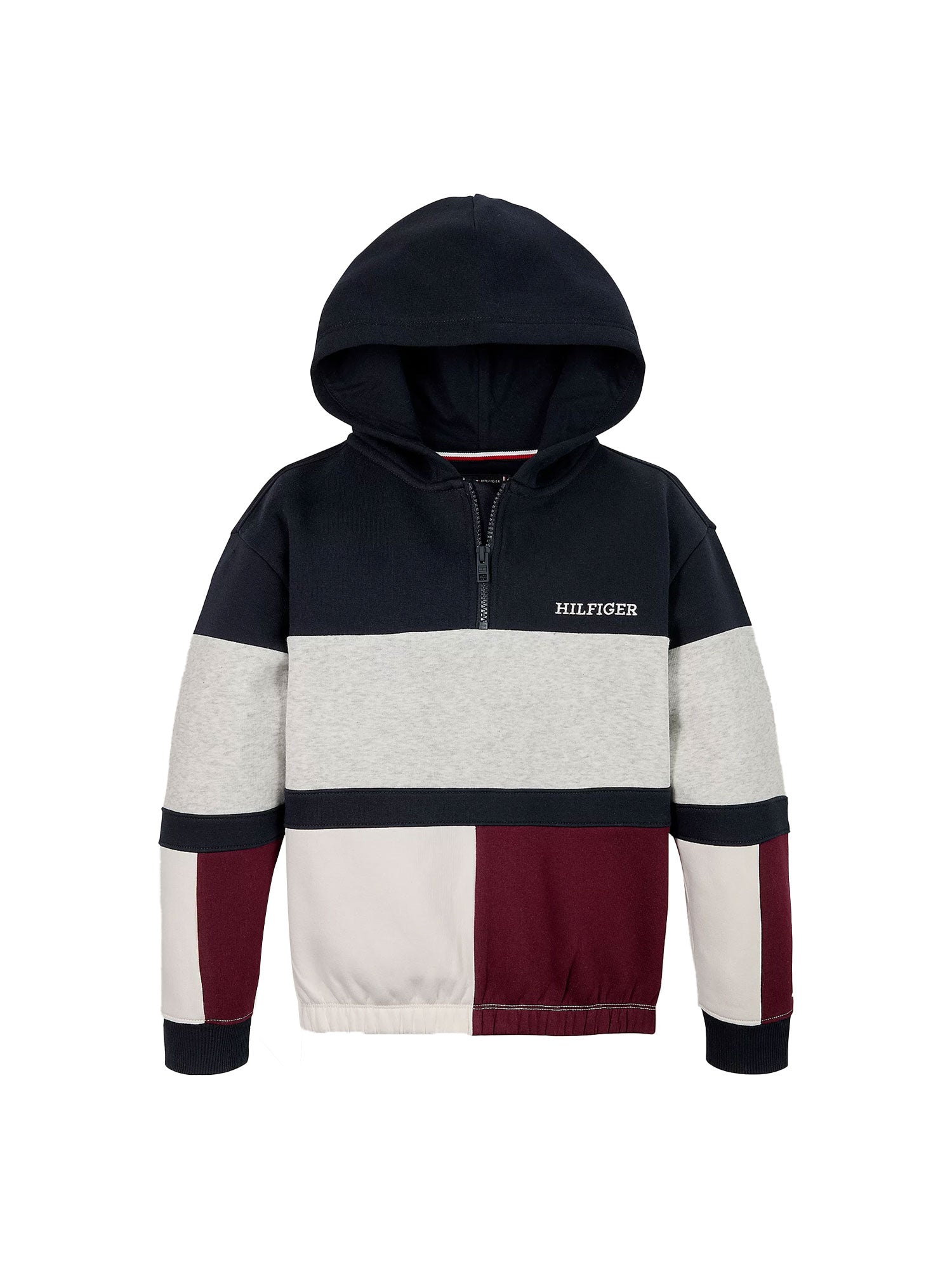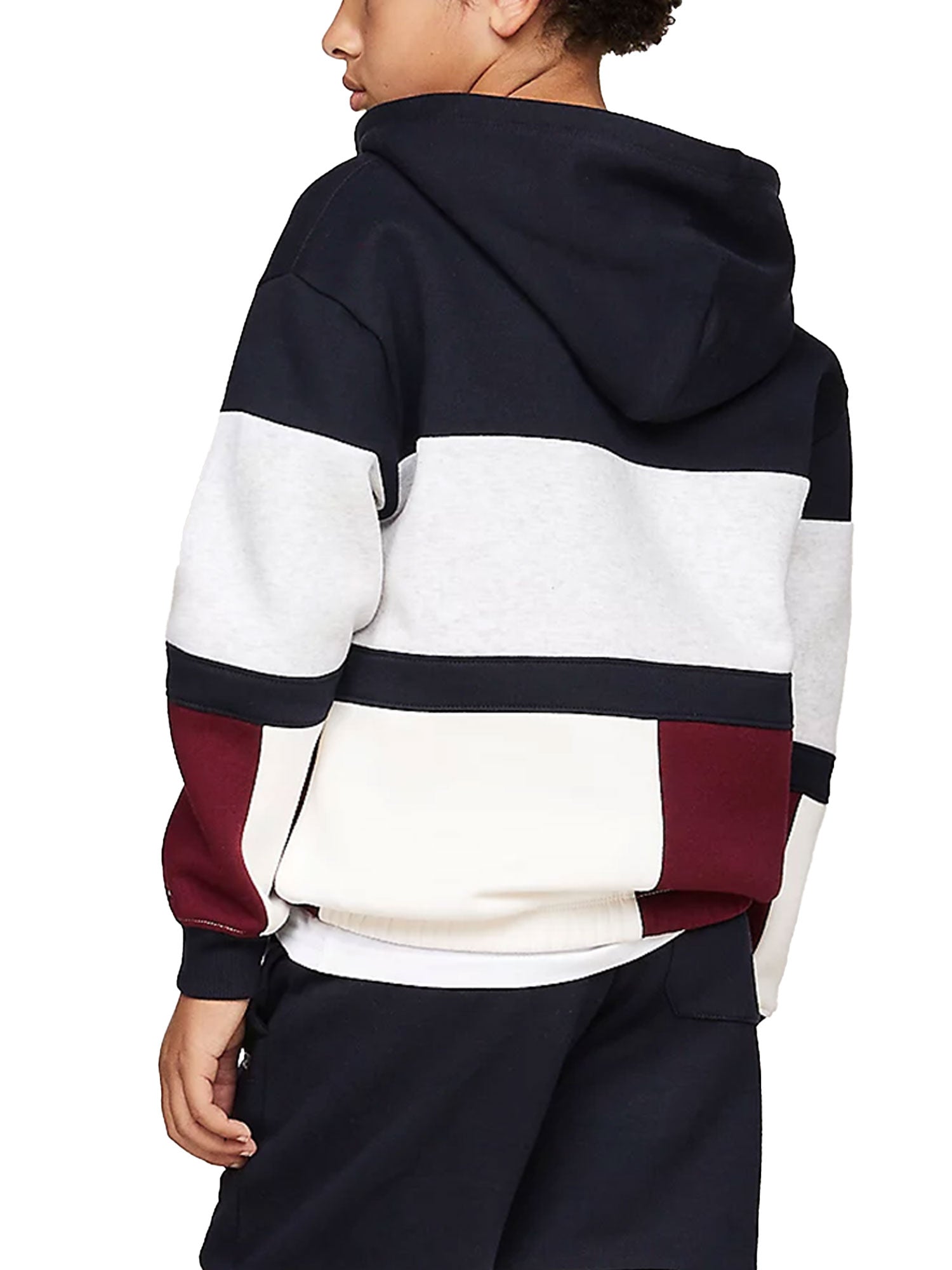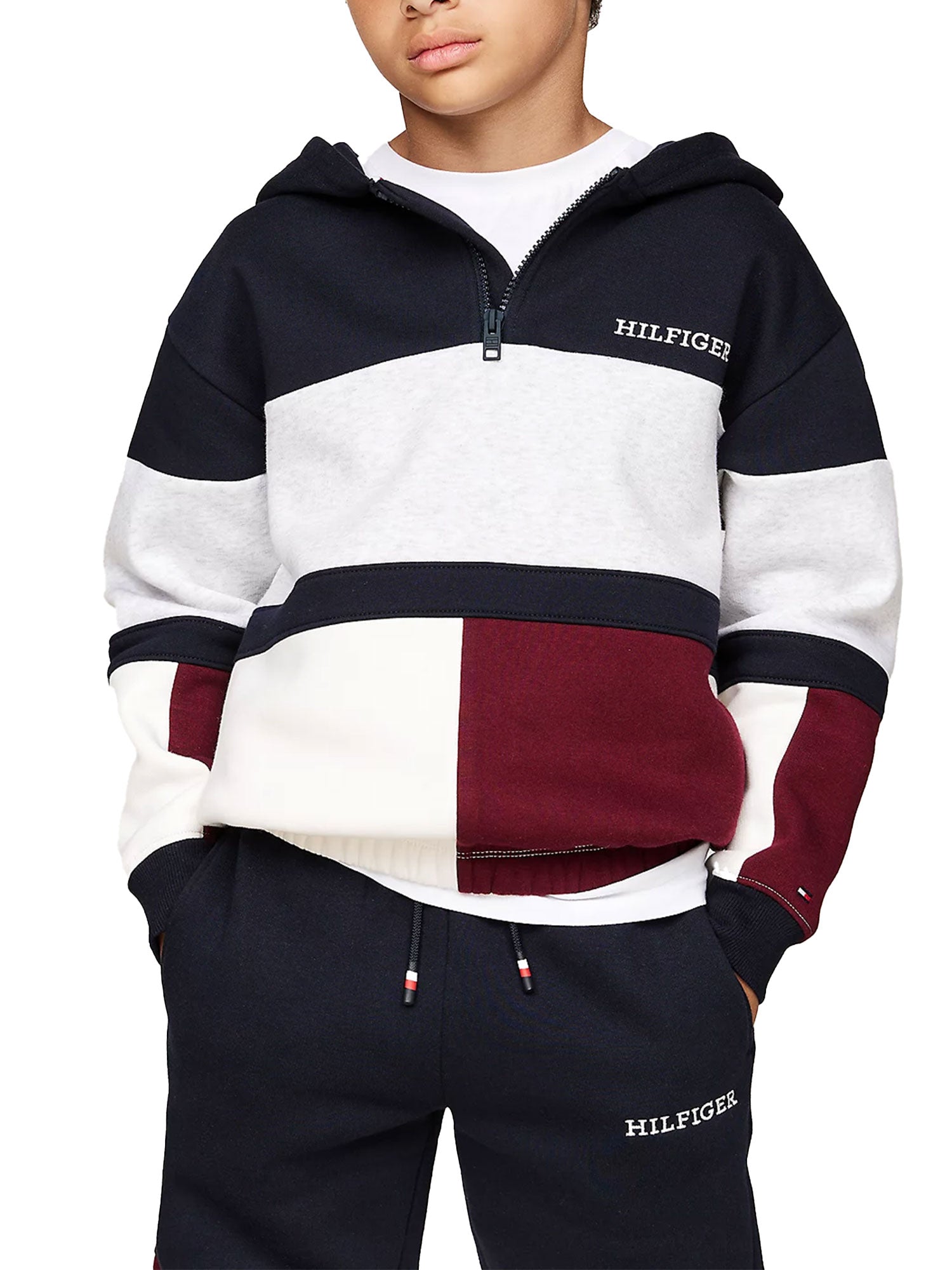Felpa bambino con cappuccio completata dal motivo color block e dalla chiusura con mezza zip, per sfoggiare uno stile casual anche nelle giornate più fresche.