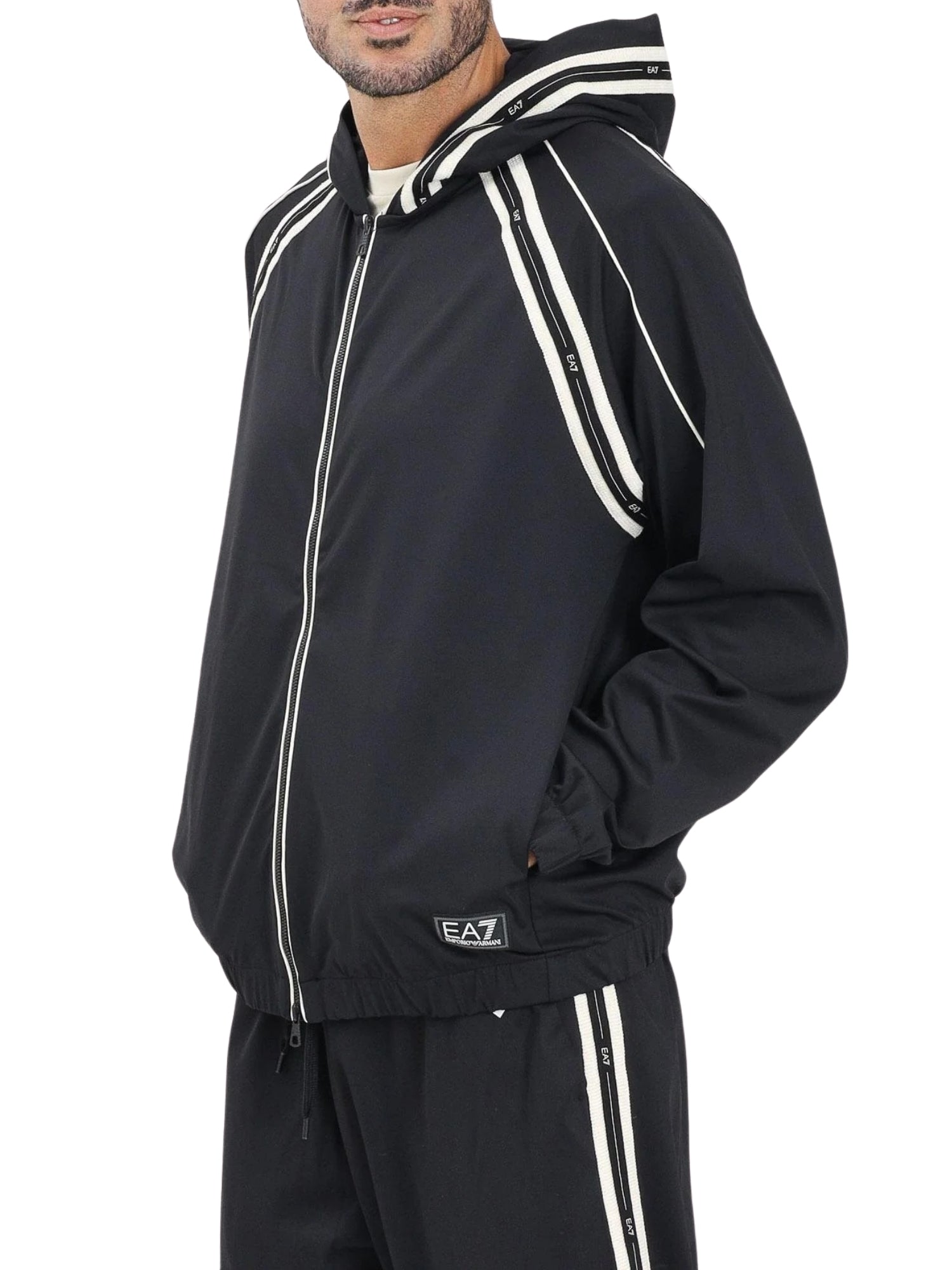 Felpa EA7 con zip nera da uomo arricchita da bande laterali e sul cappuccio con dettagli logo nero