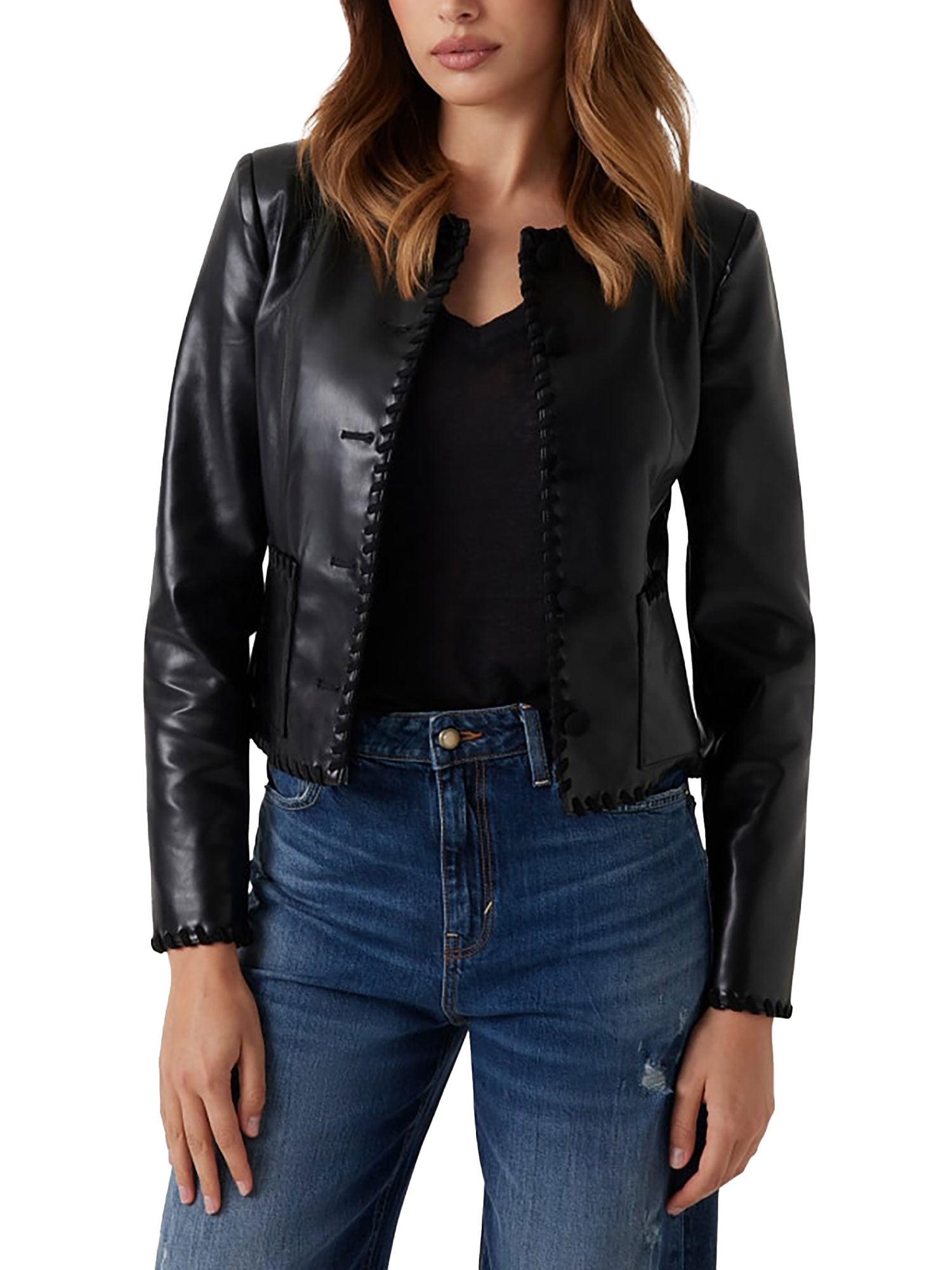 Giacca in ecopelle saffiano Guess donna Leontite Embro Stitch con laccetti e bottoni. Un capo raffinato e sofisticato, caratterizzato da dettagli ricercati che donano un’eleganza moderna e distintiva. Perfetta per completare outfit casual-chic o aggiungere un tocco glam a look serali.