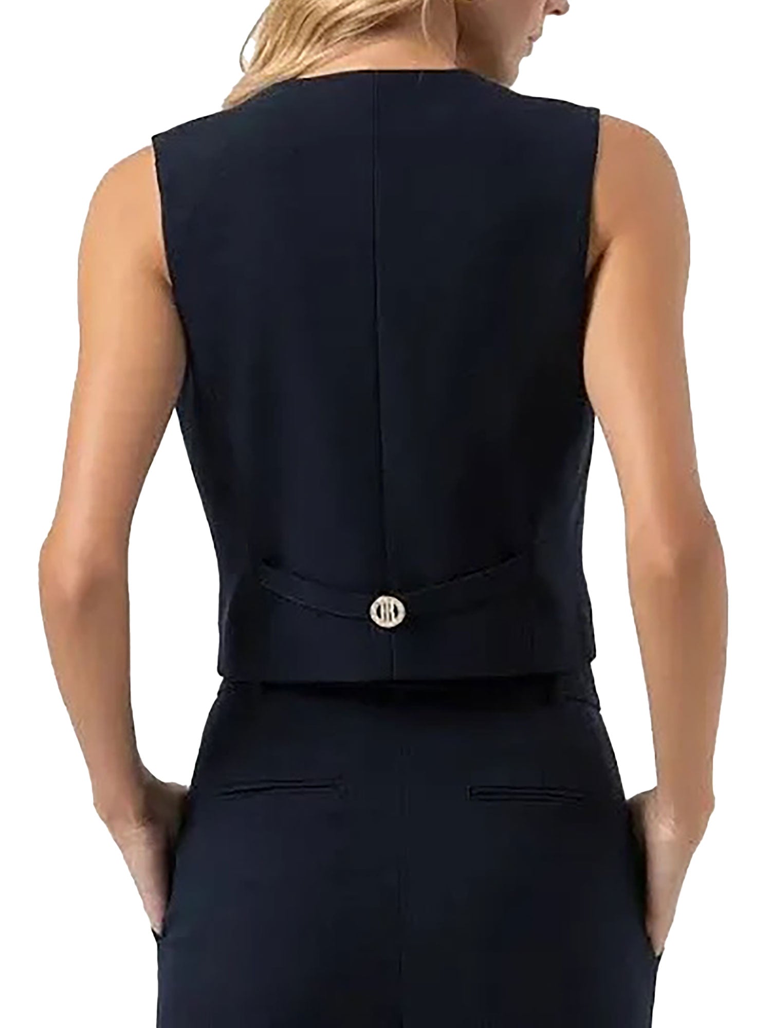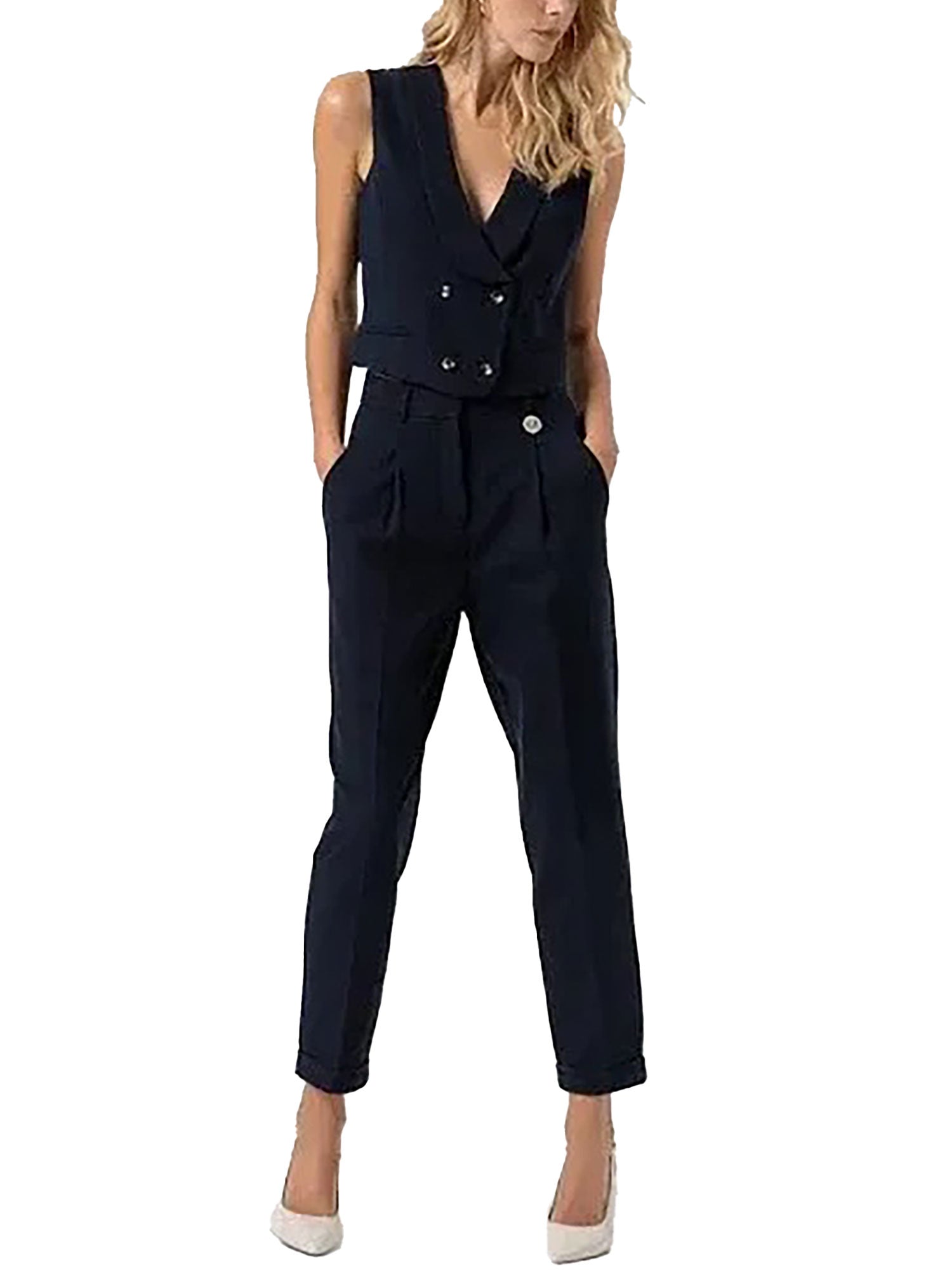 Gilet Fracomina doppiopetto, realizzato in tessuto fluido e valorizzato da una linea strutturata. Il modello presenta uno stile doppiopetto con bottoni metallici e scollo a revers, perfetto da abbinare al blazer coordinato per un look sofisticato e moderno.