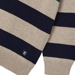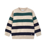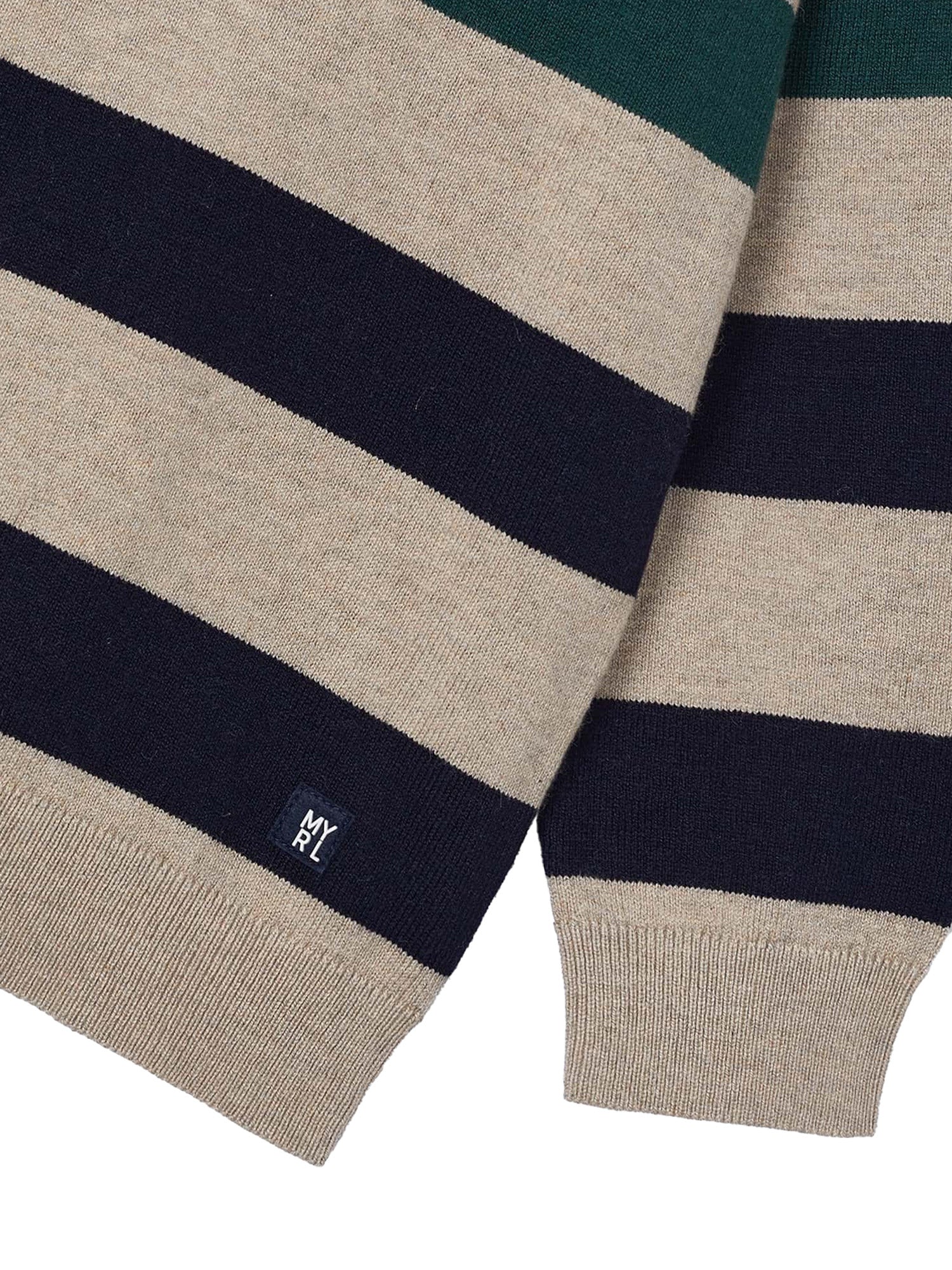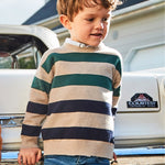 Maglione Mayoral da bambino ha un design a righe orizzontali in tonalità beige, verde e blu navy. Il modello è semplice e casual, perfetto per essere indossato quotidianamente o per occasioni informali. Le righe larghe e contrastanti conferiscono un look moderno e fresco. Realizzato in un tessuto morbido e caldo, è ideale per le giornate più fresche.