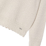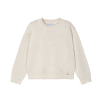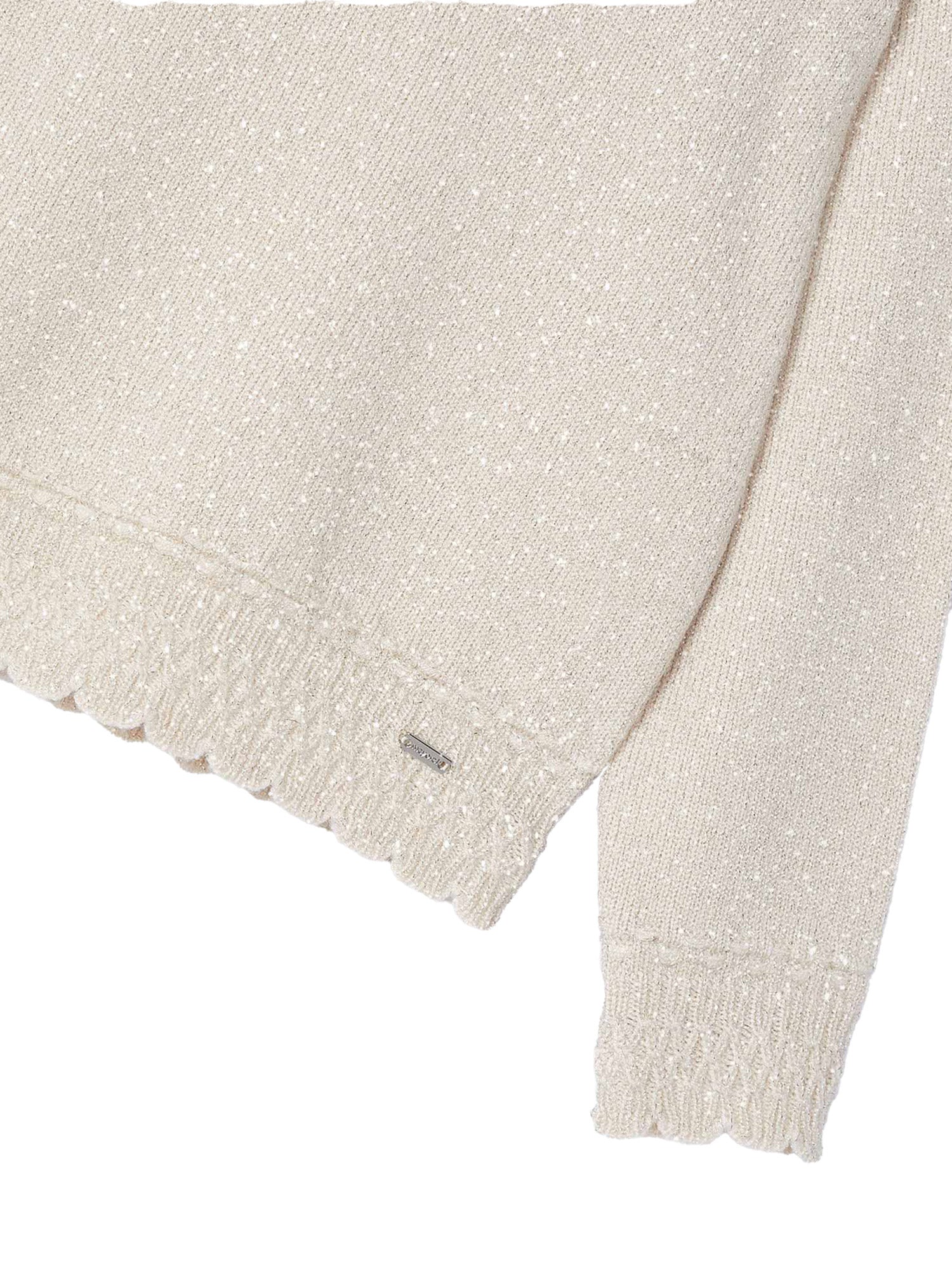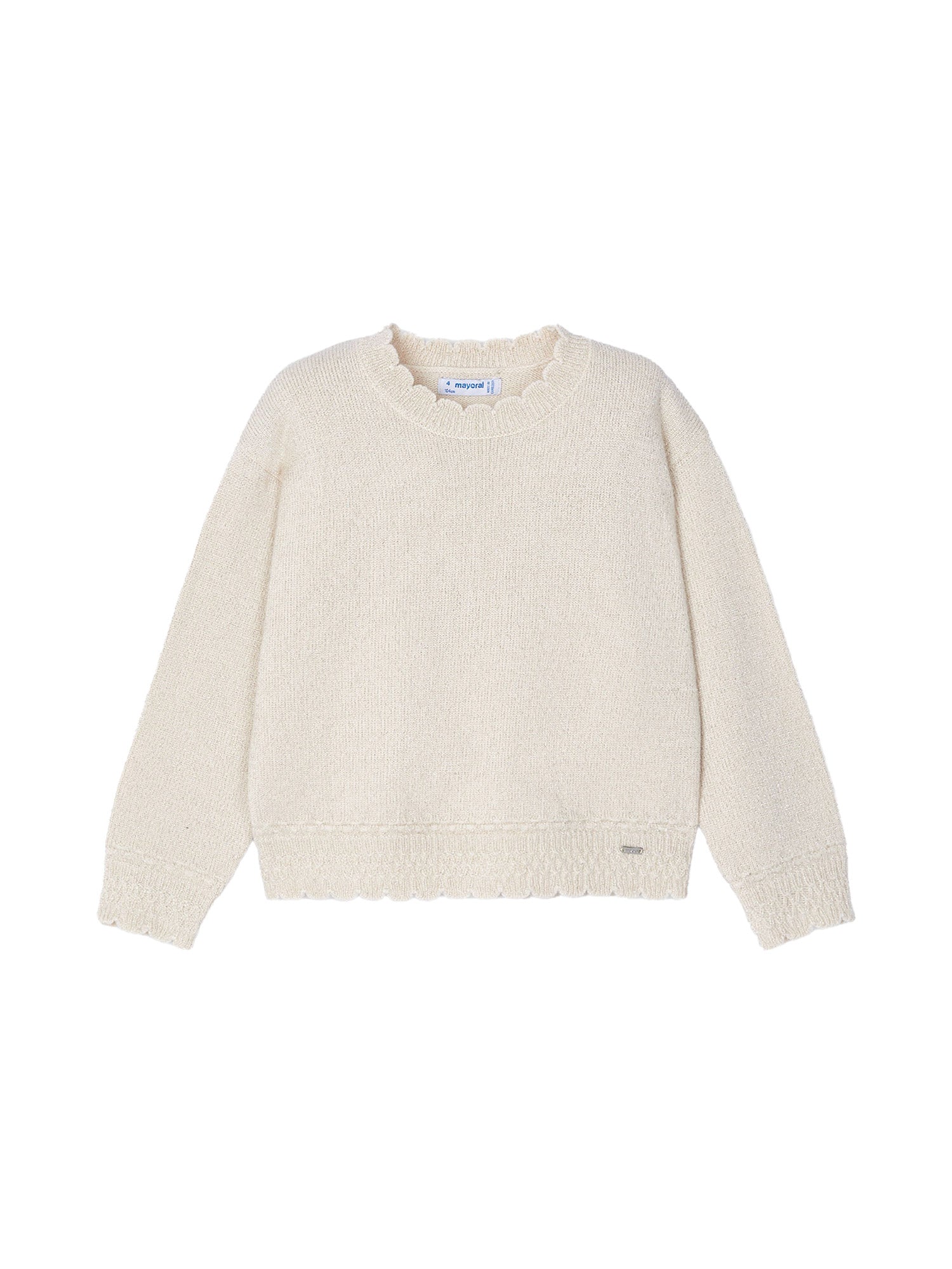 Questo maglione per bambina in un delicato color crema è perfetto per le giornate più fredde, grazie al suo tessuto morbido e caldo. Il design è semplice ma arricchito da dettagli femminili che lo rendono unico. Il collo, l'orlo e i polsini sono decorati con una lavorazione a bordi ondulati che dona un tocco romantico al capo, rendendolo ideale per look sia casual che eleganti.