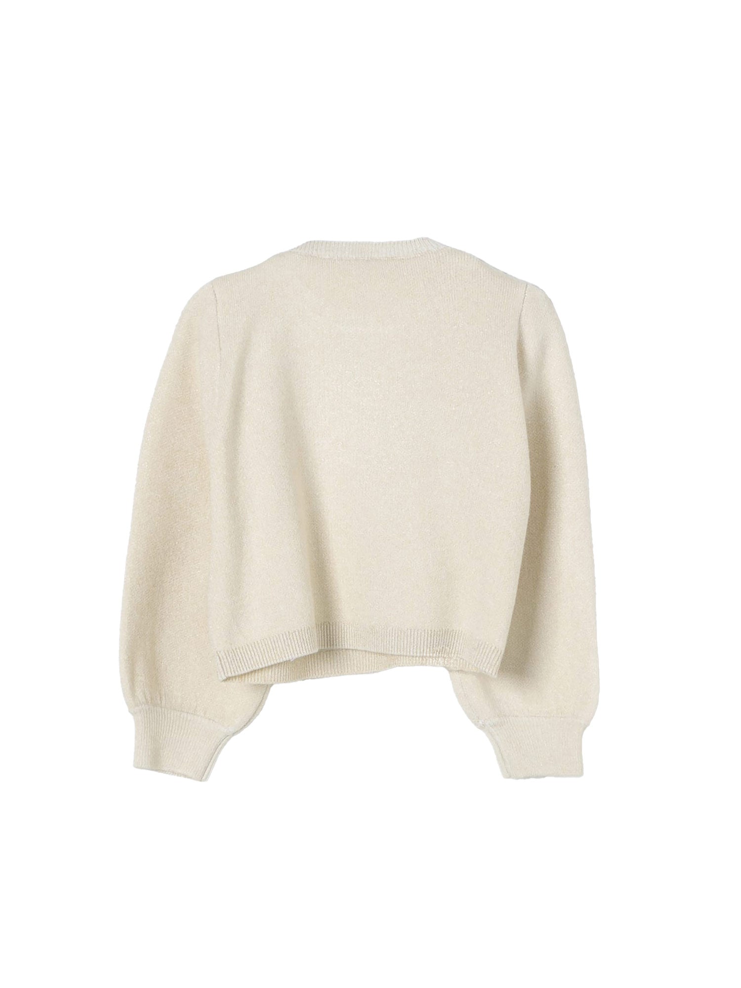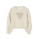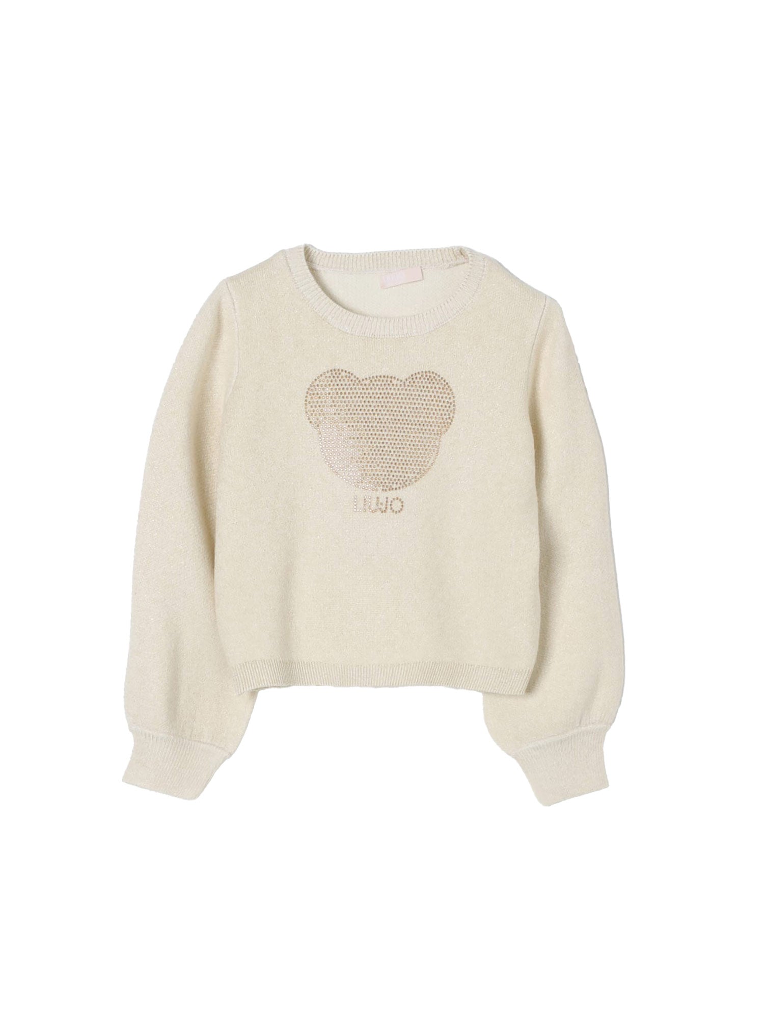 Maglione LiuJo da bambina color crema in tessuto morbido, decorato con un motivo scintillante a forma di orsetto sul davanti. Questo capo dal taglio comodo è perfetto per le bambine che desiderano uno stile dolce e chic. Il dettaglio dell'orsetto aggiunge un tocco giocoso e luminoso, ideale per un look casual e femminile.