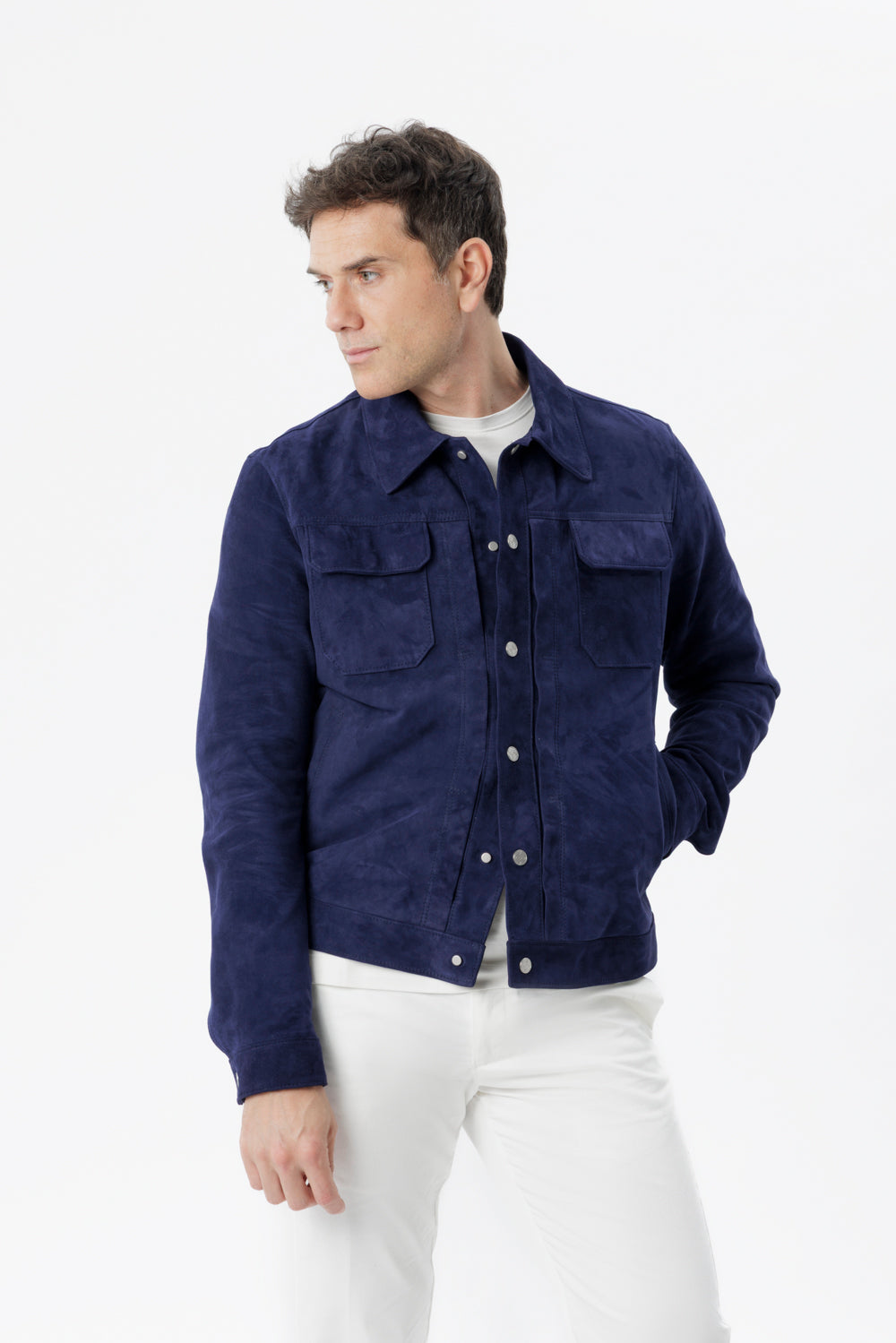 Giubbino realizzato in pregiato camoscio con ispirazione casual. La texture morbida e lievemente cangiante del pellame si accorda perfettamente con i dettagli sportivi dei taschini a toppa con pattina e dei bottoni in galvanica personalizzati. La vestibilità offre volumi regolari e confortevoli.
