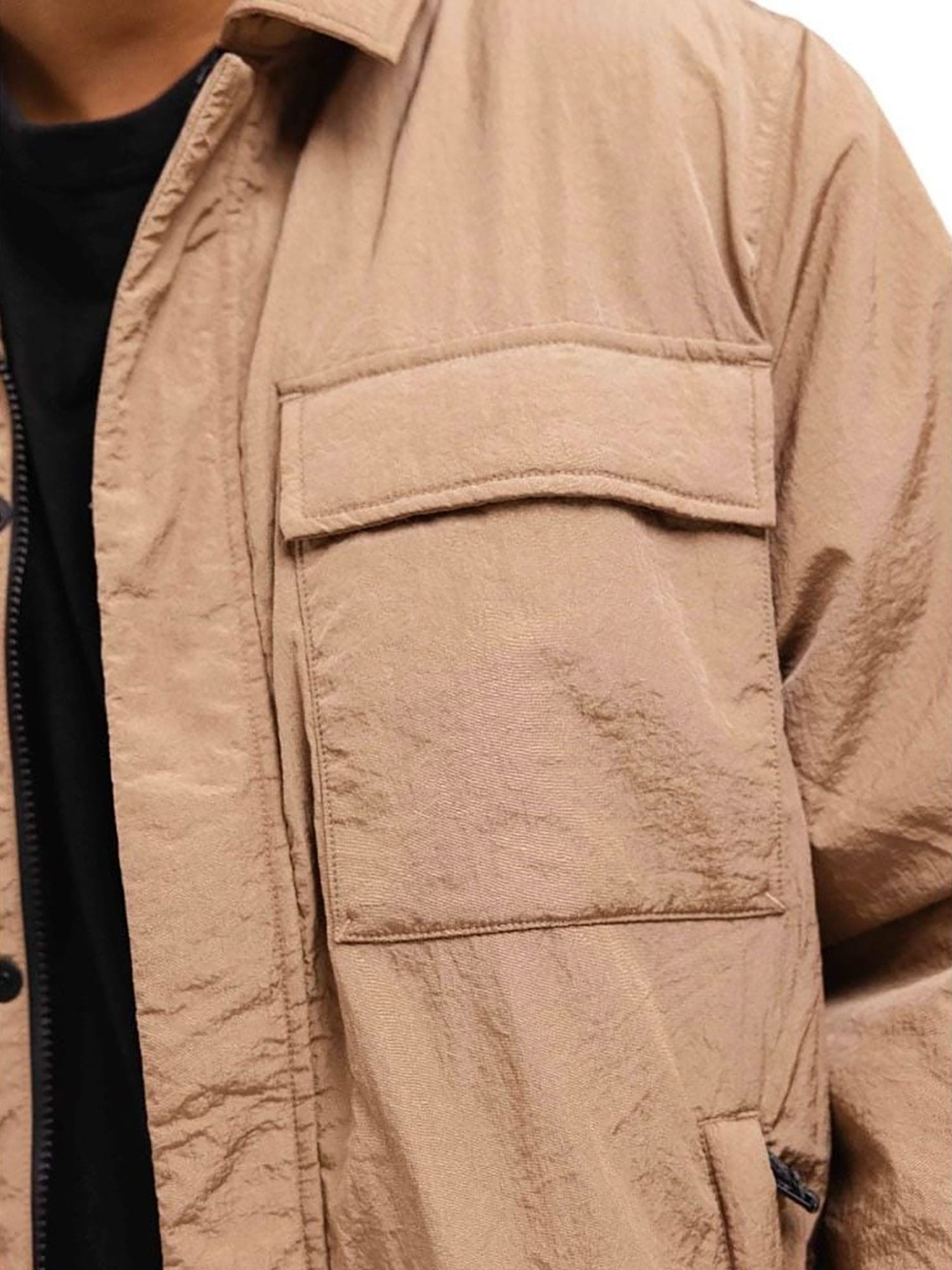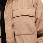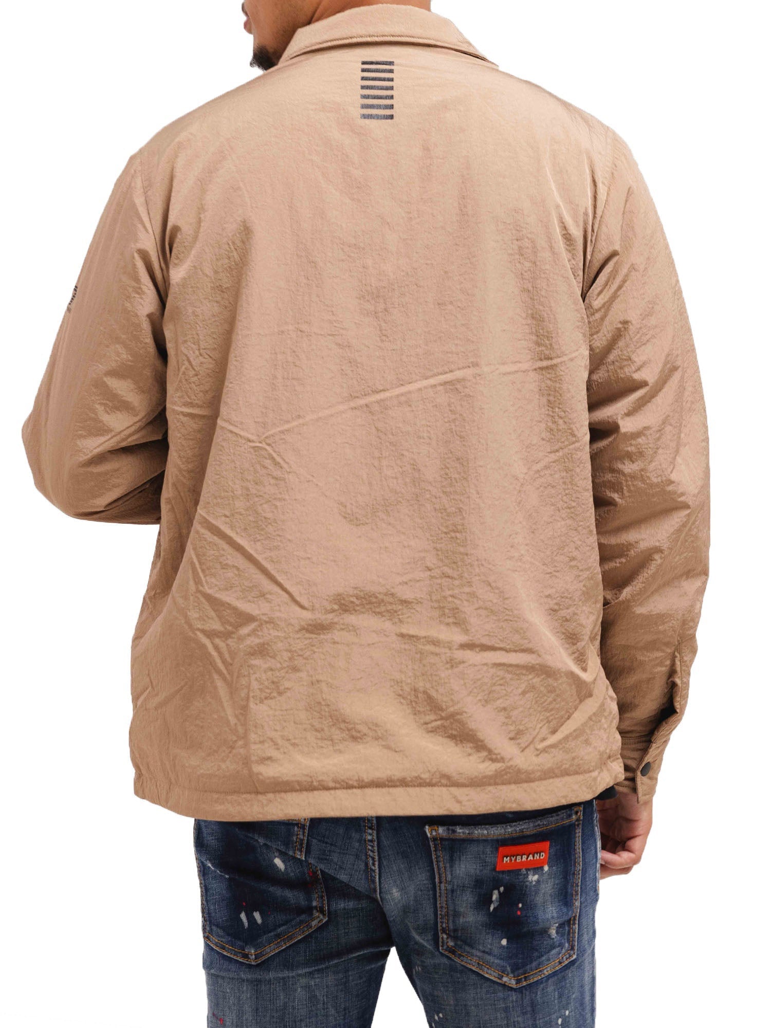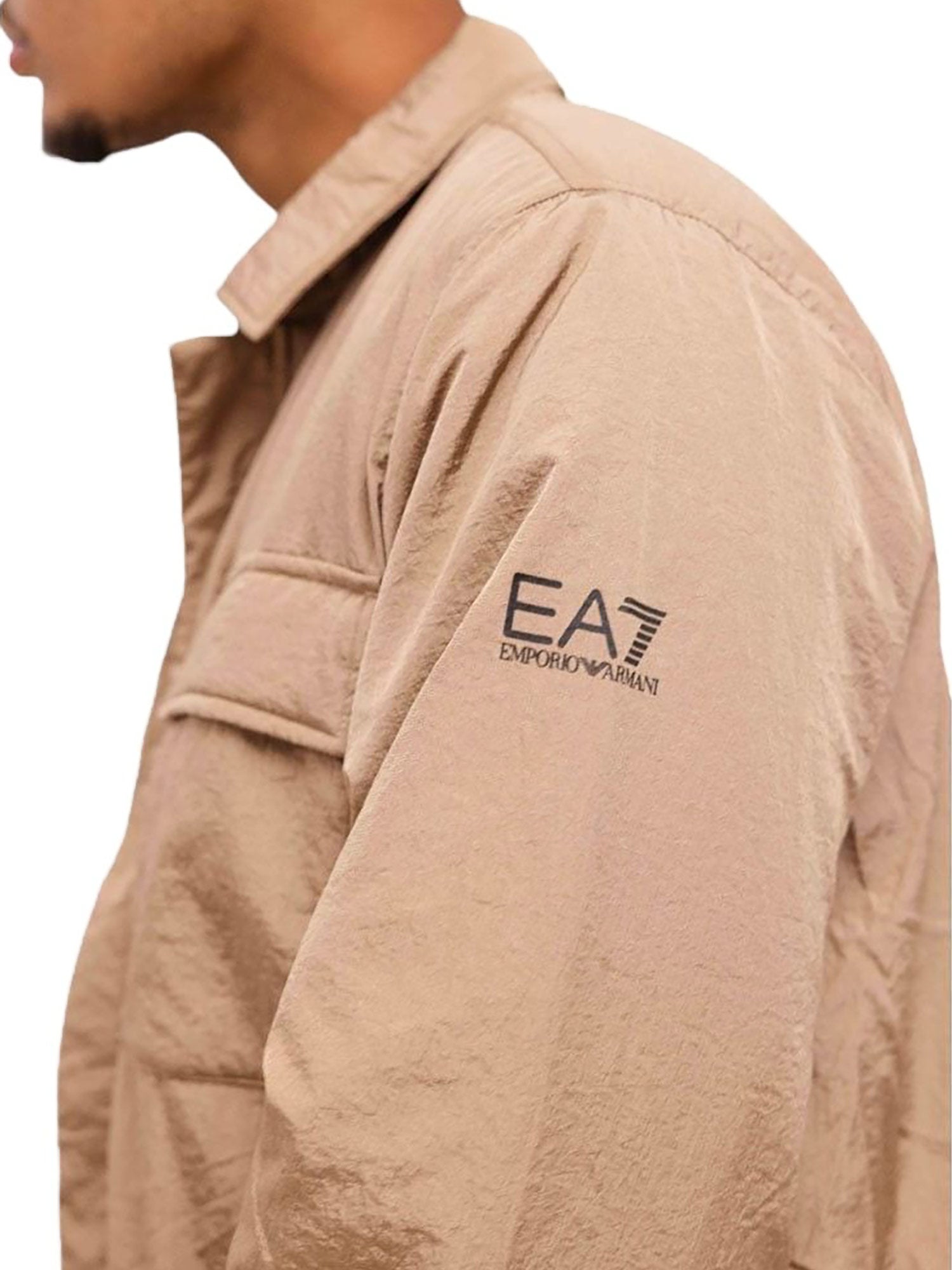 Giacca EA7 Emporio Armani in tessuto tecnico beige, caratterizzata da un design essenziale e funzionale. Presenta due ampie tasche con patta sul petto per un look moderno e pratico. Sulla manica sinistra è presente il logo EA7, che aggiunge un dettaglio distintivo e sofisticato. Il retro è decorato con un motivo a righe orizzontali sul colletto, conferendo un tocco di stile contemporaneo. Ideale per completare un outfit casual, questa giacca offre un’ottima combinazione di stile e comfort.
