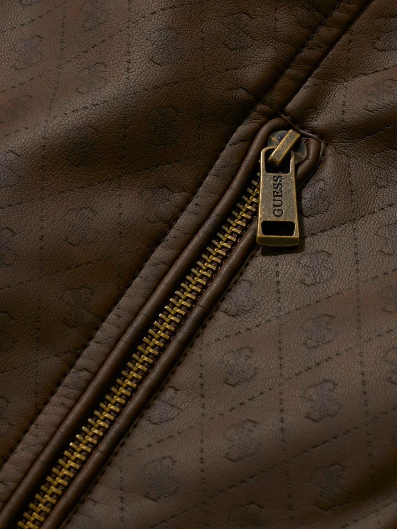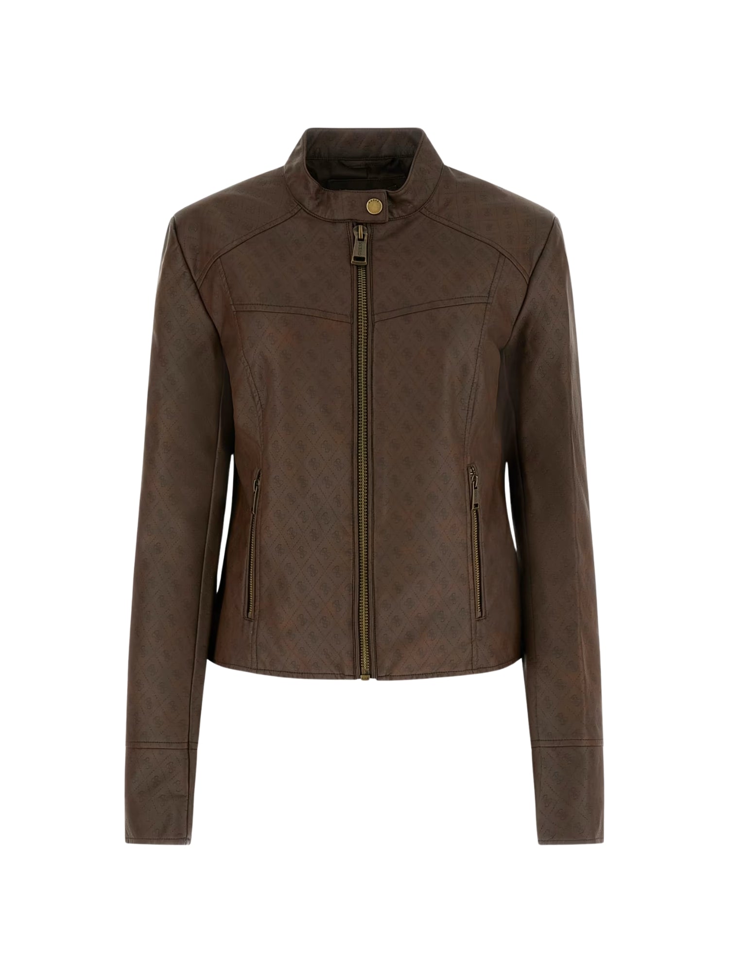 Giubbino con zip Guess donna modello New Anita in PU con logo.un capo dal carattere deciso che unisce stile contemporaneo e femminilità. Perfetto per completare look casual e urbani durante la mezza stagione, aggiungendo un tocco moderno agli outfit quotidiani. 1 chiusura frontale con zip 2 design in similpelle 3 logo forntale 4 tasche lateriali 5 vestibilità regolare