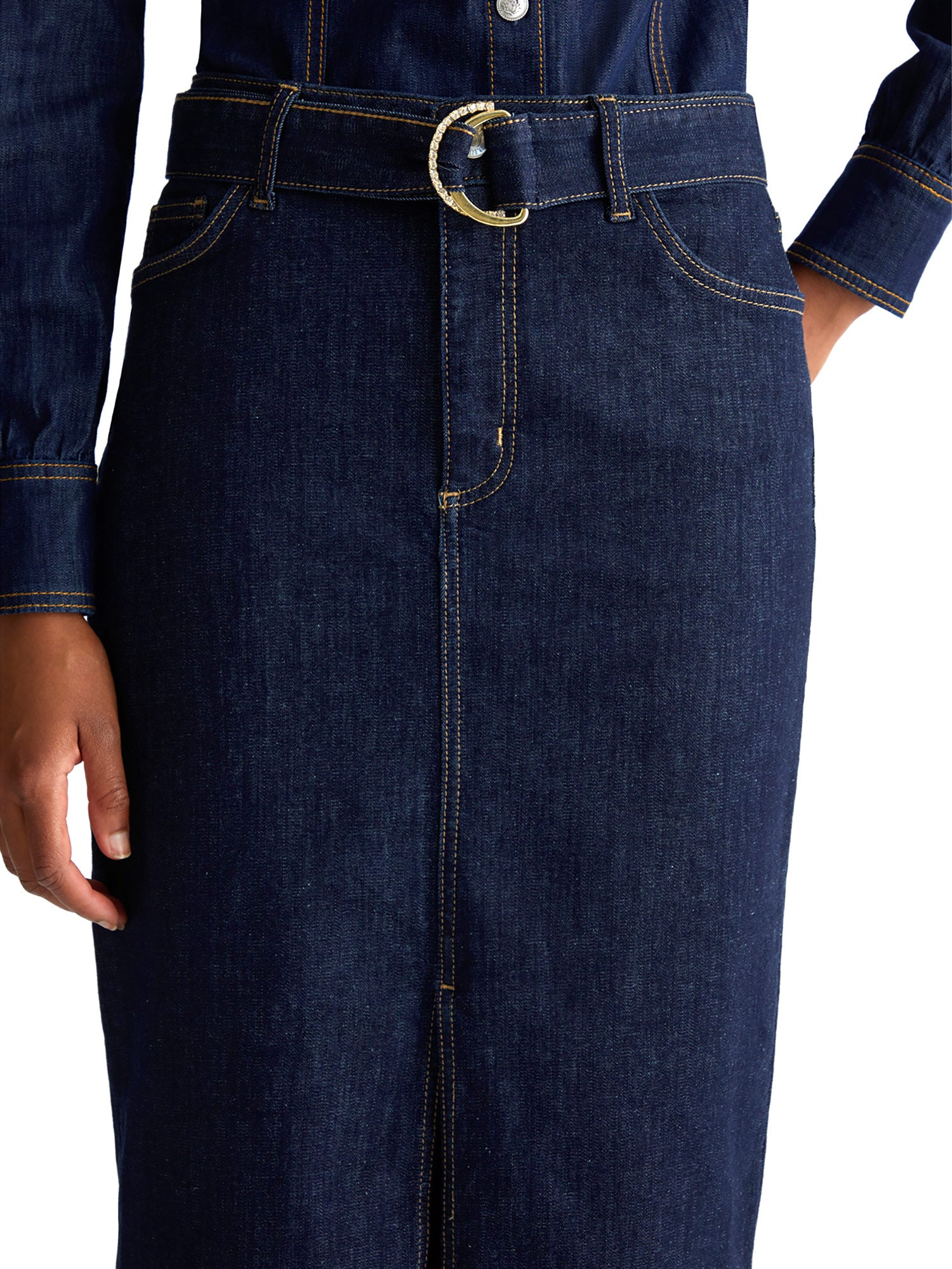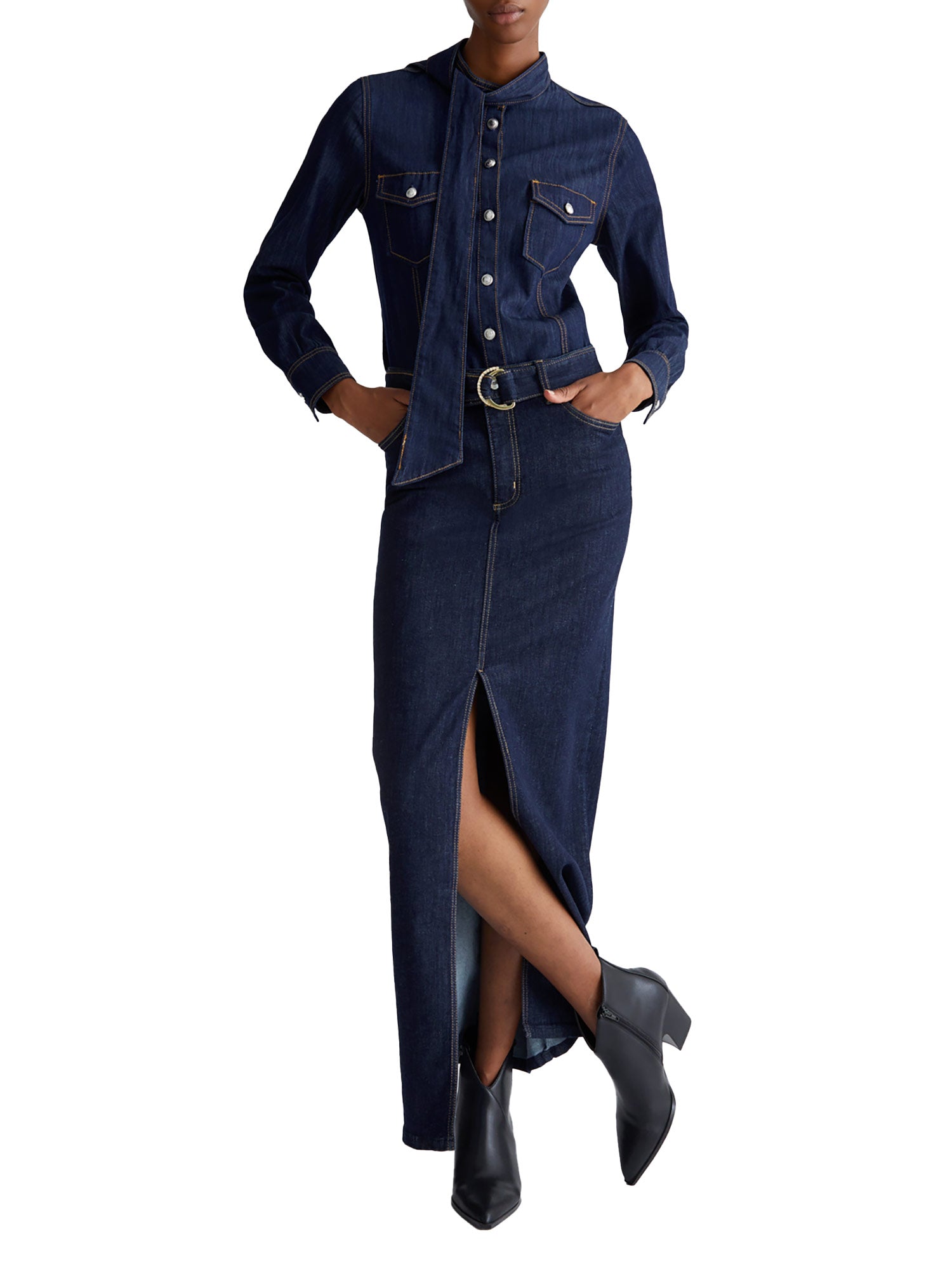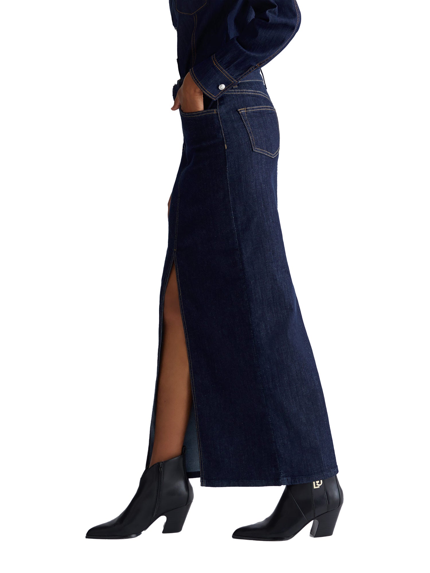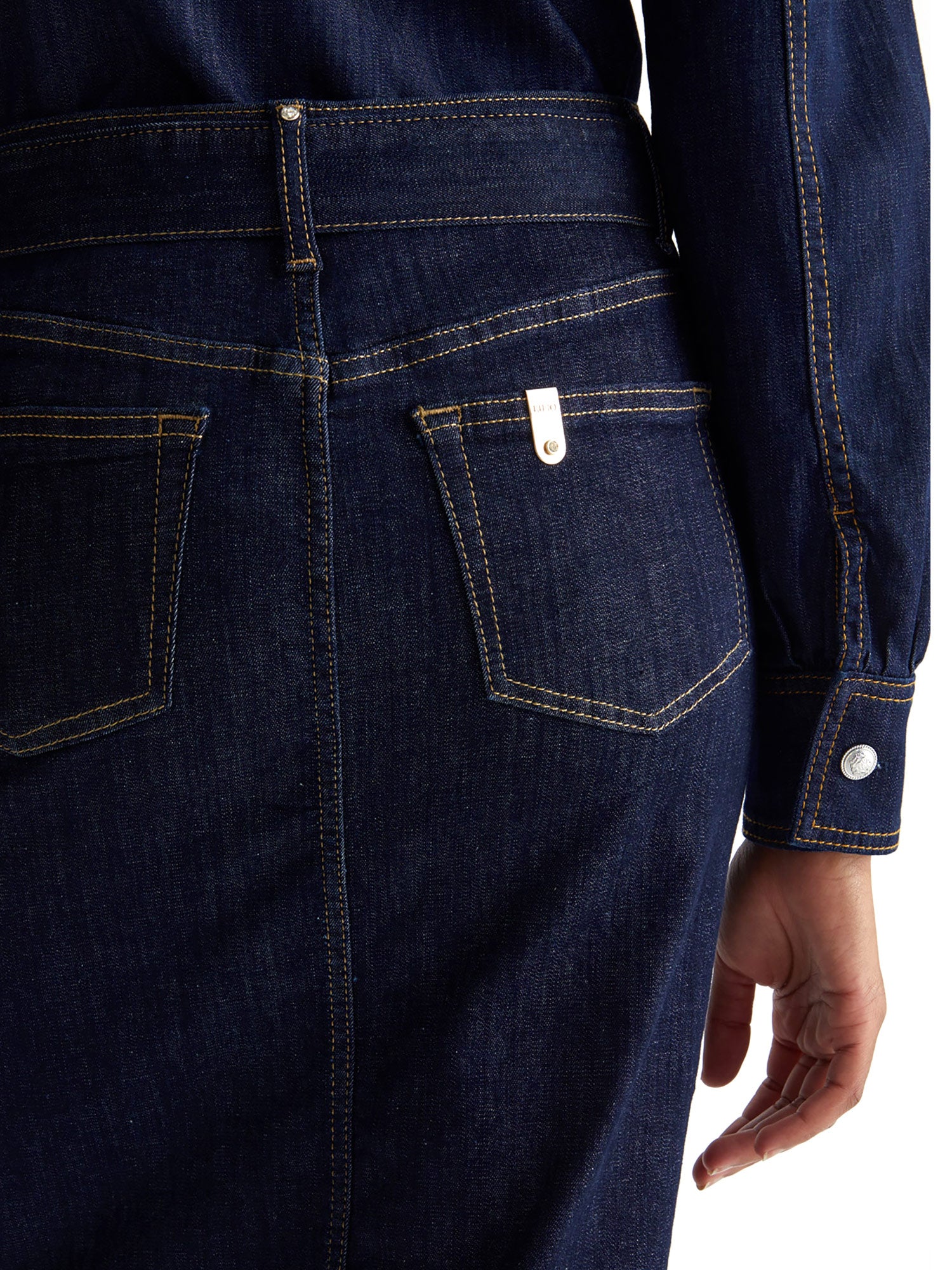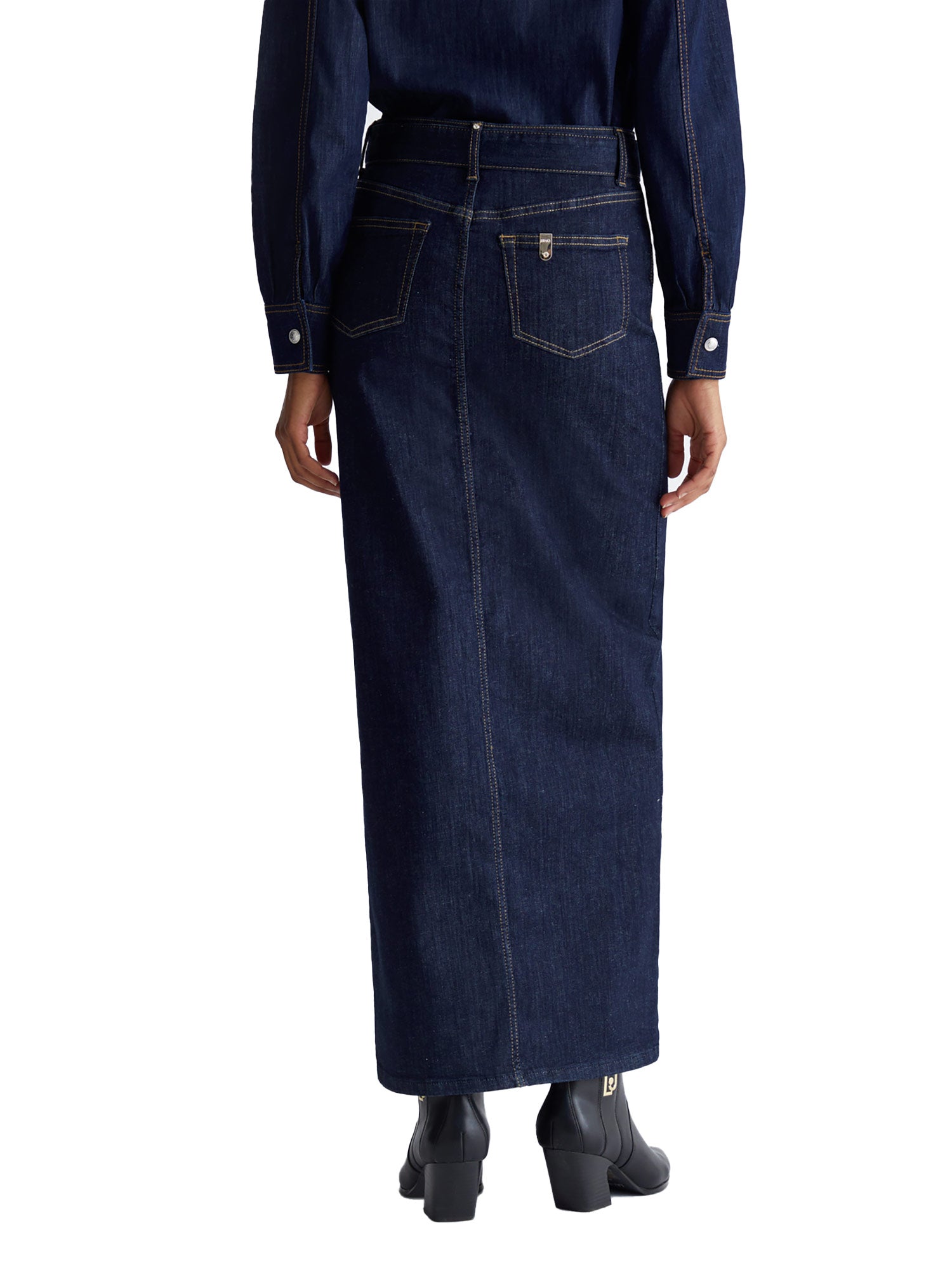 Gonna lunga Liu Jo, modello cinque tasche, in denim elasticizzato misto cotone. Questo modello è perfetto per chi vuole avere un look contemporaneo ma mantenendo uno stile d'impatto grazie al suo spacco e all'aggiunta di stivali o tacchi. Un classico denim scuro , versatile e senza tempo.