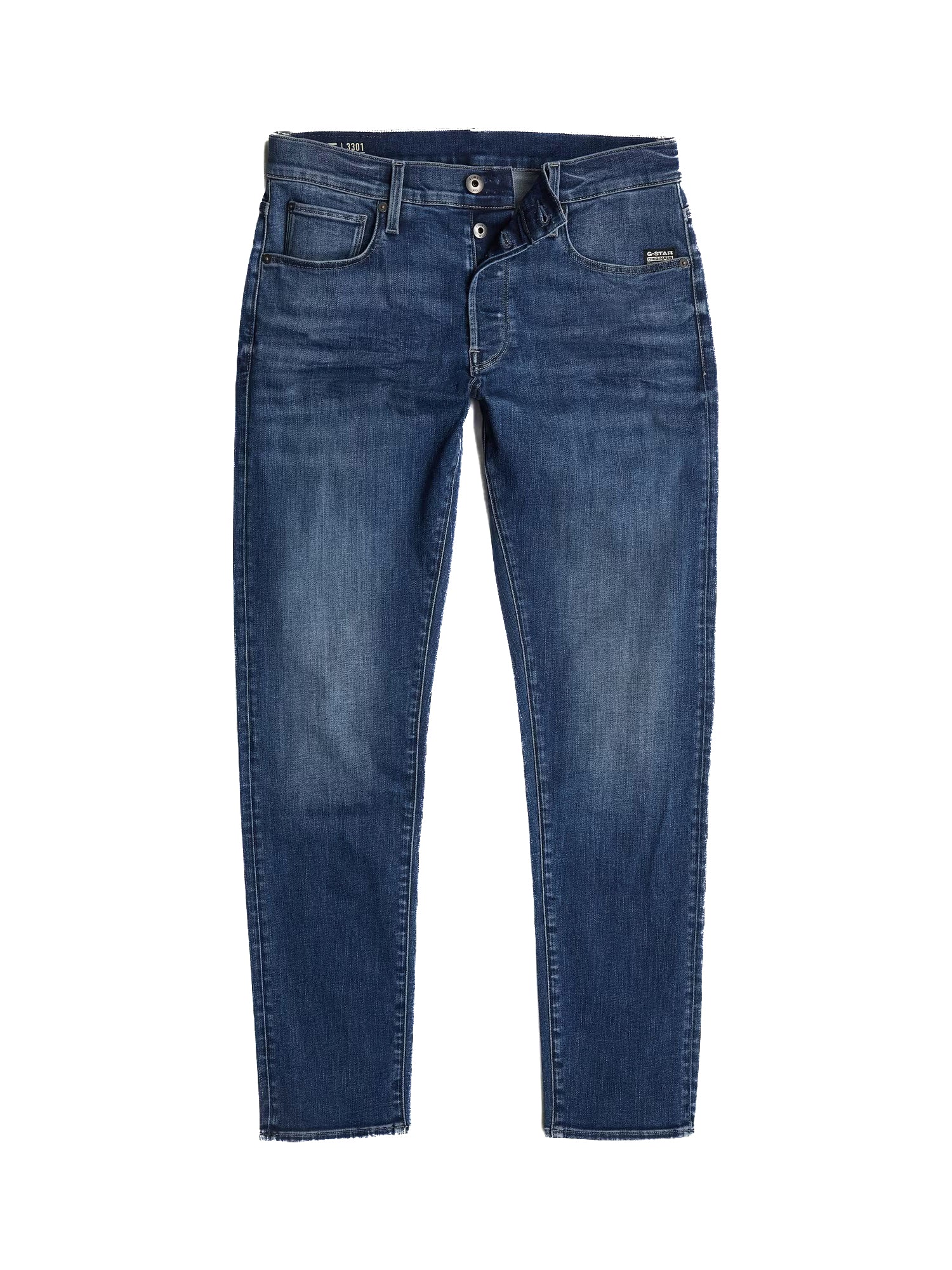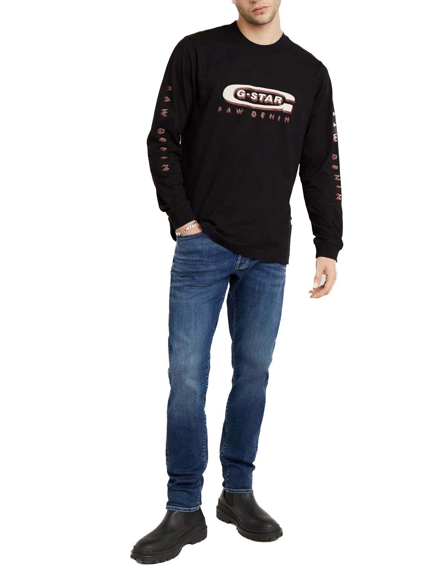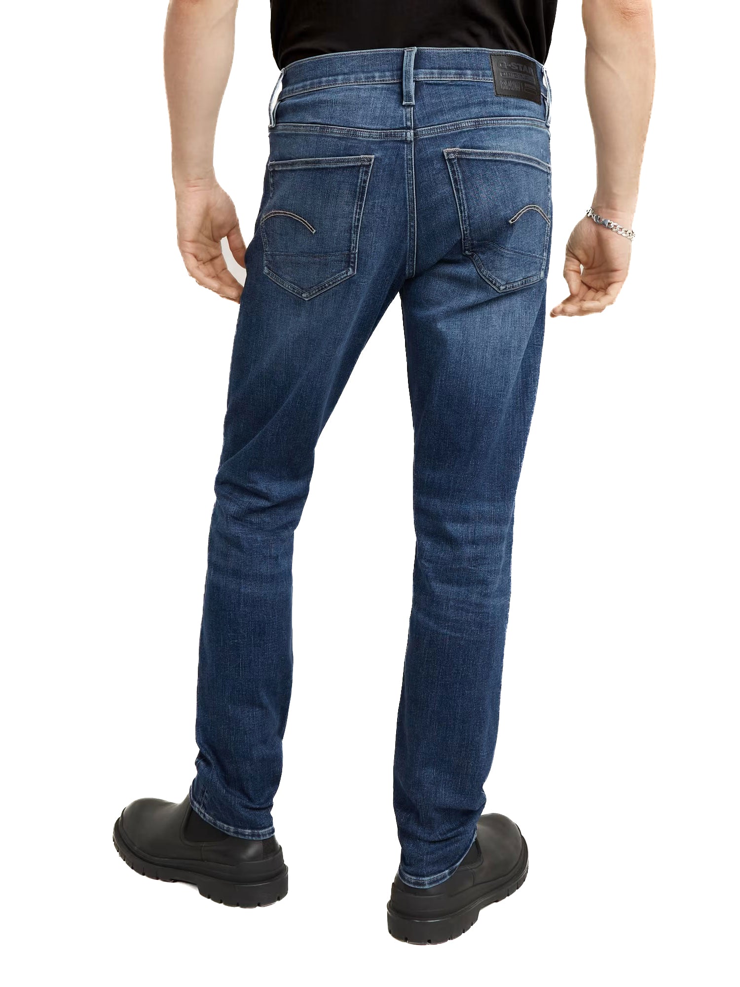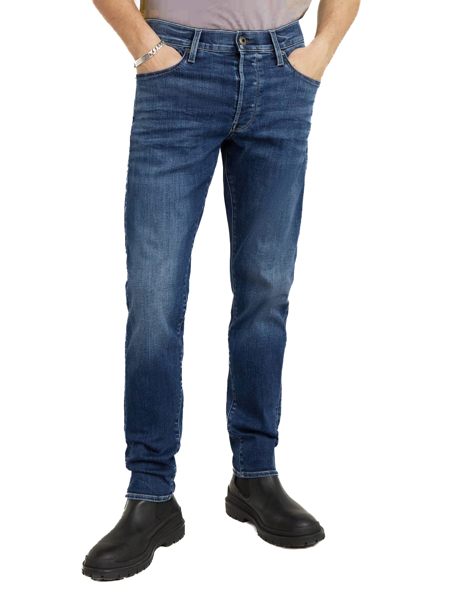 Jeans G-Star Raw da uomo in denim blu medio. Questo modello slim fit presenta una linea affusolata che aderisce al corpo valorizzando la silhouette, senza rinunciare alla comodità grazie al tessuto elasticizzato. Il lavaggio leggermente sbiadito sul fronte e sul retro dona un look moderno e vissuto, ideale per outfit casual quotidiani.