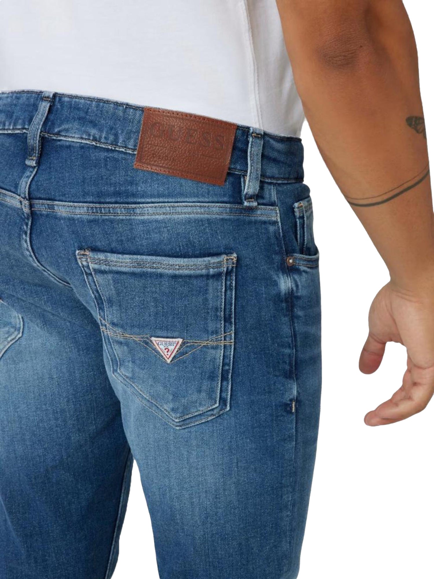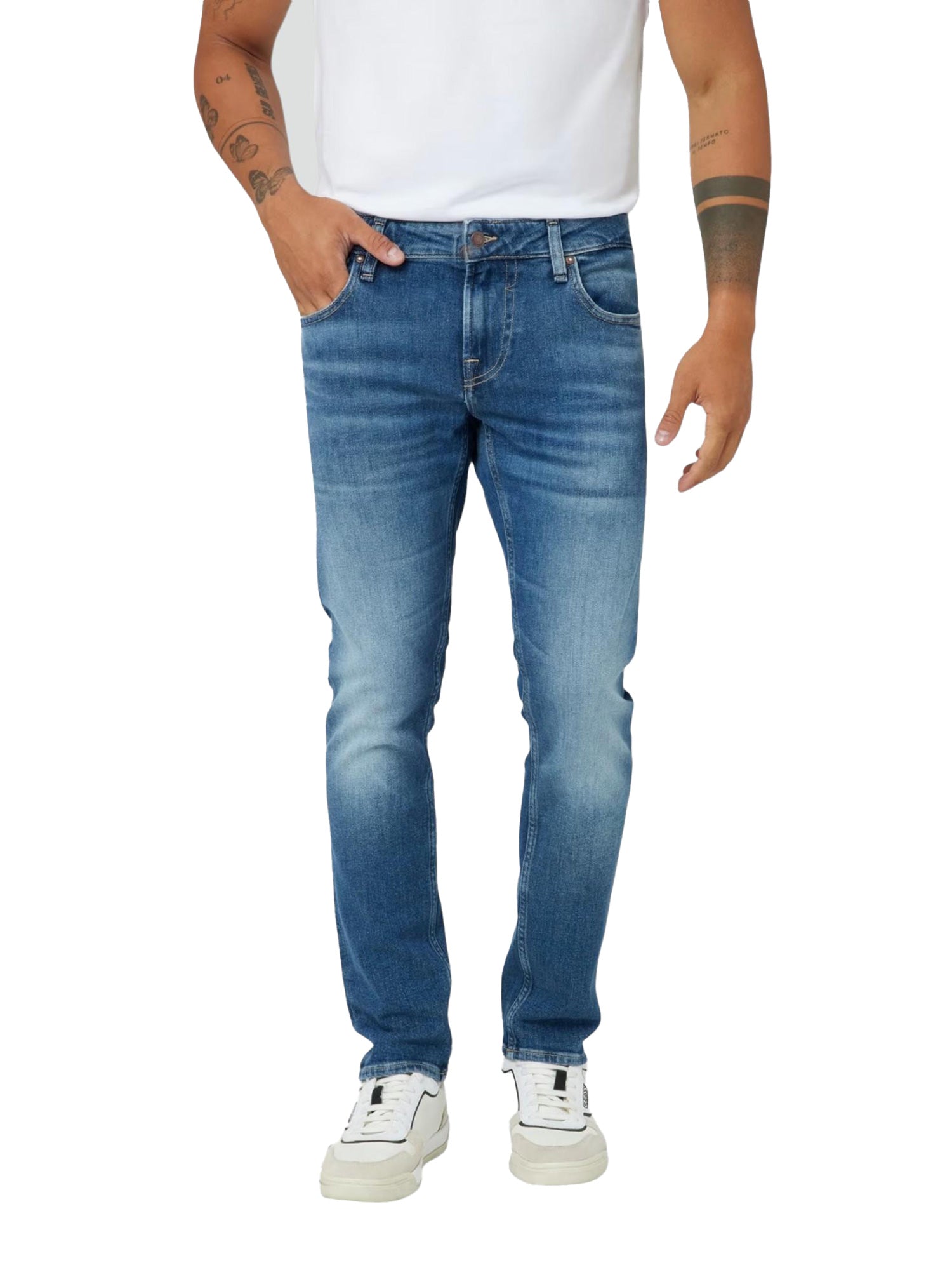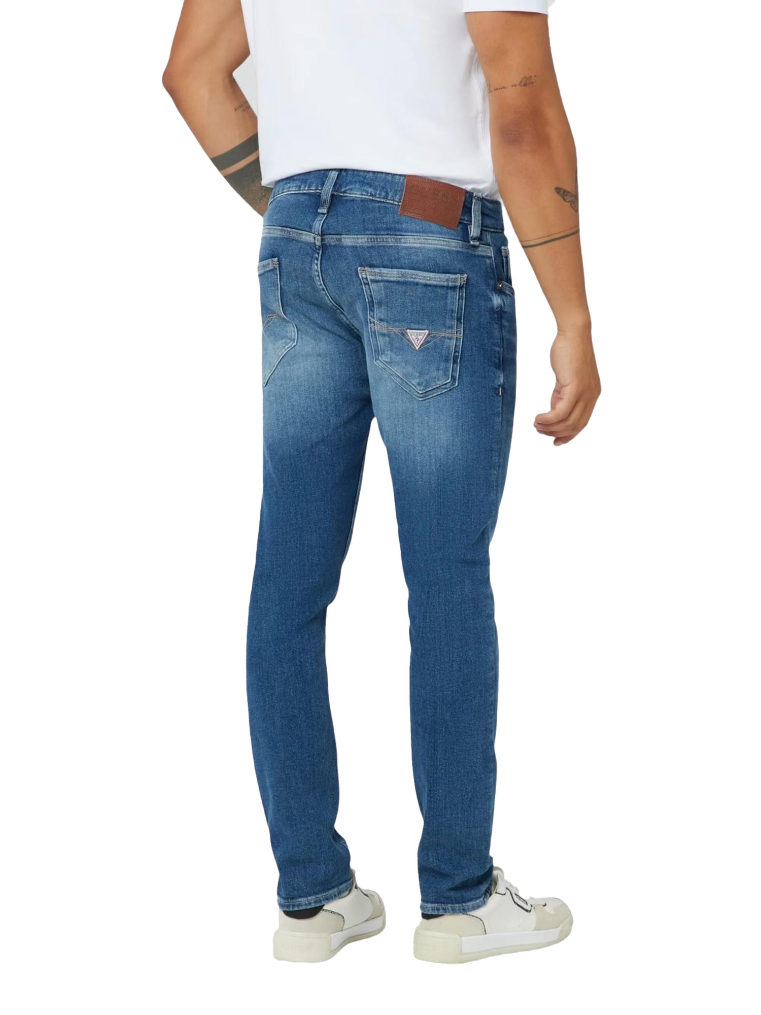 Jeans Guess Uomo, modello Miami. Pantaloni in misto cotone con vestibilità skinny e tessuto in denim lavaggio medio.