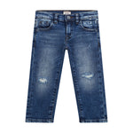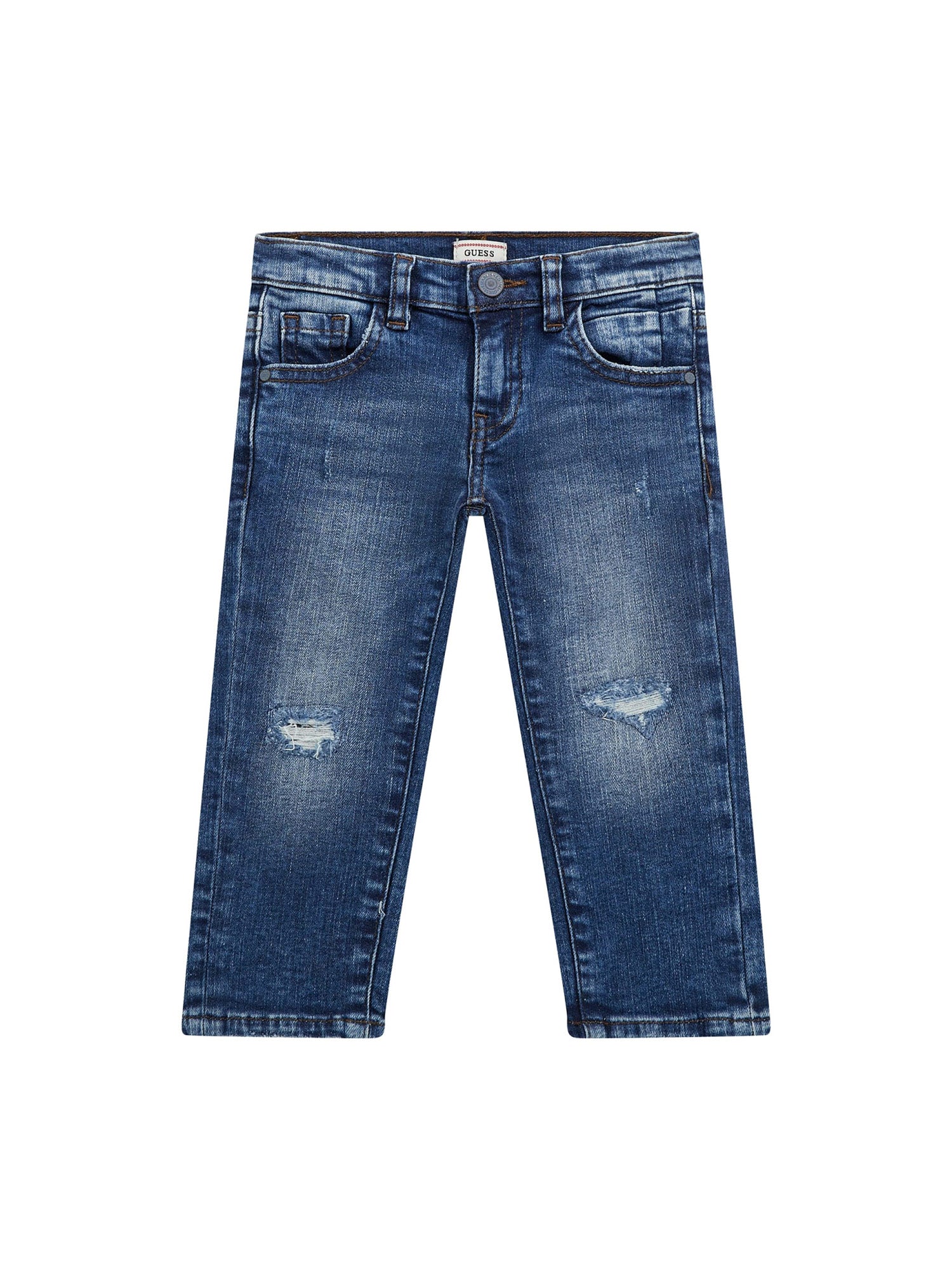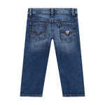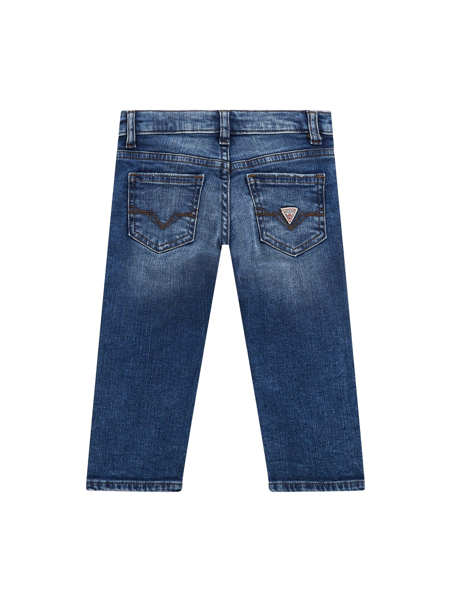 Jeans Guess neonato, un'opzione perfetta per un look trendy e confortevole. Realizzati in denim blu con una vestibilità comoda e moderna, presentano un design con dettagli sbiaditi e strappi che conferiscono loro un aspetto vissuto. Il logo Guess è ricamato sulle tasche posteriori, aggiungendo un tocco di autenticità e stile.