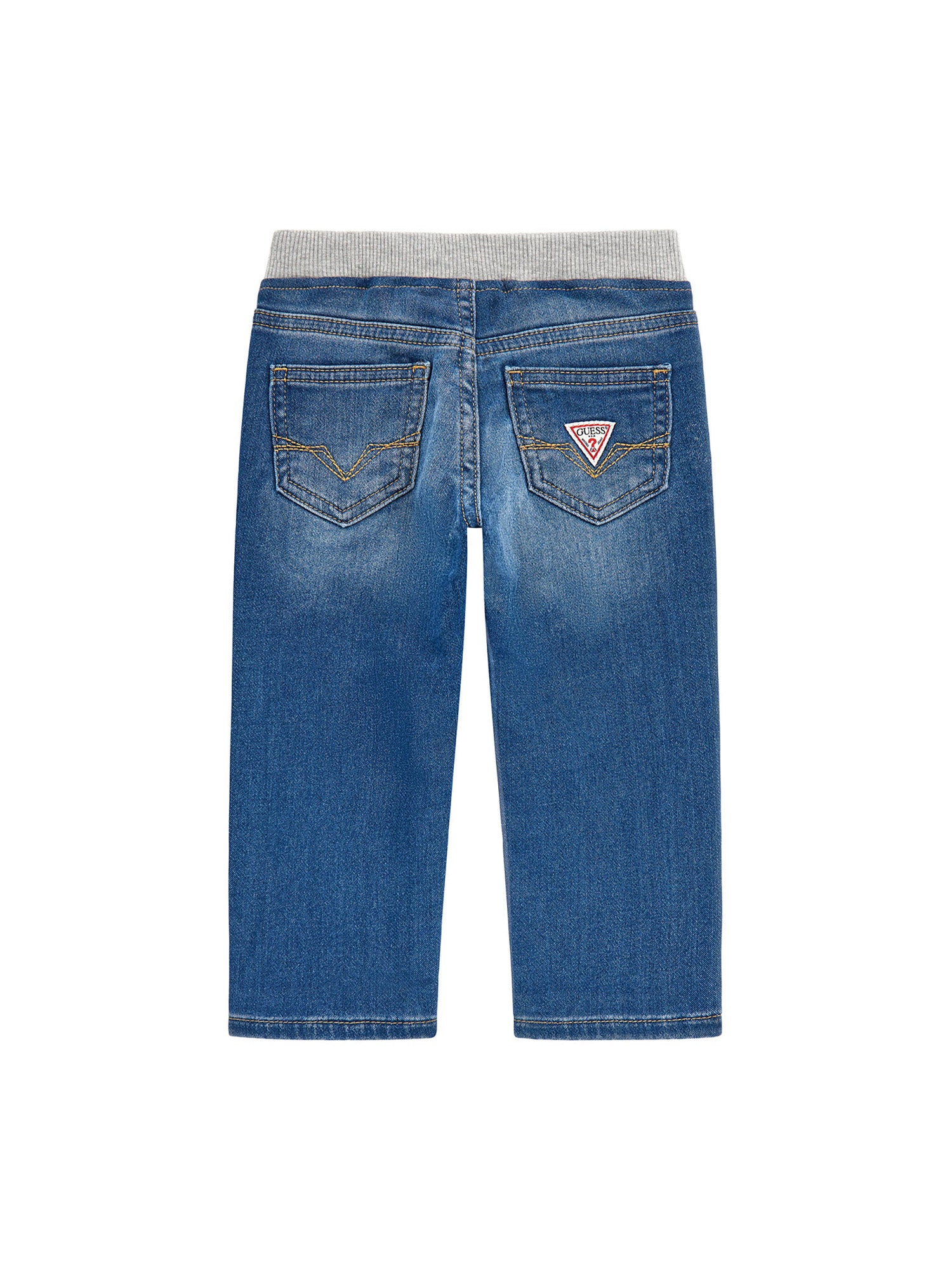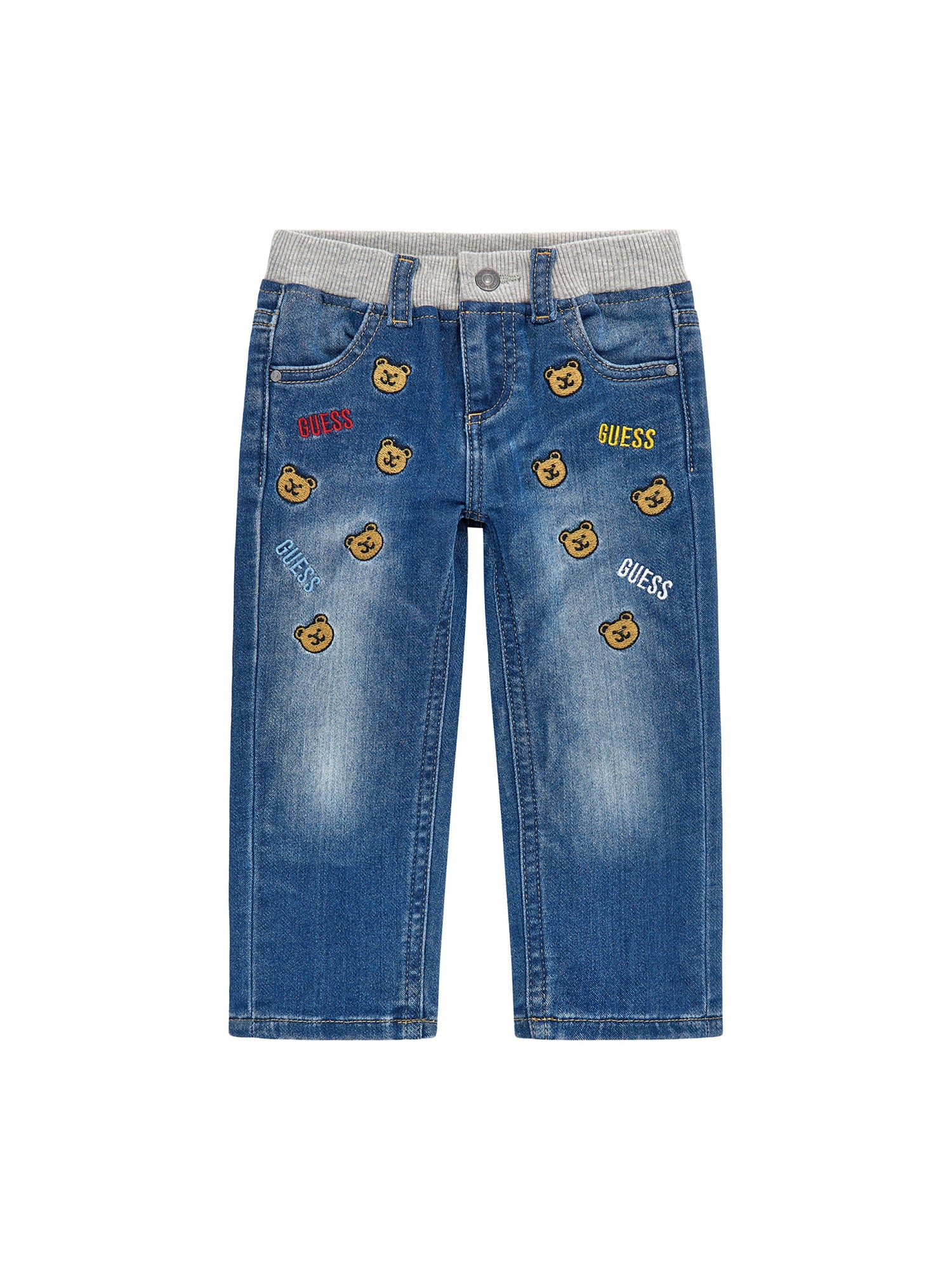 Jeans Guess in misto cotone lavaggio medio, dal carattere giocoso con deliziosi patch frontali teddy che rendono il look sfizioso, smorzato dalla fascia elastica in vita che lo rende comodo e adatto per occasioni più sportive.