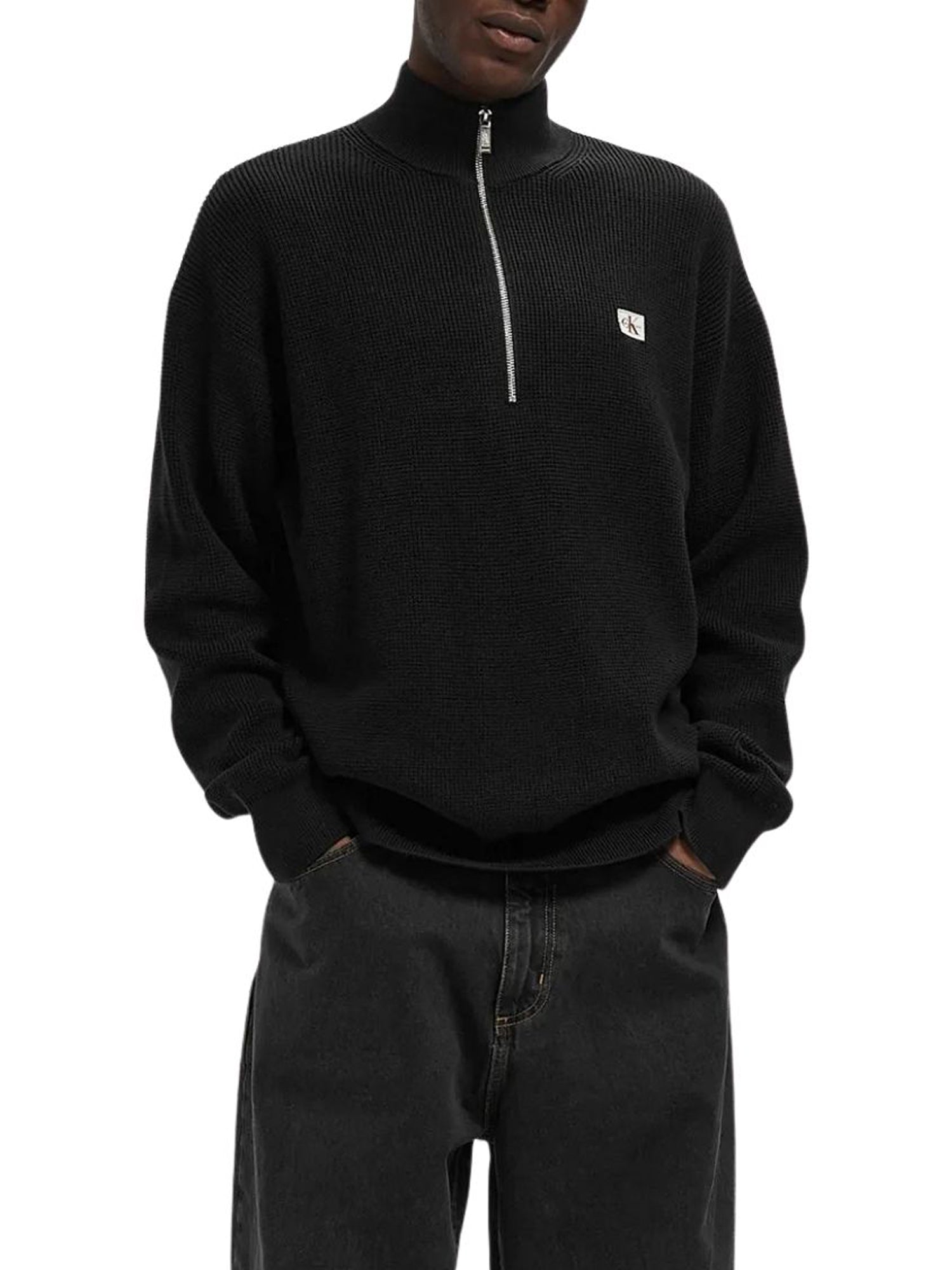 Maglia a lupetto con mezza zip modello cotton waffle nero Maglia a lupetto che unisce design minimalista a un look casual moderno. - 100% cotone - Texture a nido d'ape - Comfort e traspirabilità - Leggerezza e morbidezza - Mezza zip - Logo Calvin Klein sul petto Composizione: 100%cotone