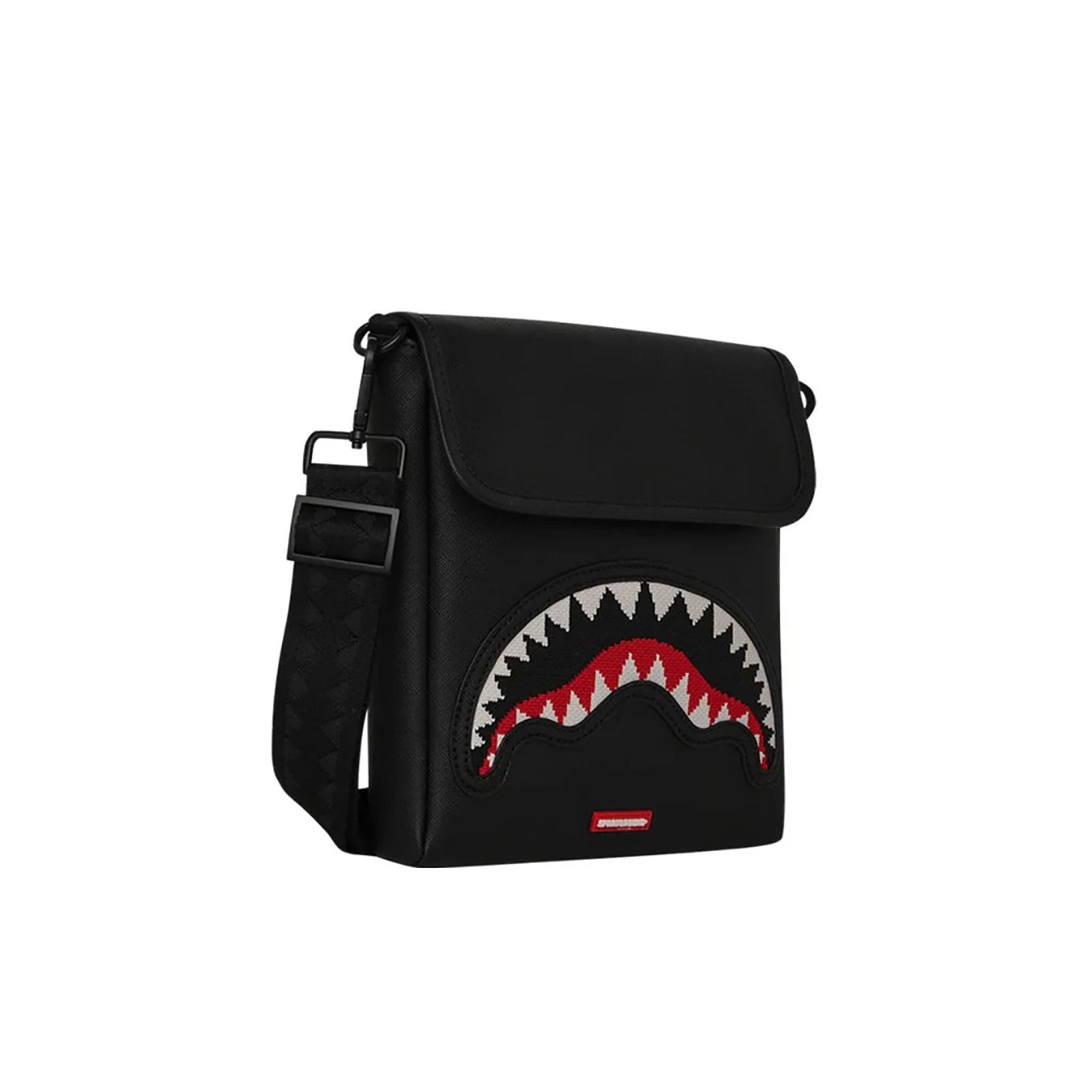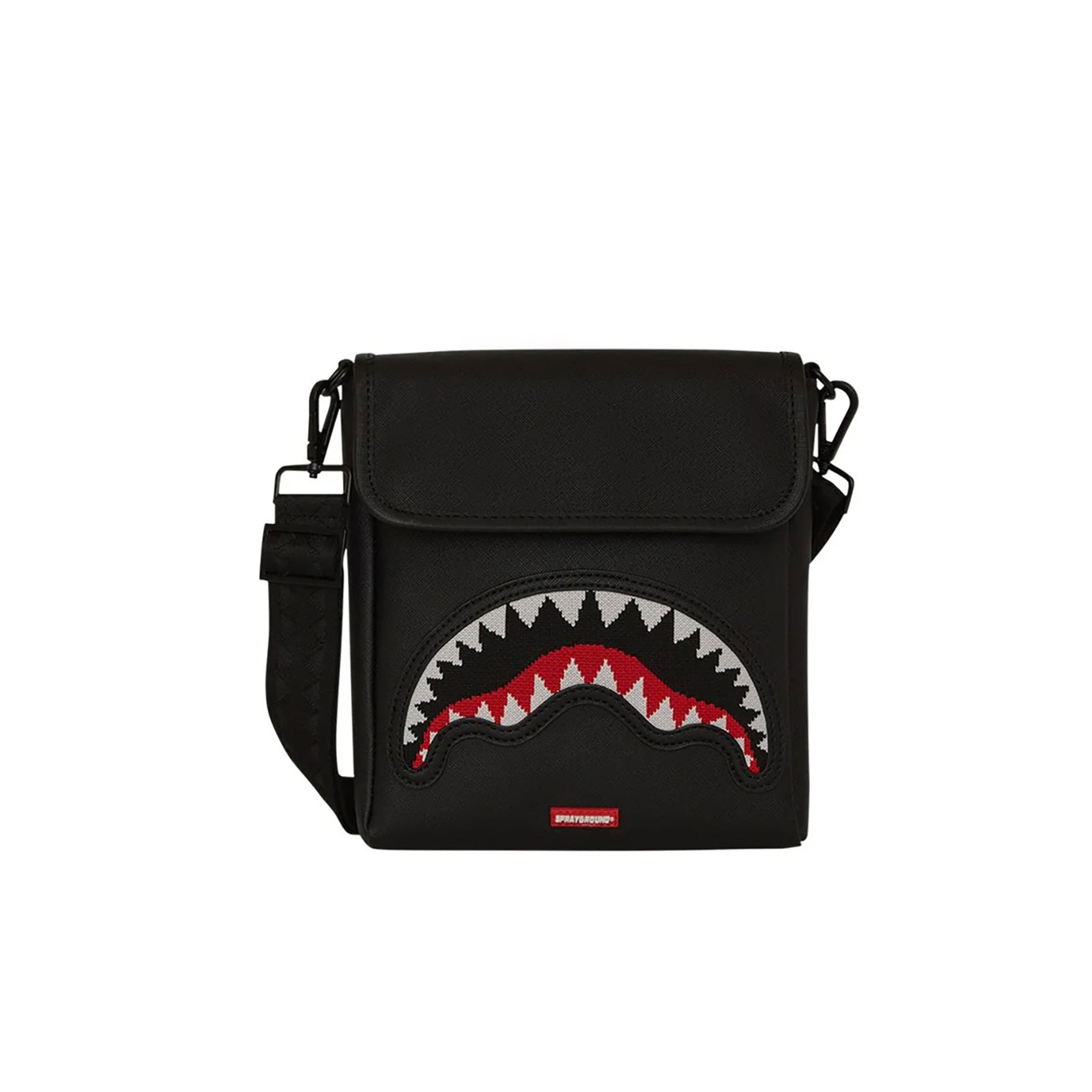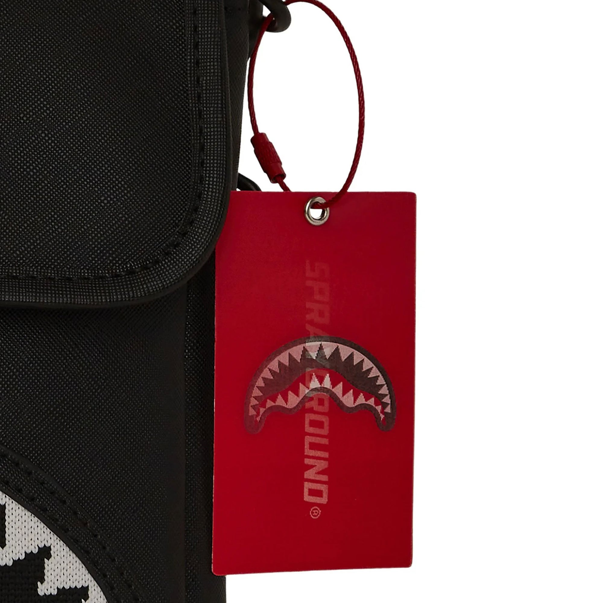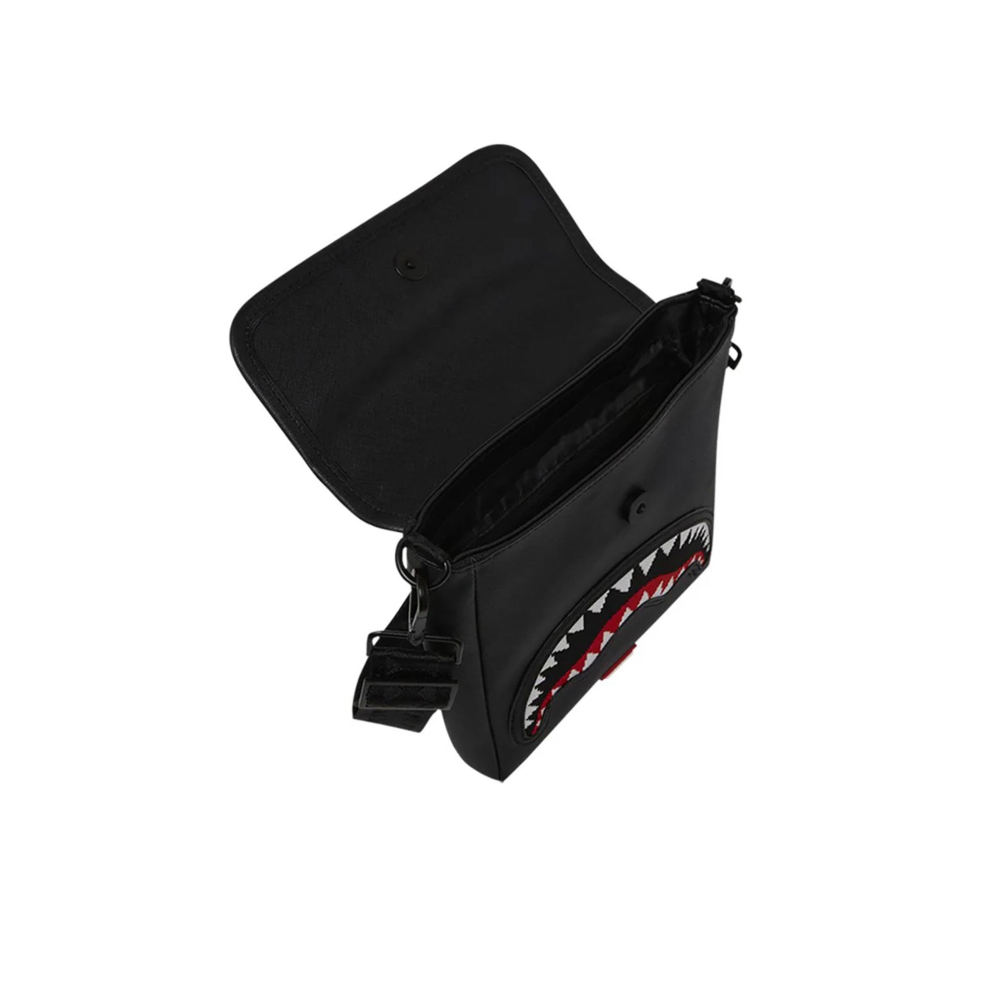 Tracolla Sprayground in ecopelle nera con logo Shark ricamato. Un accessorio dal design compatto e deciso, arricchito dall’iconico motivo squalo sul frontale per uno stile urbano e distintivo.