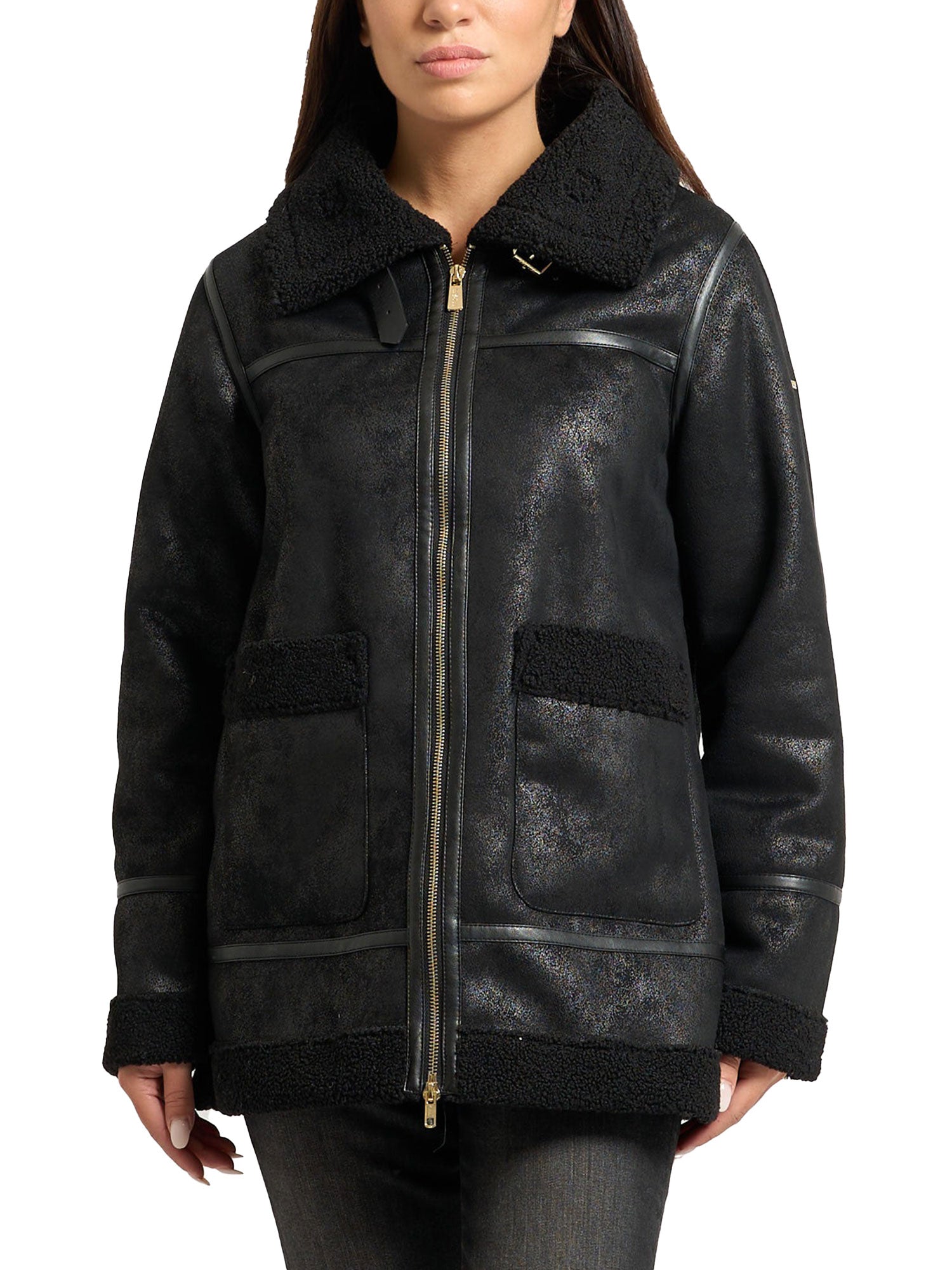 Montone lungo Yes Zee donna Synt inserti in ecopelle e interno pelliccia nero