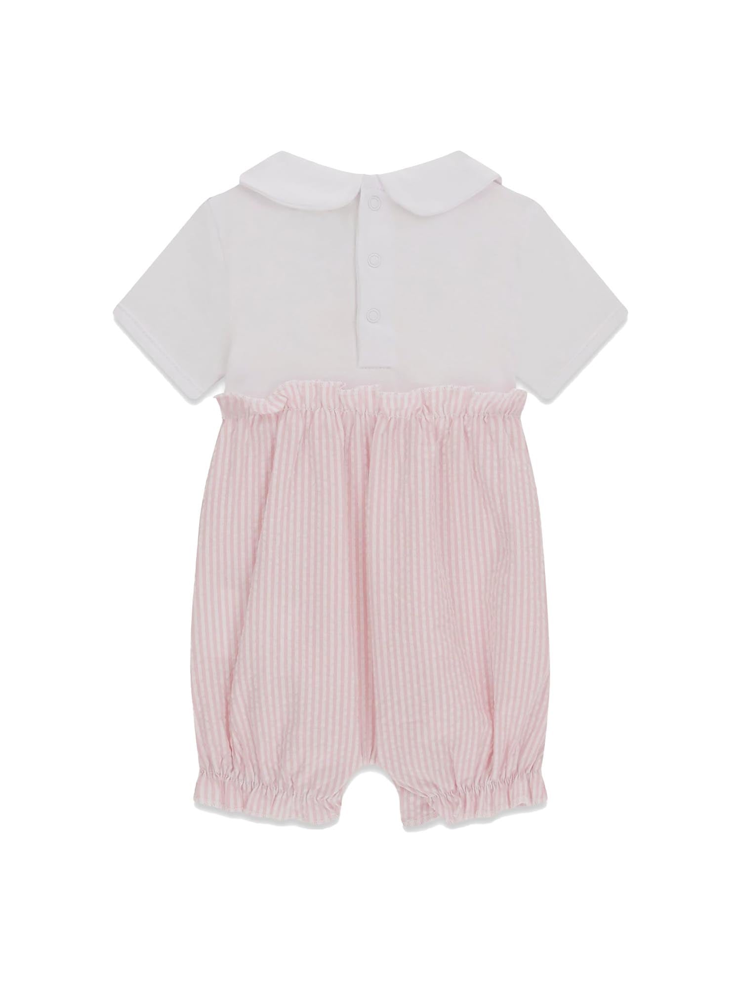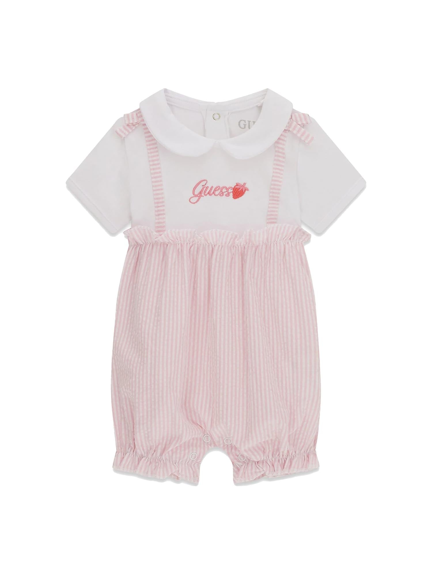 Pagliaccetto Guess neonata con righe e dettagli romantici. Un capo dolce e raffinato, perfetto per un look estivo delicato.
